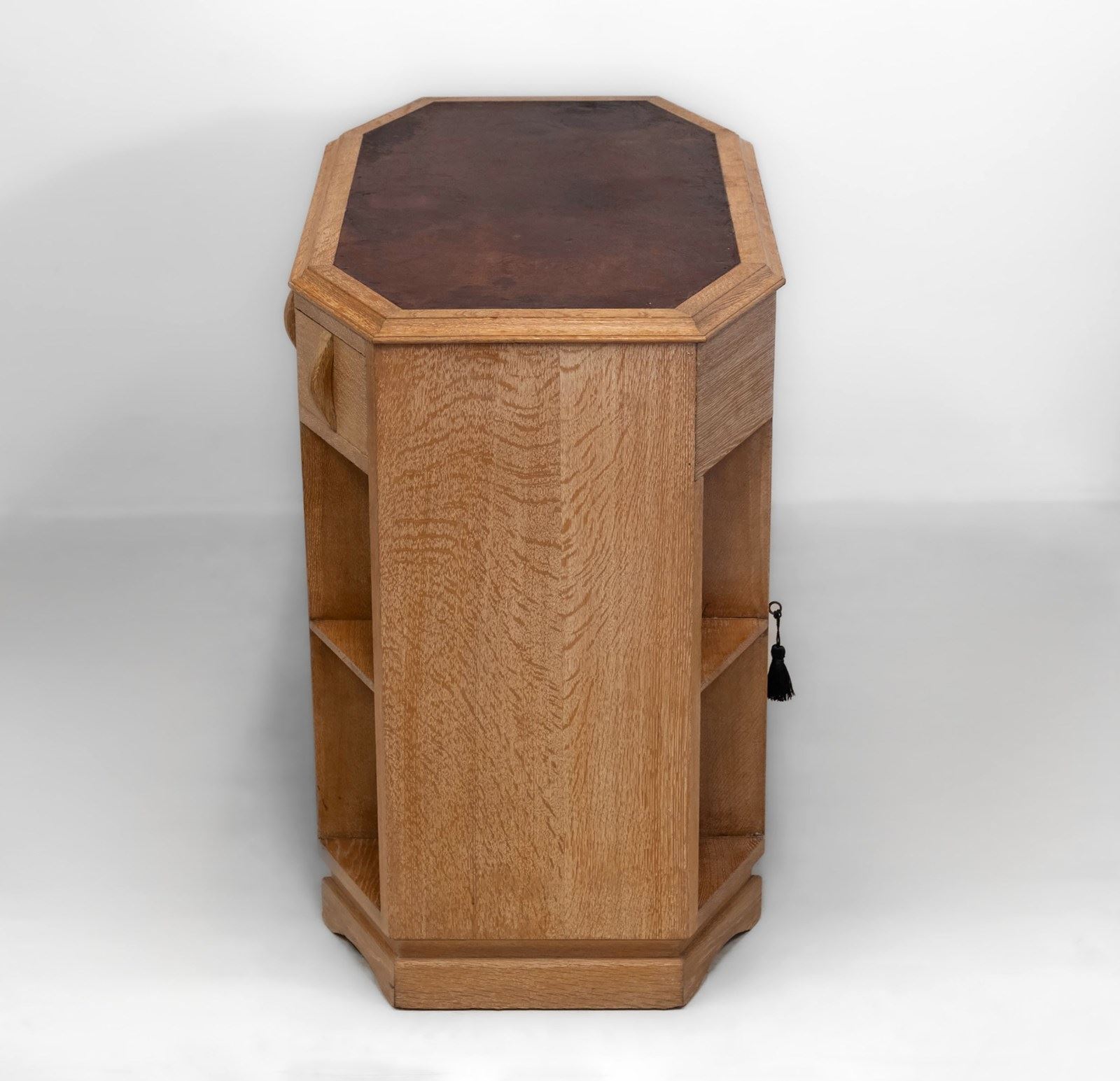 Art Deco Heal's octagonal limed oak writing desk/double sided open bookcase with leather inset top. Labelled. Circa 1930.