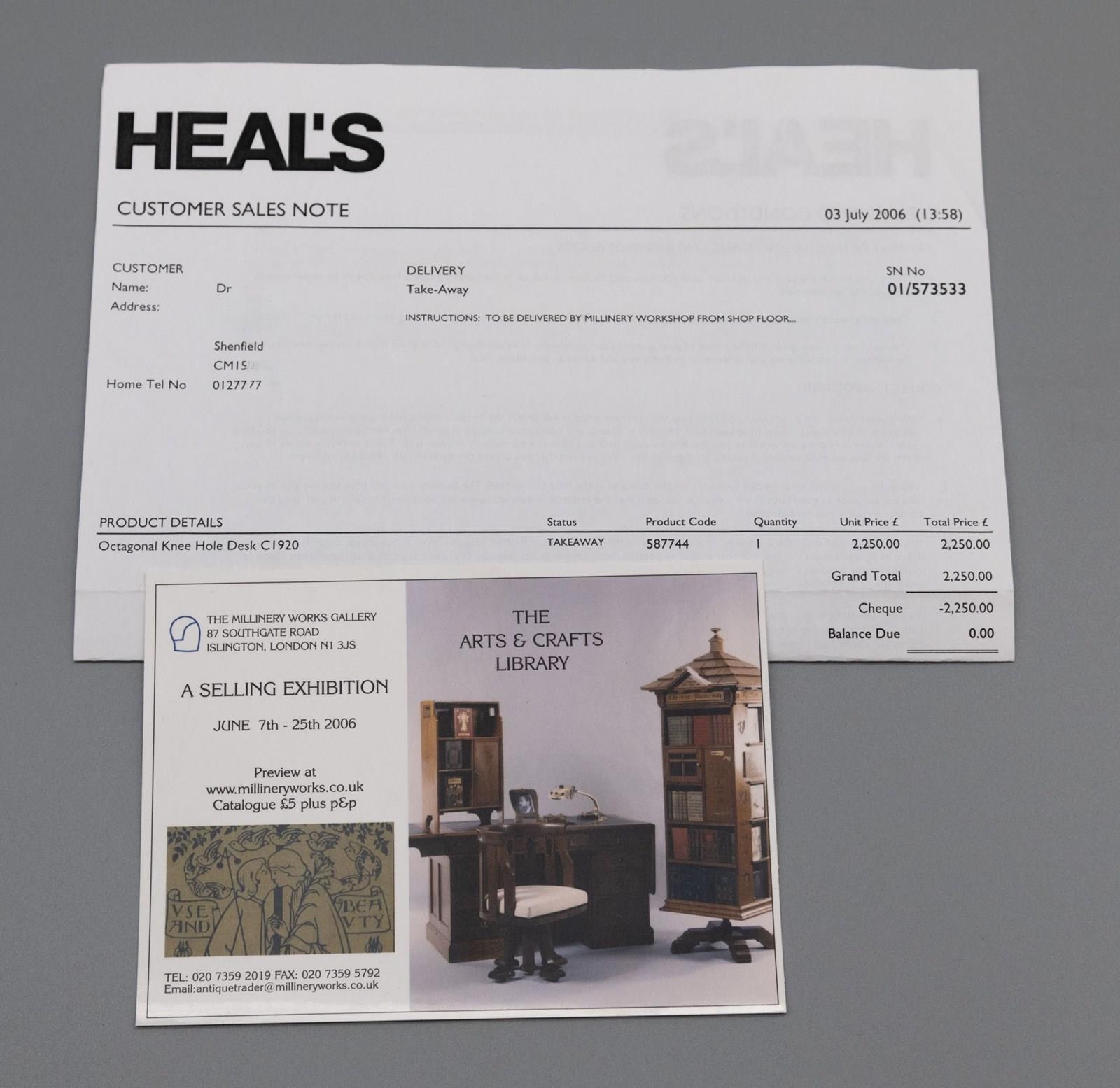 The desk comes with the 2006 receipt from Heal's, along with the Heal's exhibition booklet that it was featured in - 'The Arts & Crafts Library - A Selling Exhibition'.