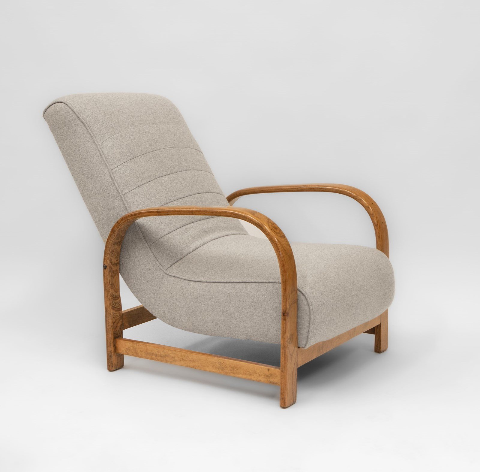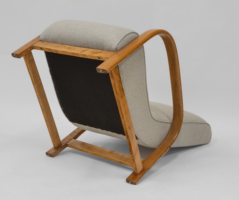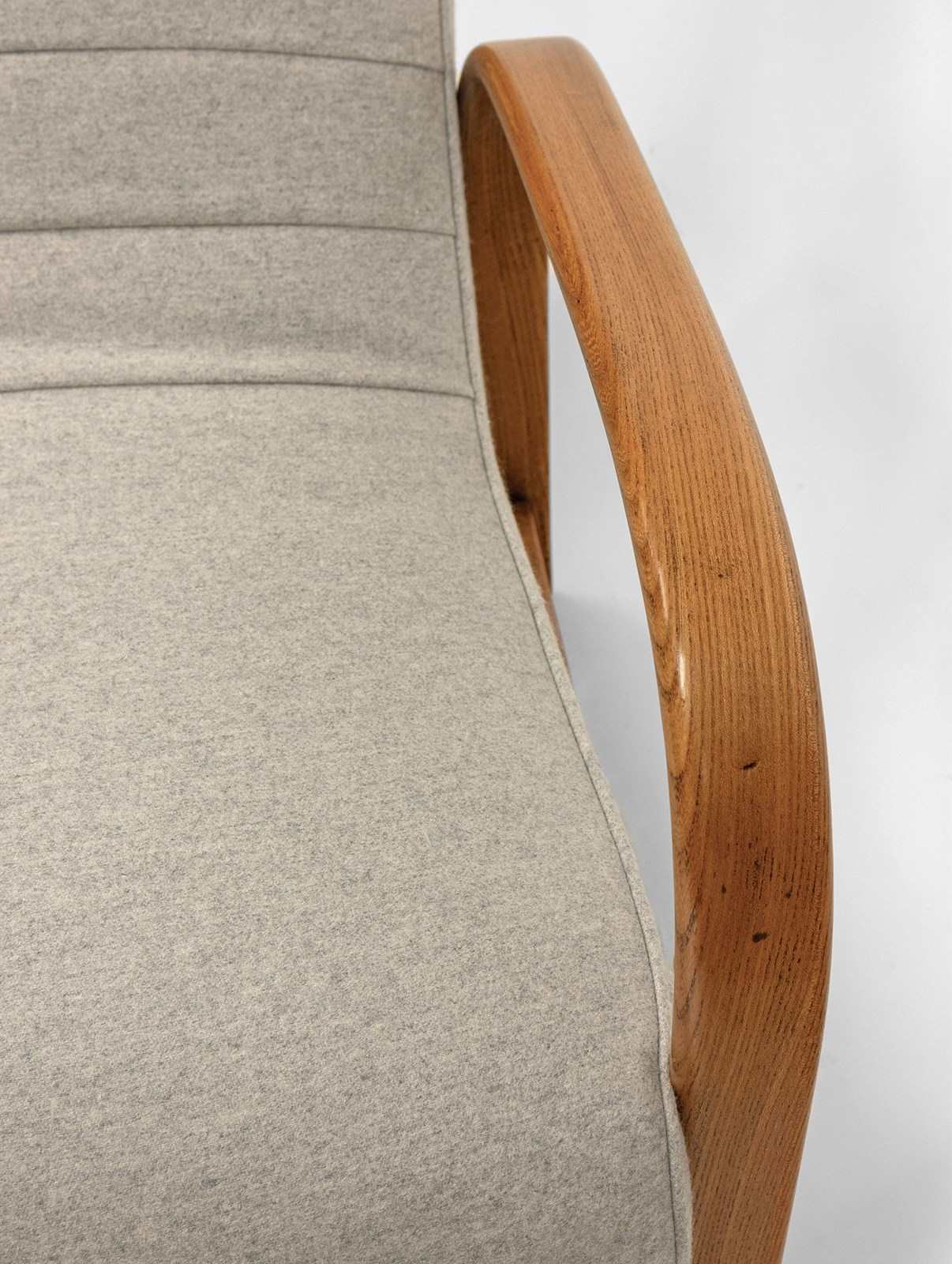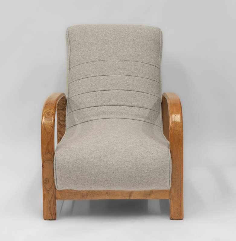 A stylish Art Deco elm bentwood and beechwood framed lounge chair with Bute light grey wool upholstery. Circa 1930's.