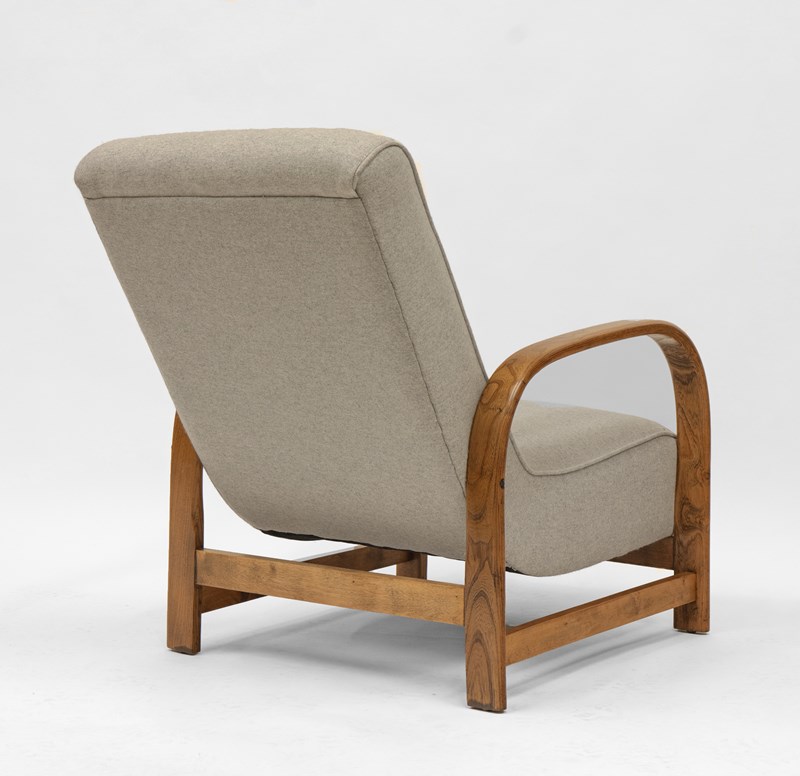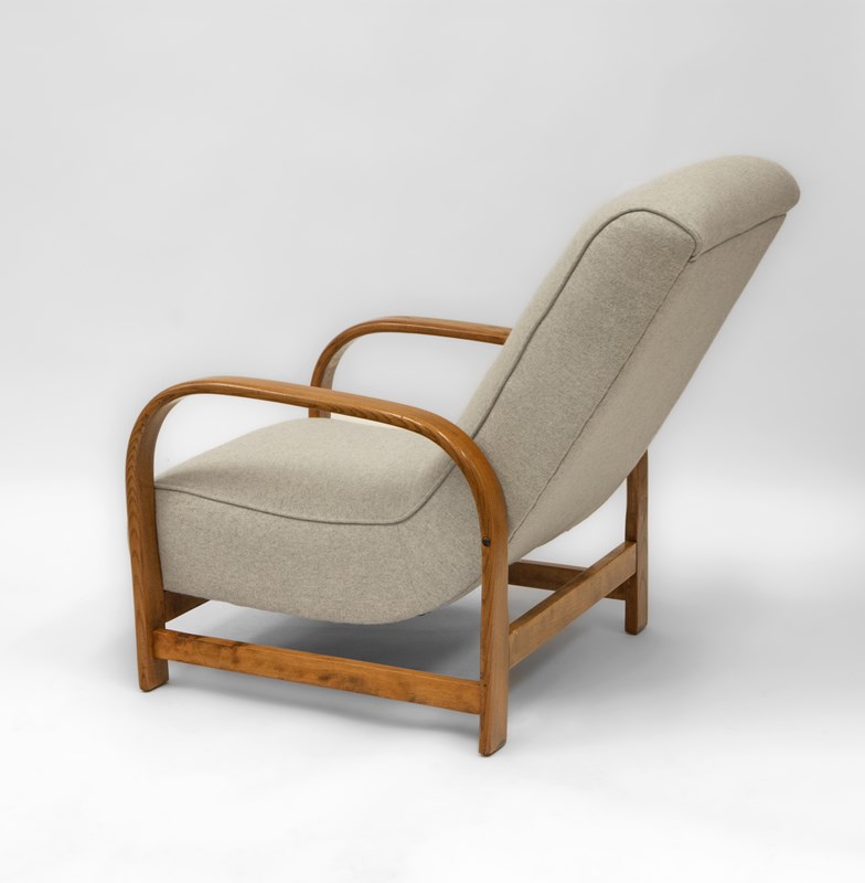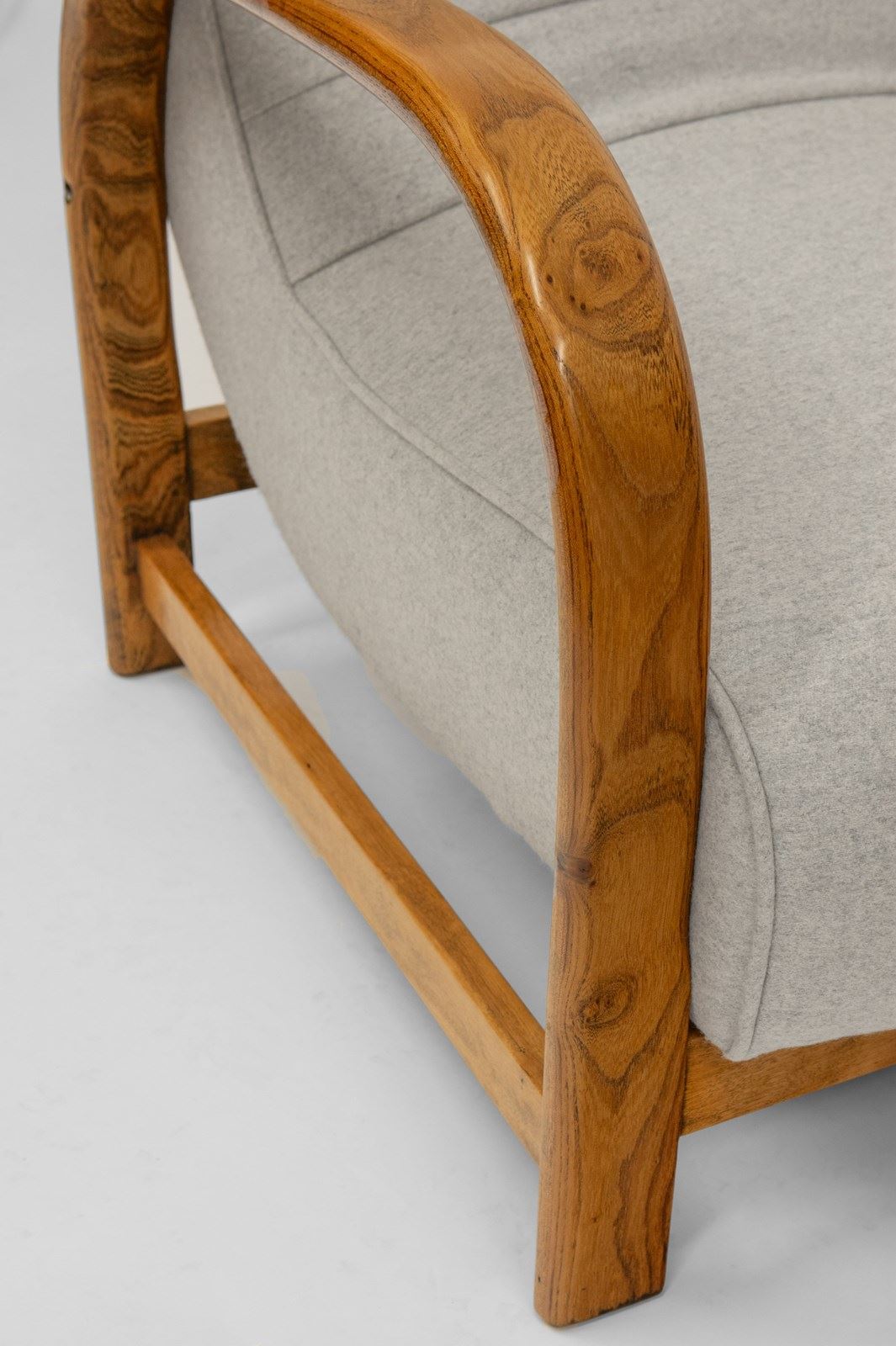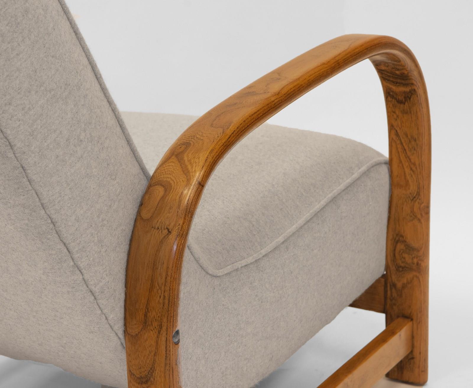 A stylish Art Deco elm bentwood and beechwood framed lounge chair with Bute light grey wool upholstery. Circa 1930's.