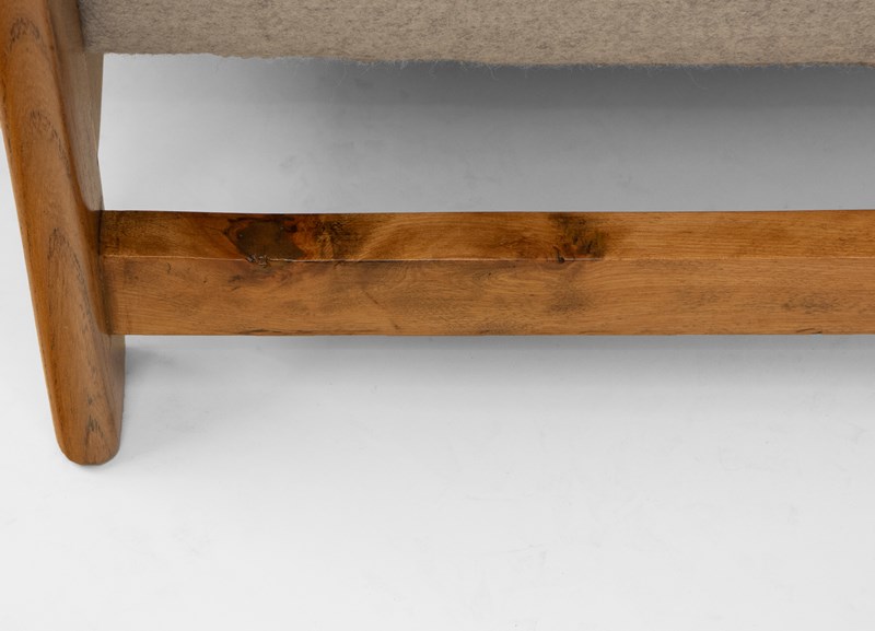 The chair has been reupholstered in a light grey wool by Bute fabrics, Isle of Bute, Scotland. (70% Wool, 25% Polyamide, 5% other fibres. All fibres from recycled source) The chair is very comfortable, and is sturdy with no loose joints.