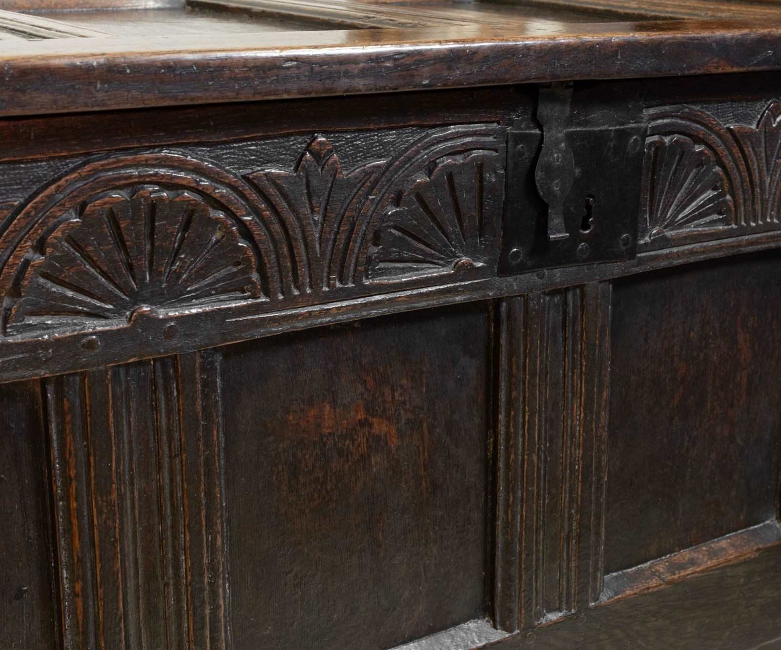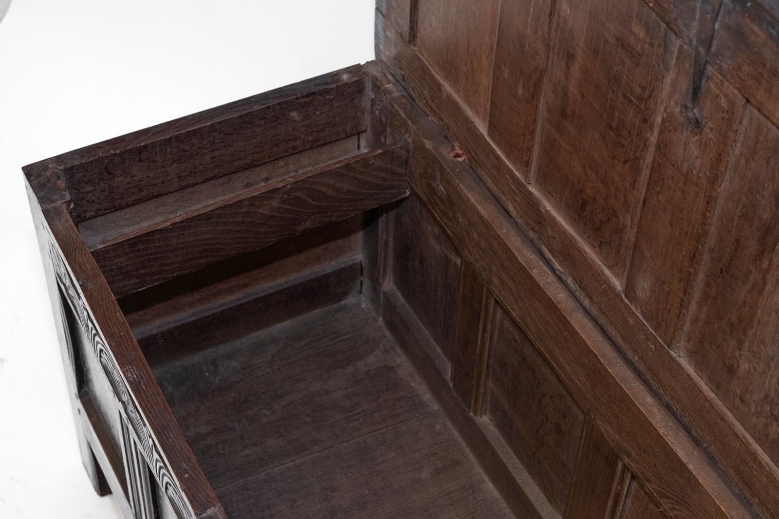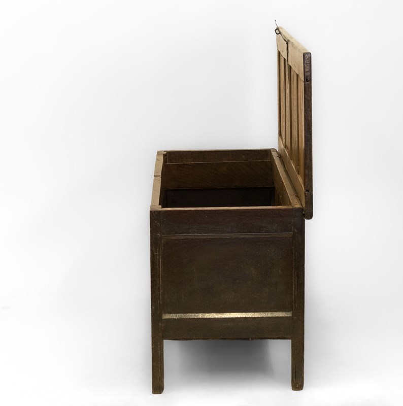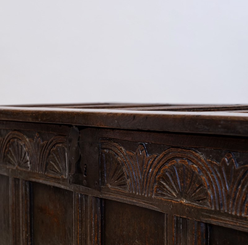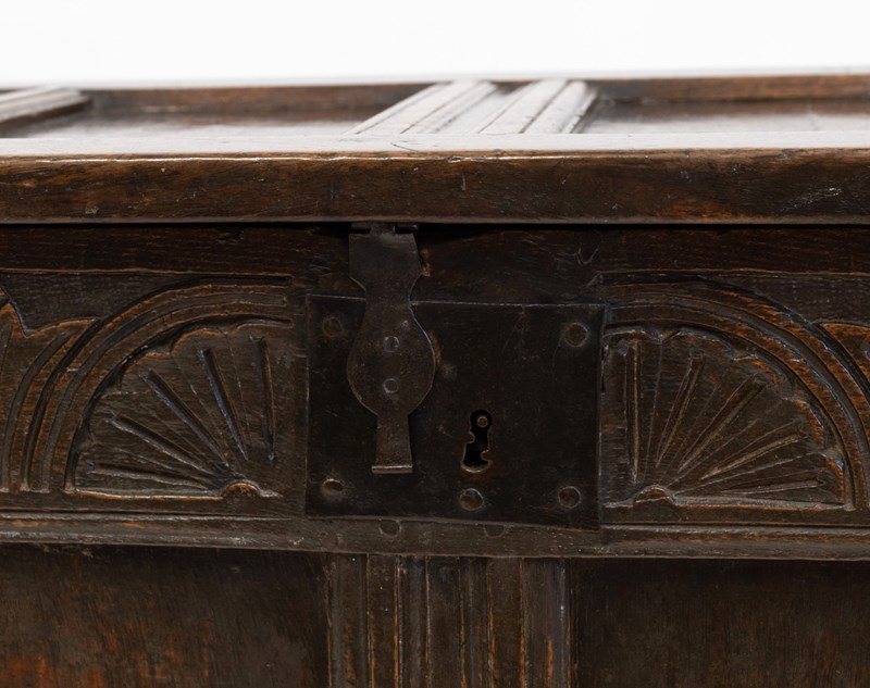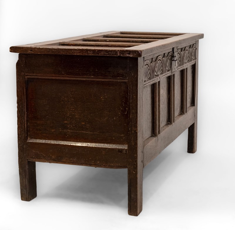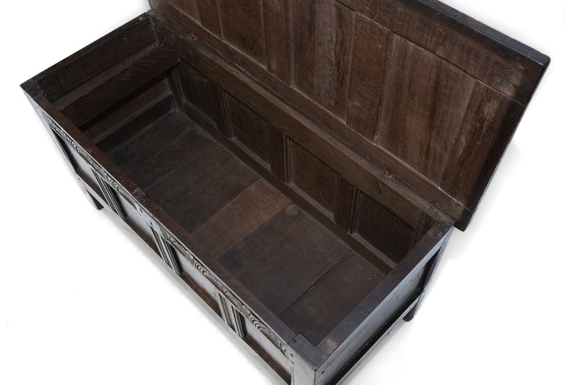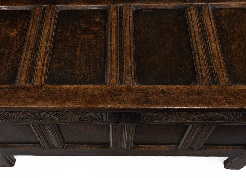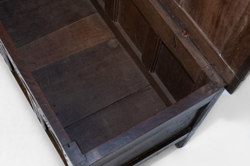 Minimal traces of historic woodworm present to each side panel. These have been treated as a precaution and filled. The coffer has no loose joints and is very sturdy. There are two hairlines to the top panels to note.