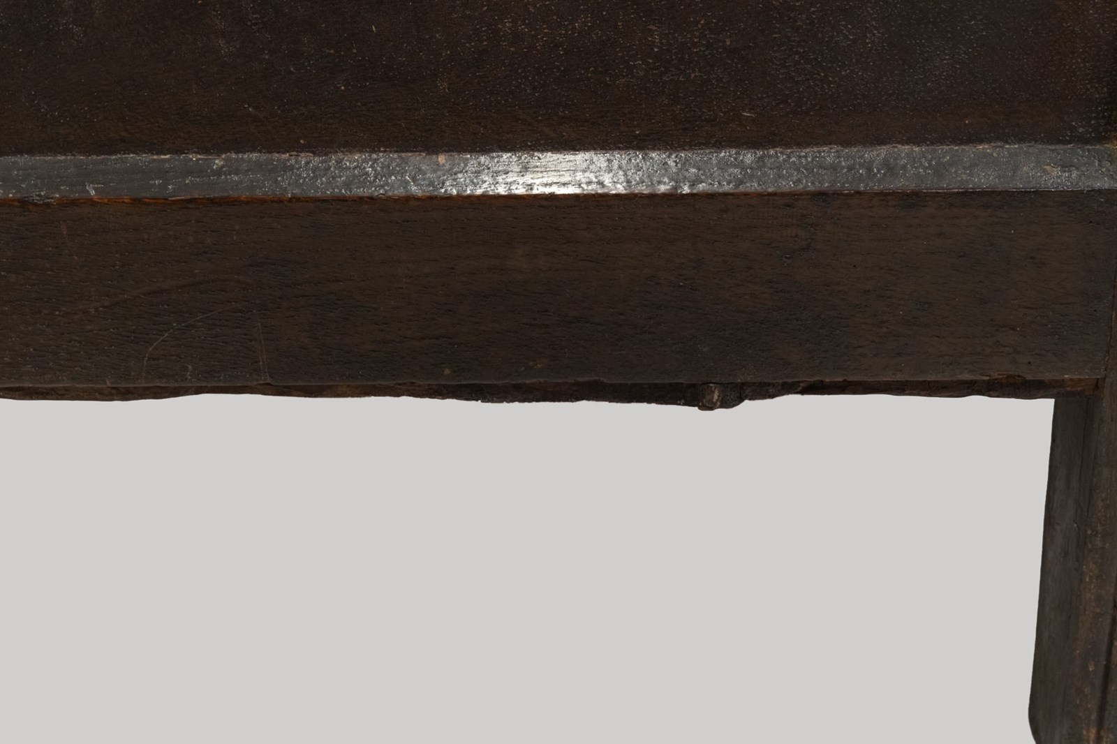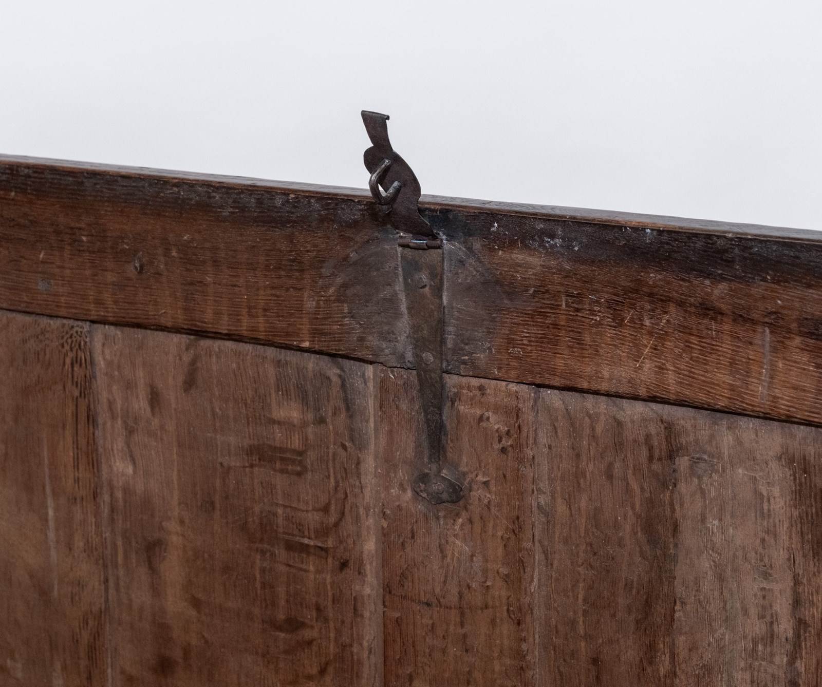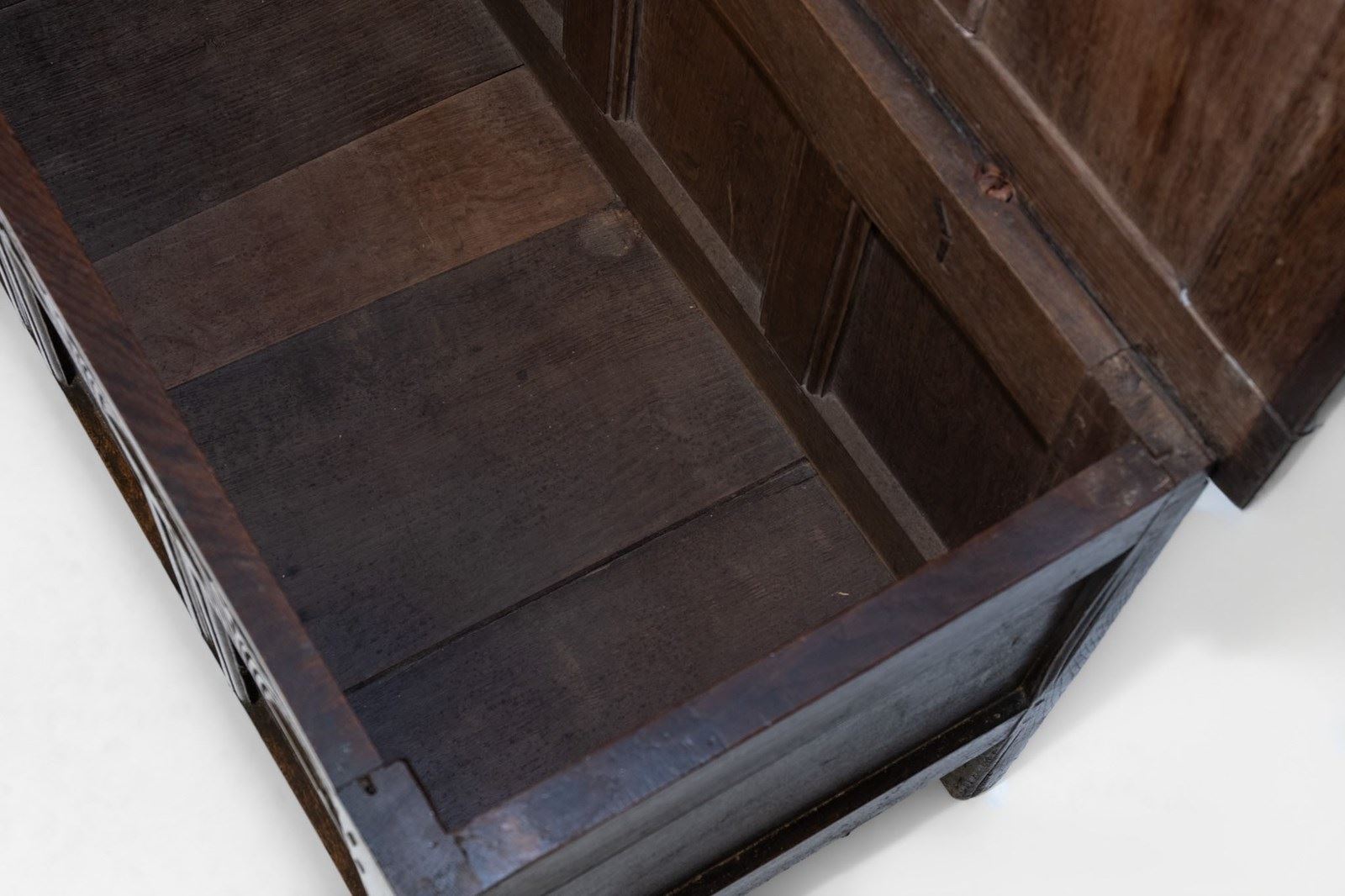 The lid is mounted on the original hand‑forged iron loop hinges. The interior's till box, used to store candles or documents, is missing its lid.
