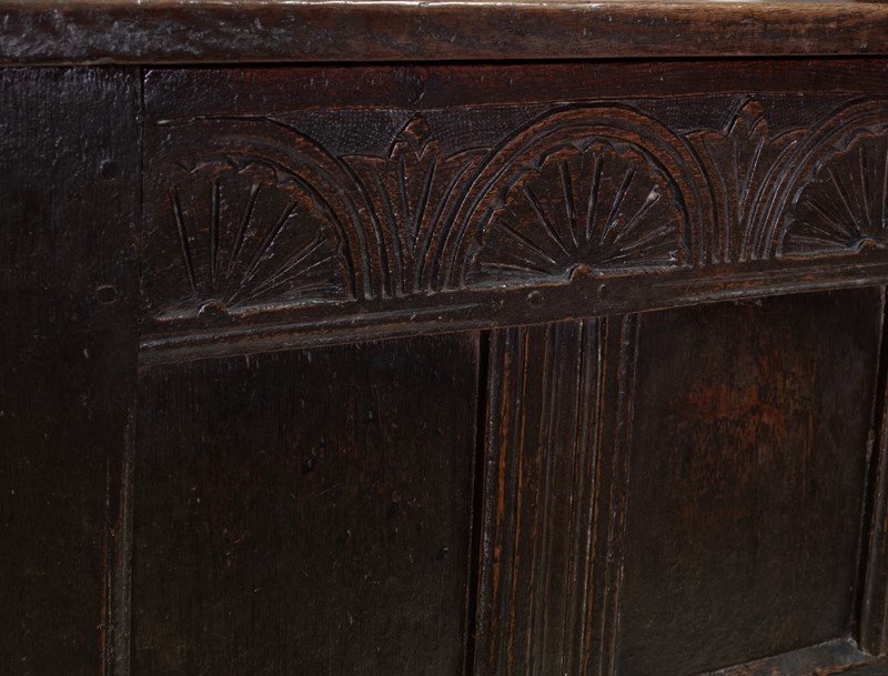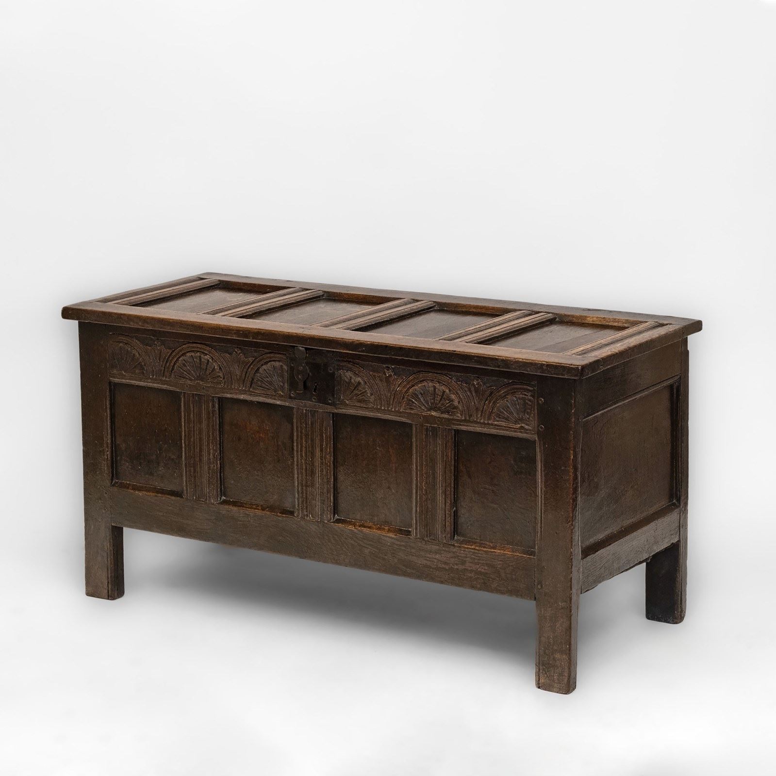 The coffer having a four panel front, framed in moulded rails, with lunette carved frieze. Standing solidly on stile legs.