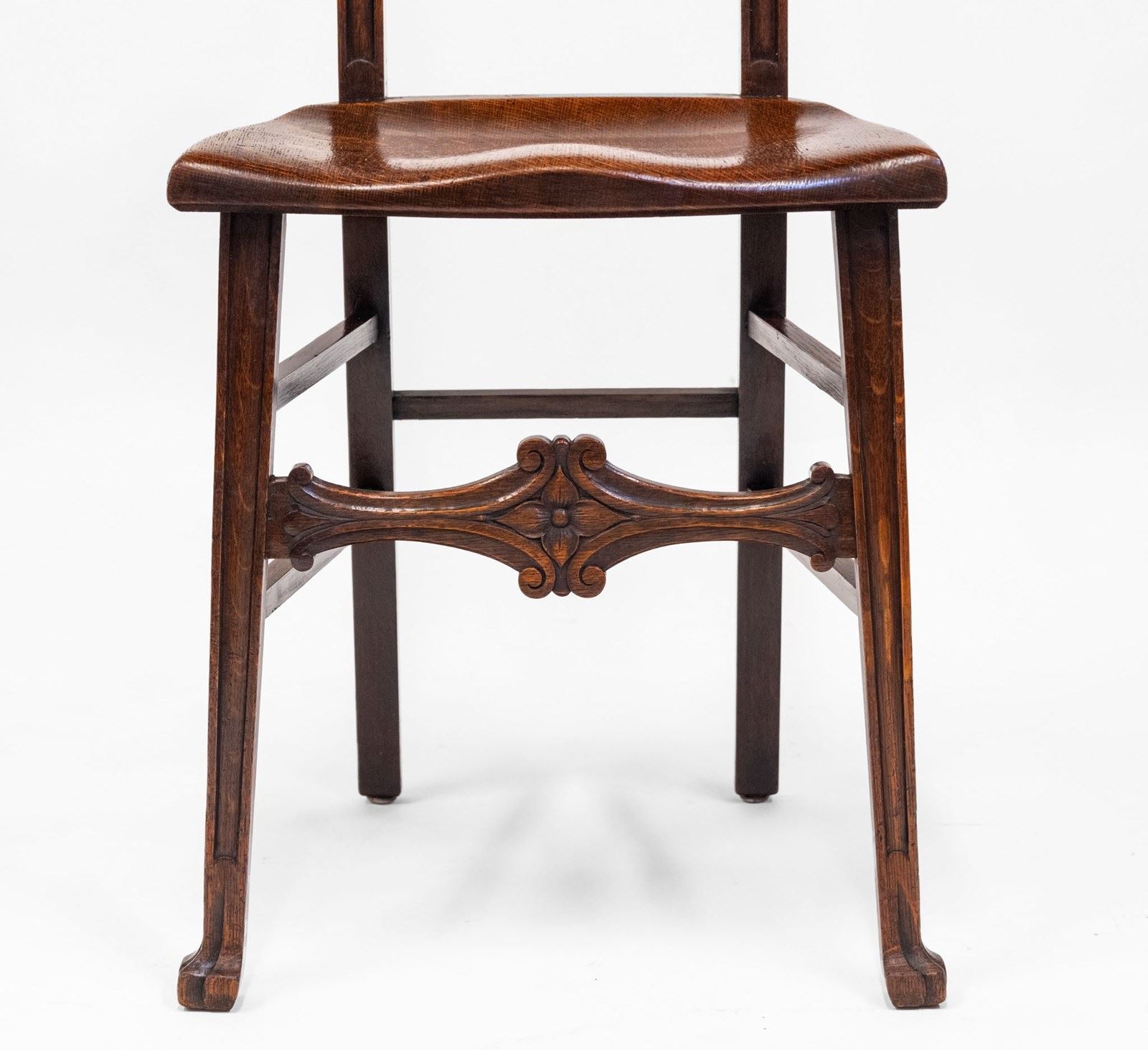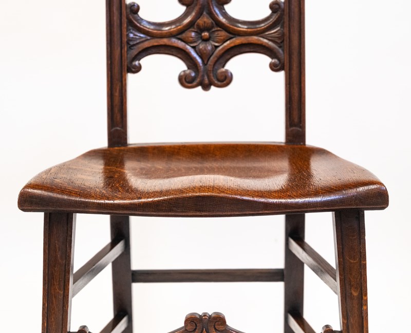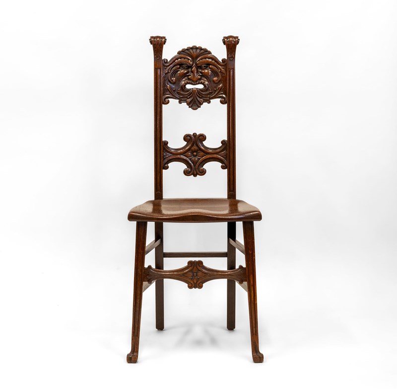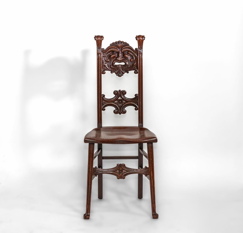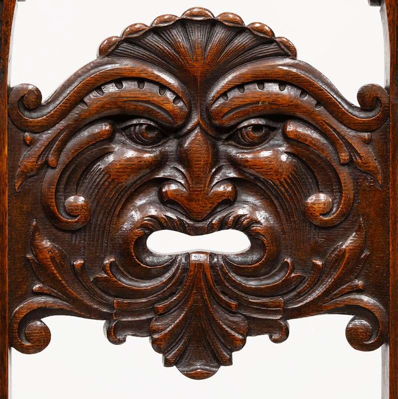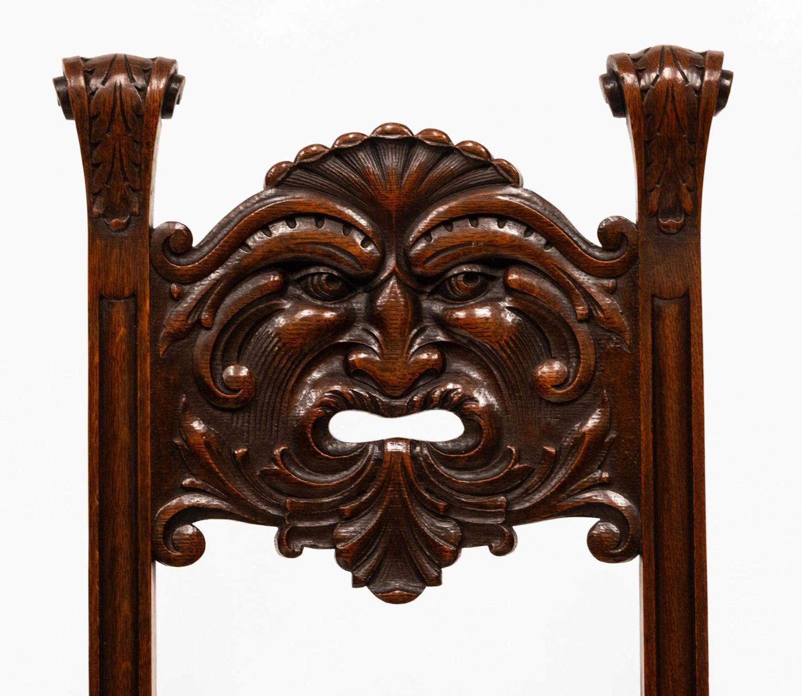 This chair embodies the Edwardian fascination with medieval imagery and nature symbolism. The Green Man — a timeless emblem of renewal and protection — is rendered here with uncommon skill, making the piece especially desirable for collectors of English oak, Arts & Crafts, or Gothic Revival furnishings.