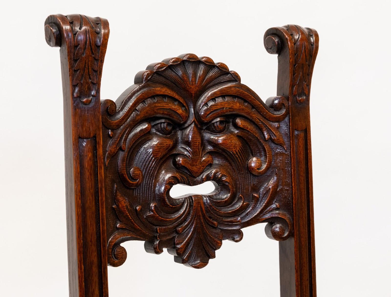 Charming Edwardian English Oak Side Chair With Carved Green Man