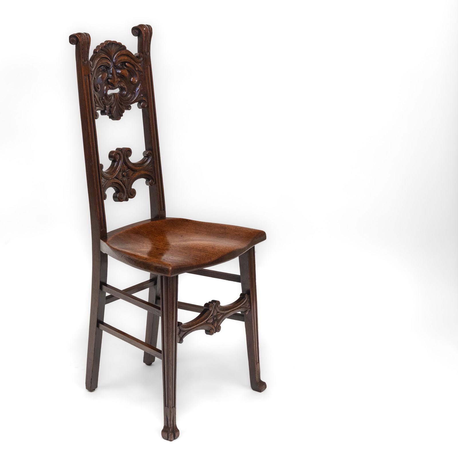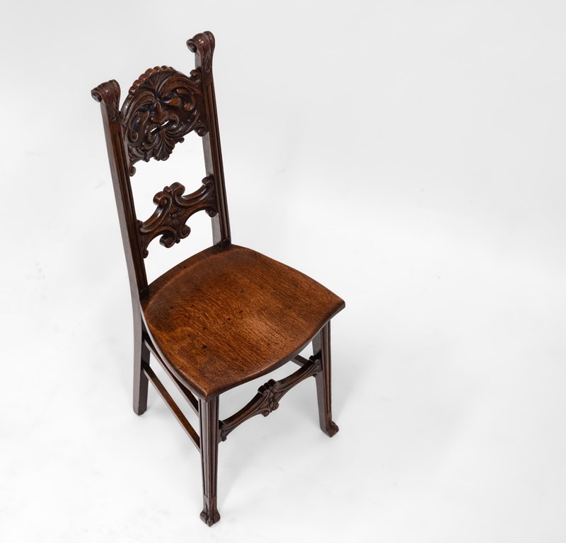 A petite chair with refined proportion showcasing a bold finely hand-carved Green Man with foliate detail and scrolled back acanthus leaf uprights. With a beautifully shaped seat, the chair stands on tapering front legs.