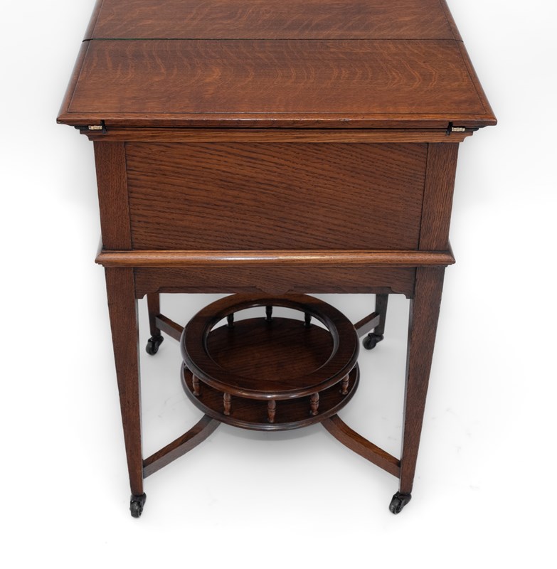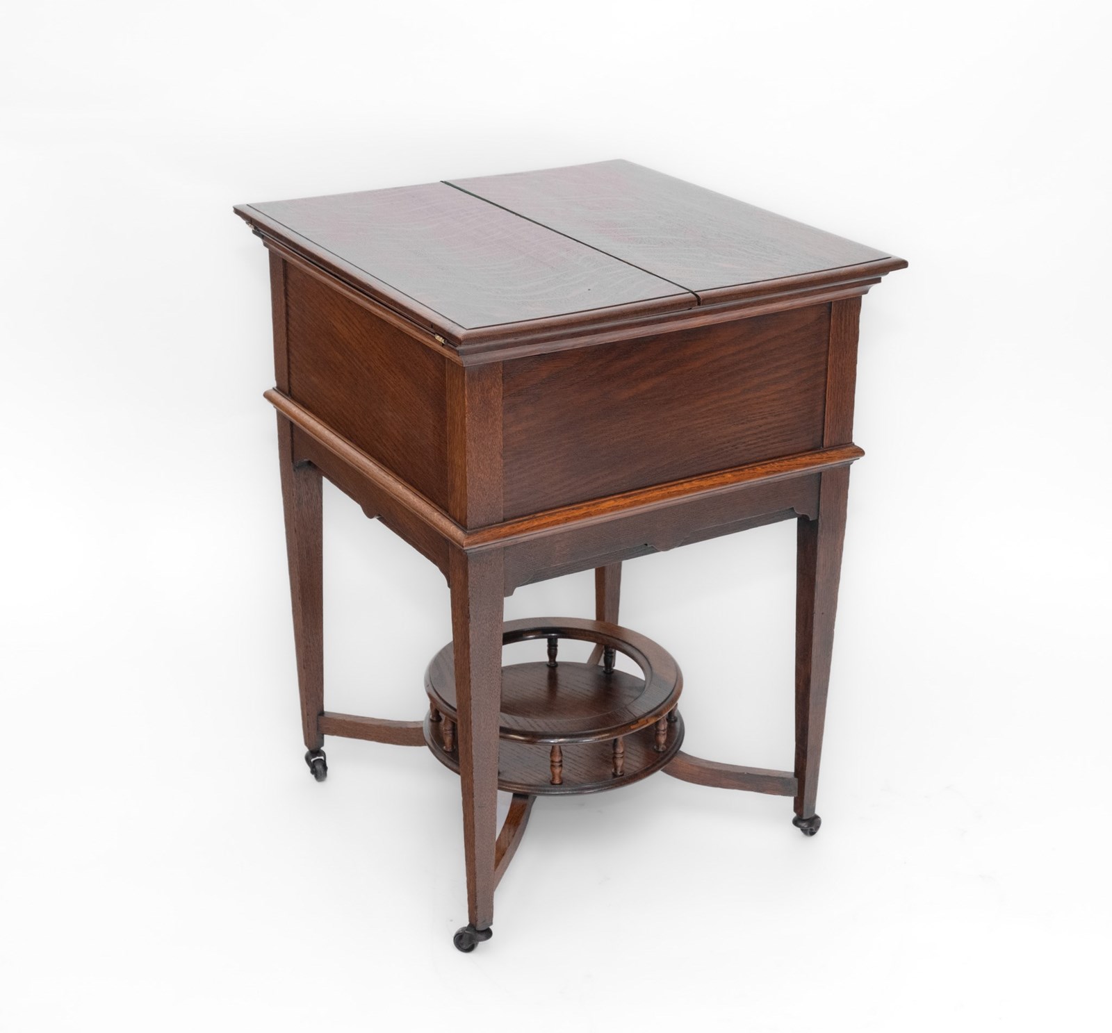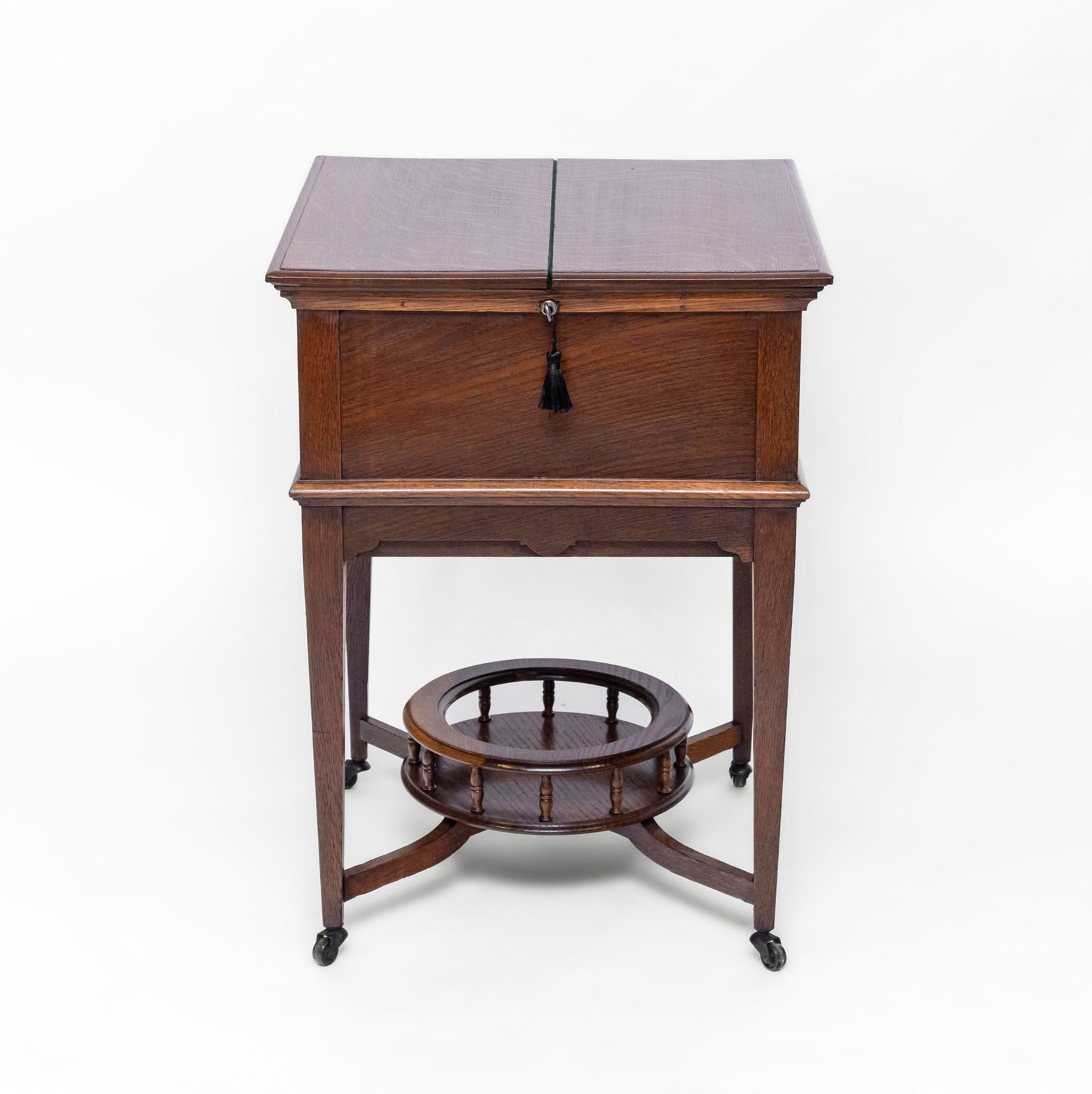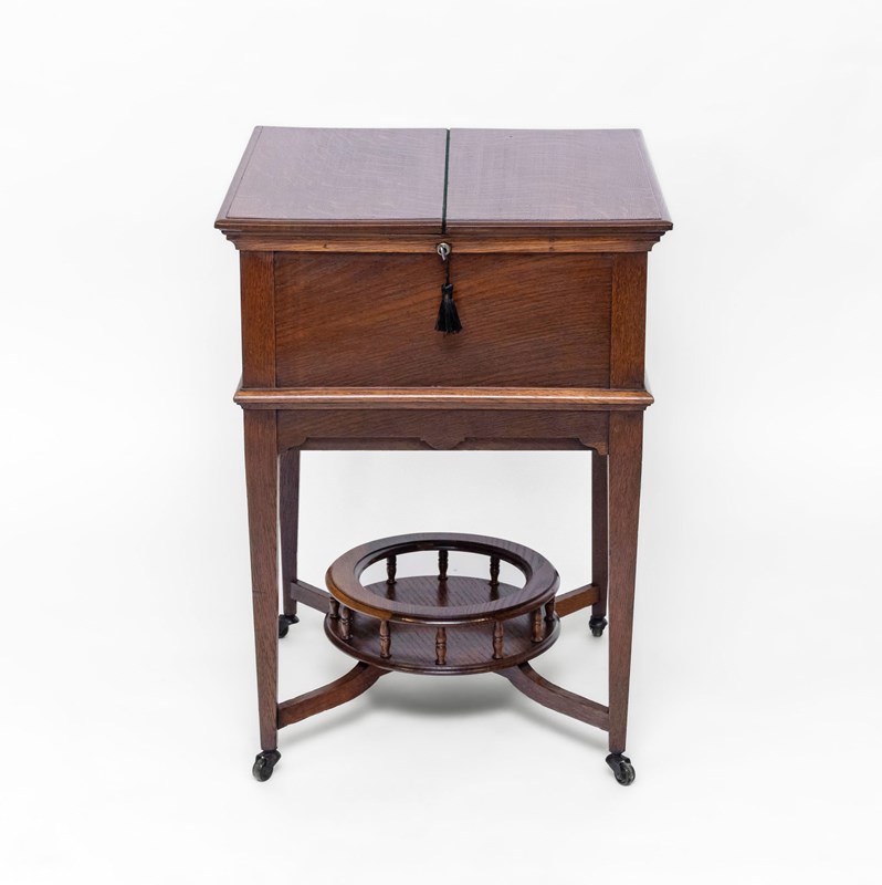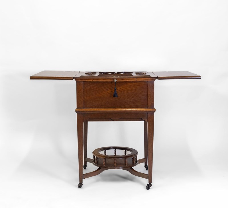 Made in solid oak throughout, the cabinet is of square form and stands on tapering legs with castors, united by a galleried central platform.