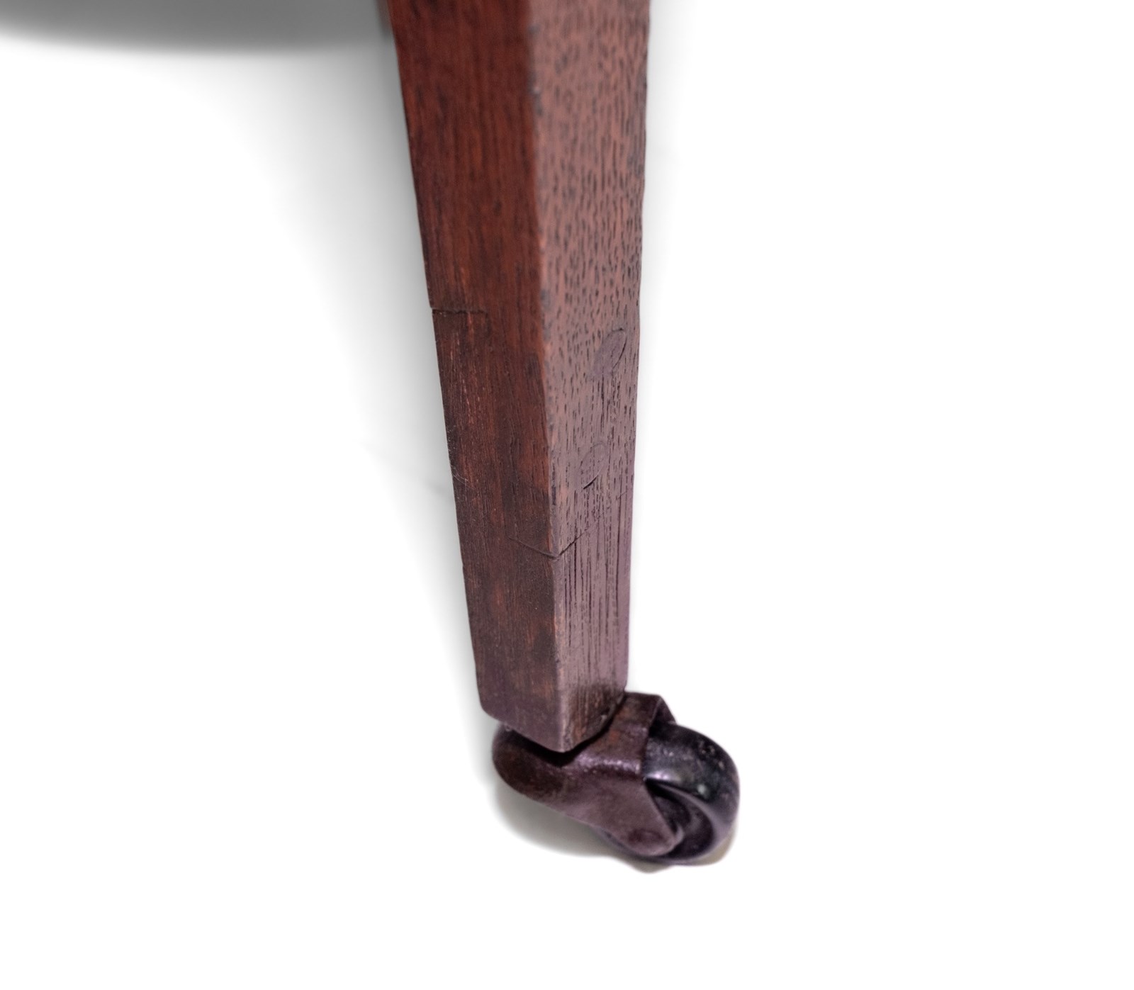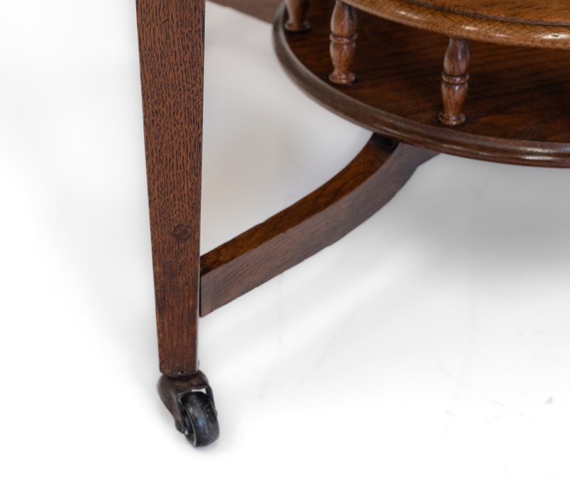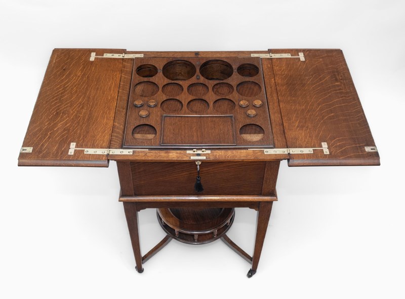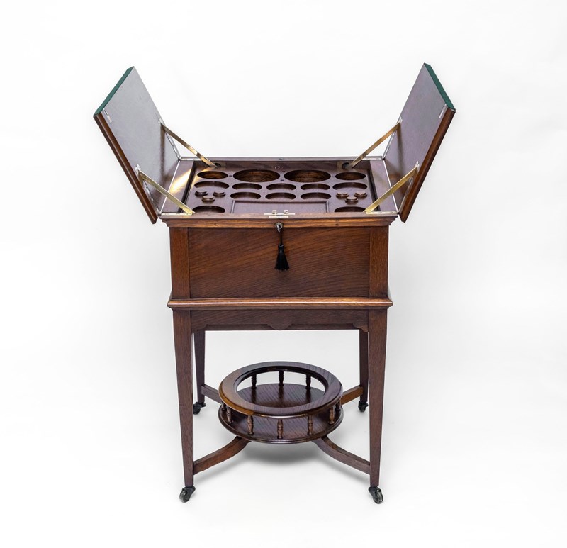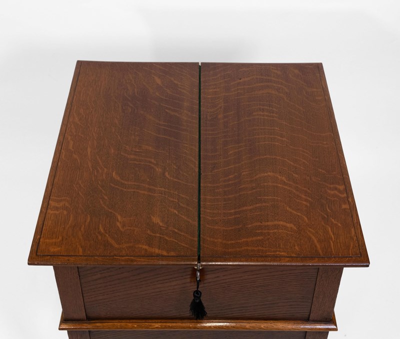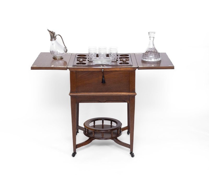 Made in solid oak throughout, the cabinet is of square form and stands on tapering legs with castors, united by a galleried central platform.