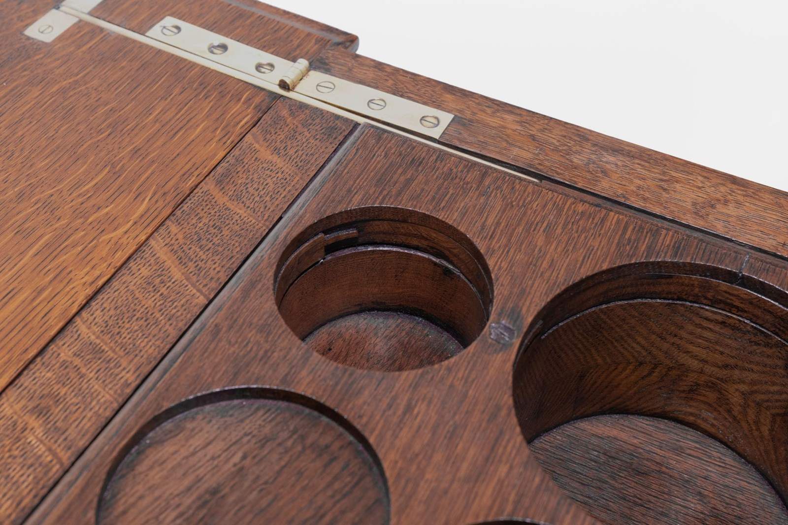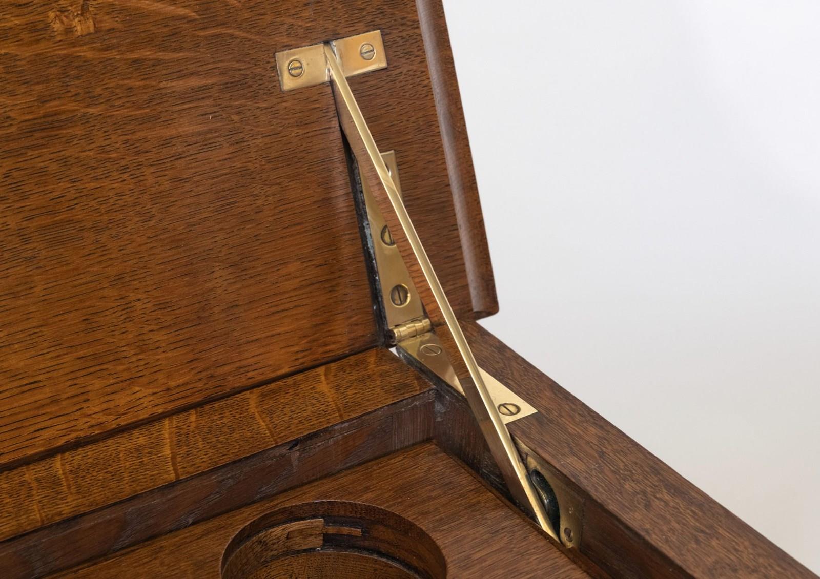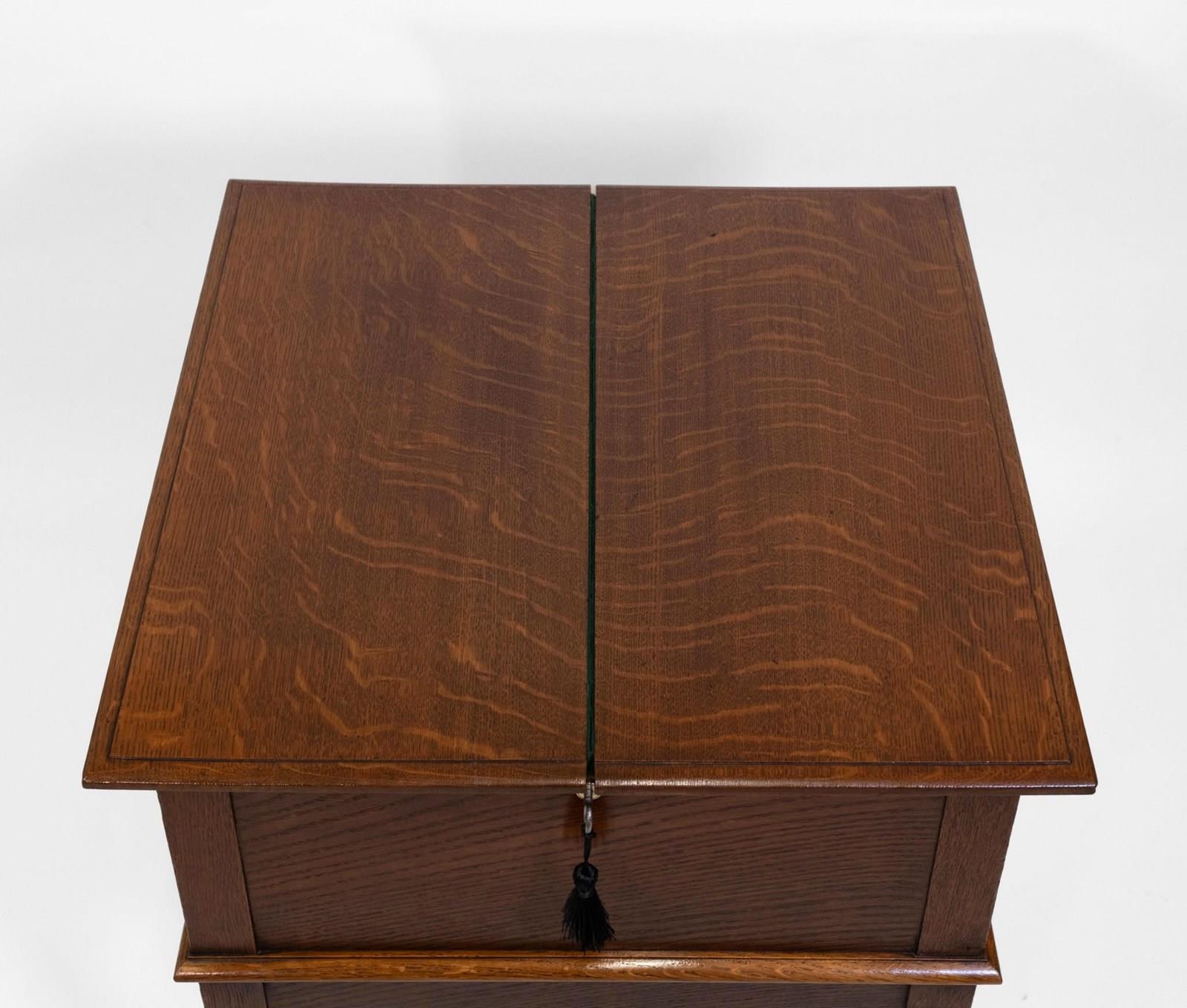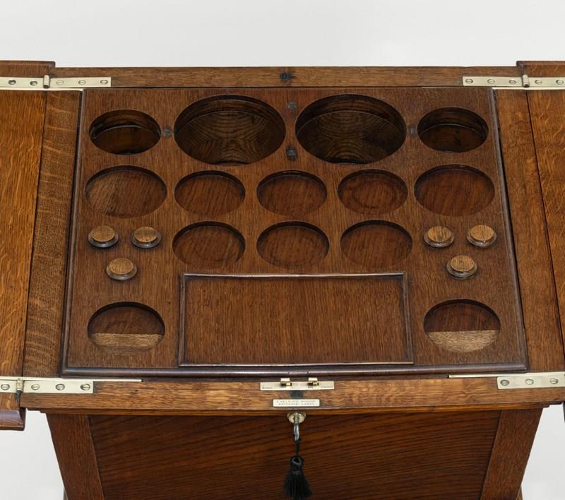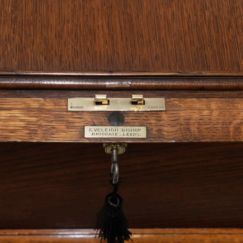 Fabulous Edwardian oak metamorphic rise & fall drinks cabinet bar by Eveleigh Bishop, Leeds. Bramah lock. Circa 1900.