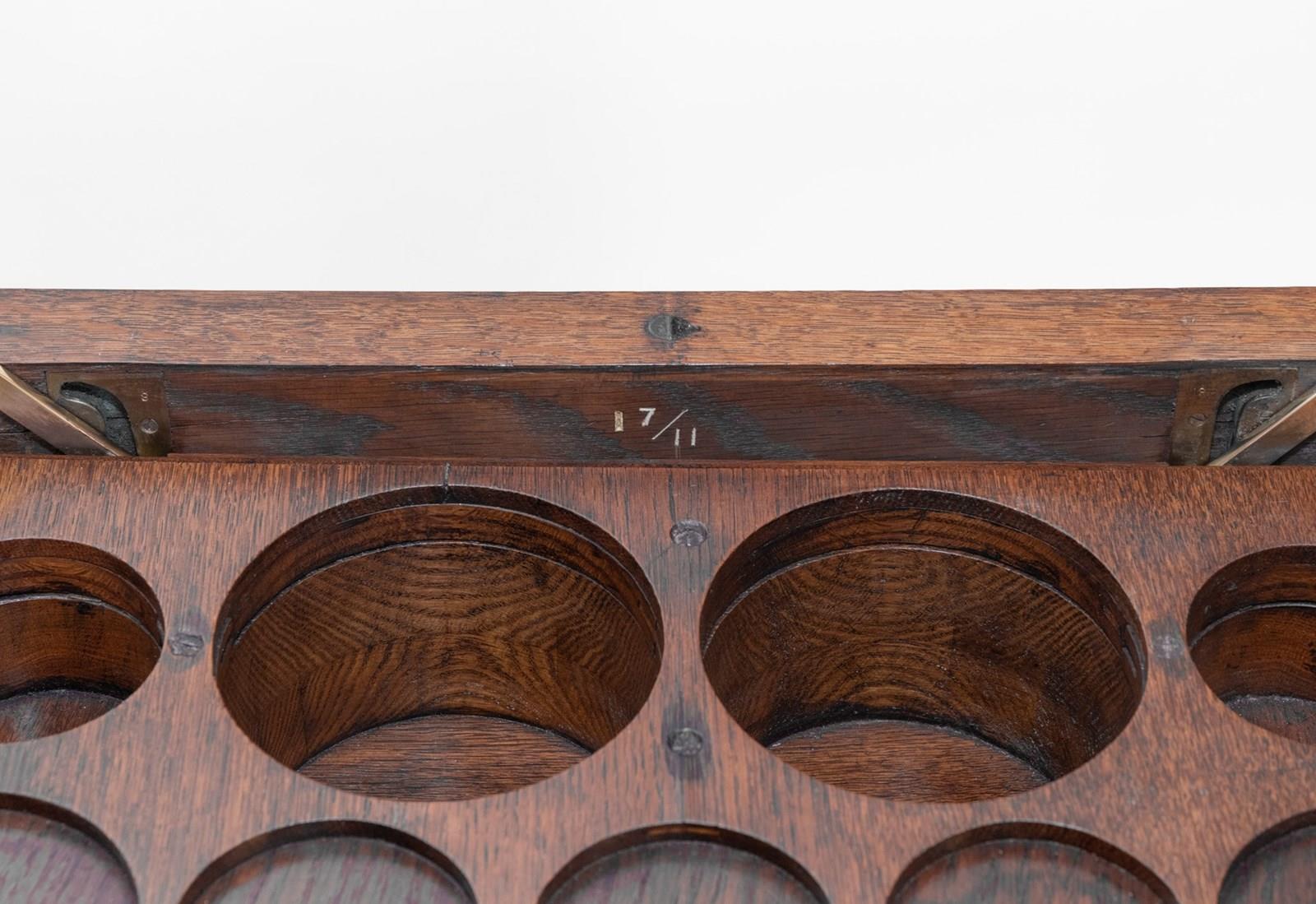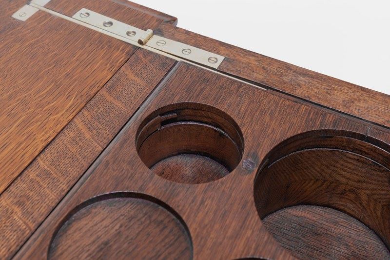 When the lid is opened, the glassware inside are elevated to table-top height. The solid brass hinged mechanism is in very good working order.