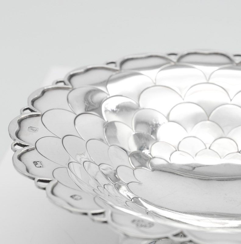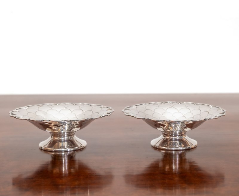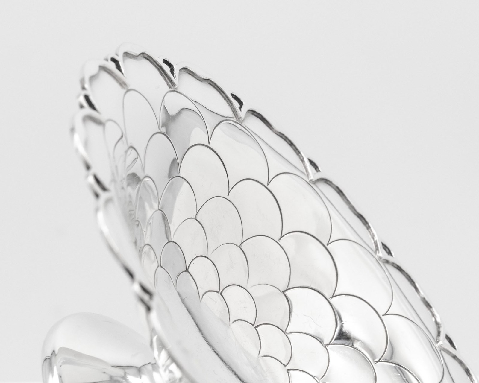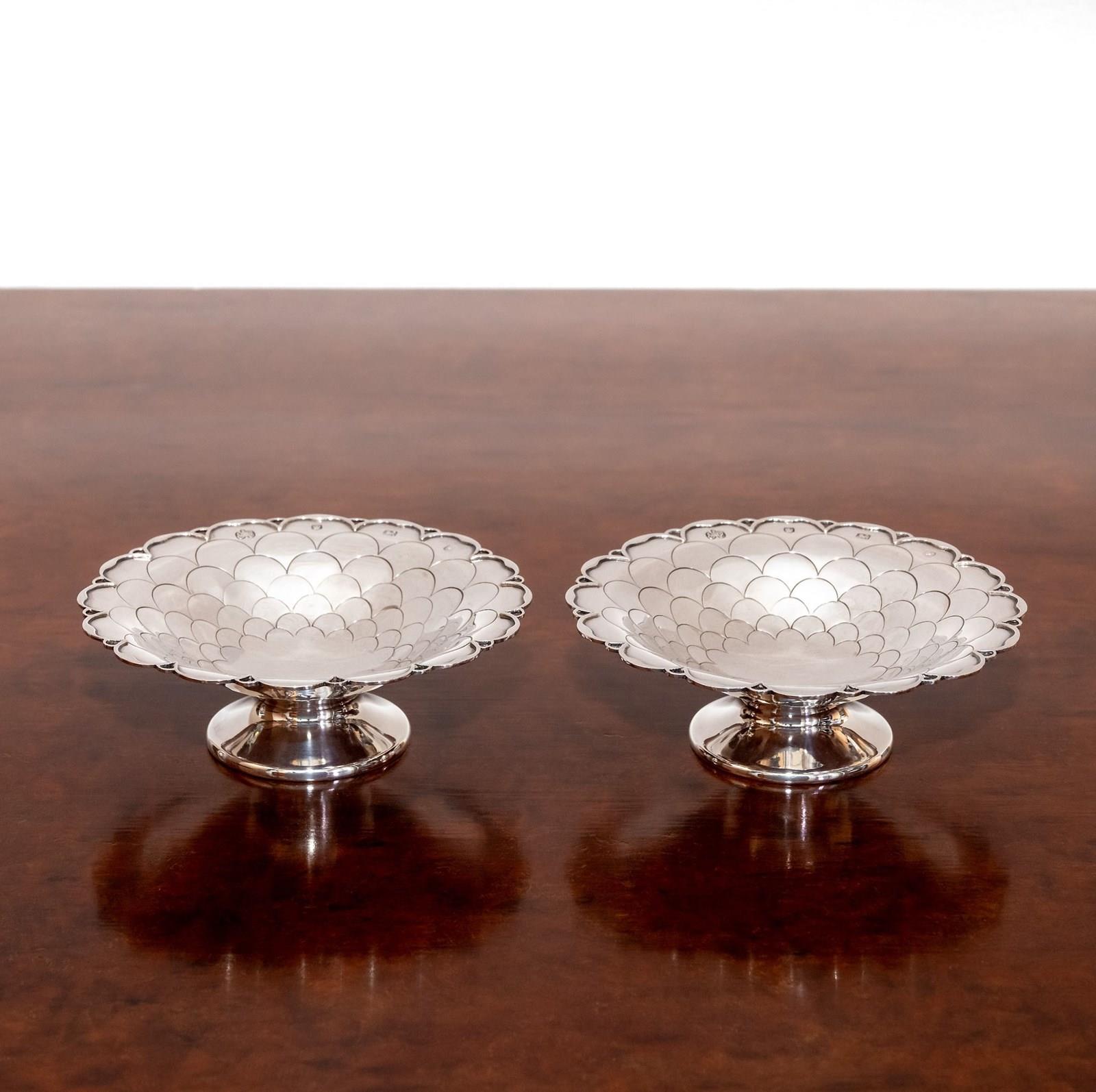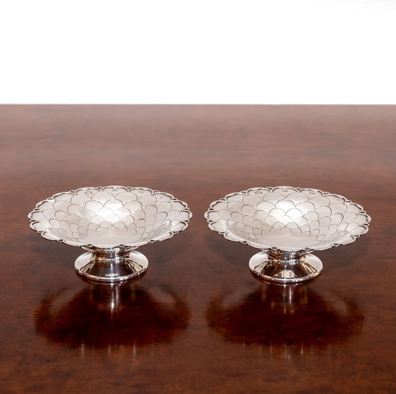 The pair are in very good condition, showing some light surface marks and some rubbing to the hallmarks. The fish scale pattern very much giving an Art Deco feel to the dishes.