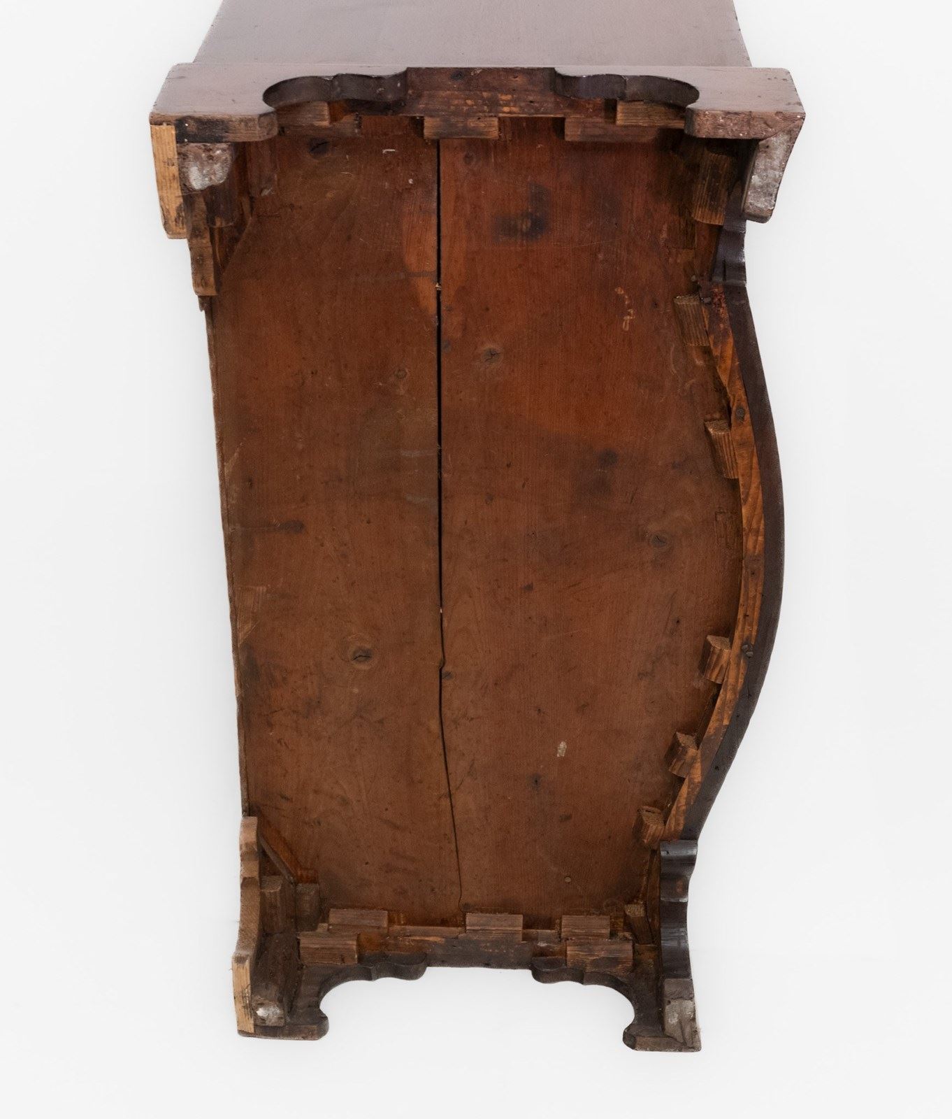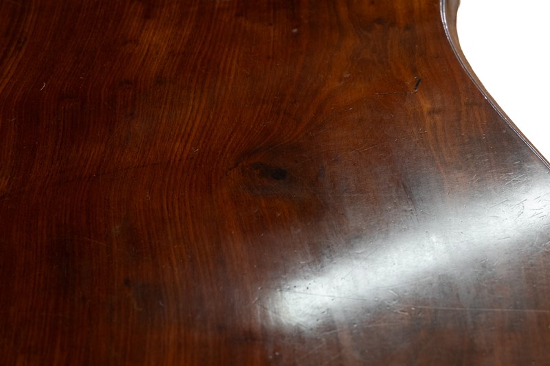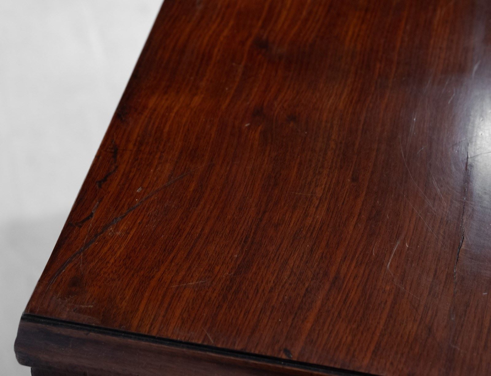The chest has been re‑French polished at least 30–40 years ago. It now has a soft, mellow sheen. There are age‑related knocks and marks present, from before and after the polish, as expected, but the piece remains visually cohesive and richly coloured. Please refer to the photographs. The right hand front bracket foot has been replaced at some point in its life, though not recently - probably when refinished, as have the runners on the base of the drawers.