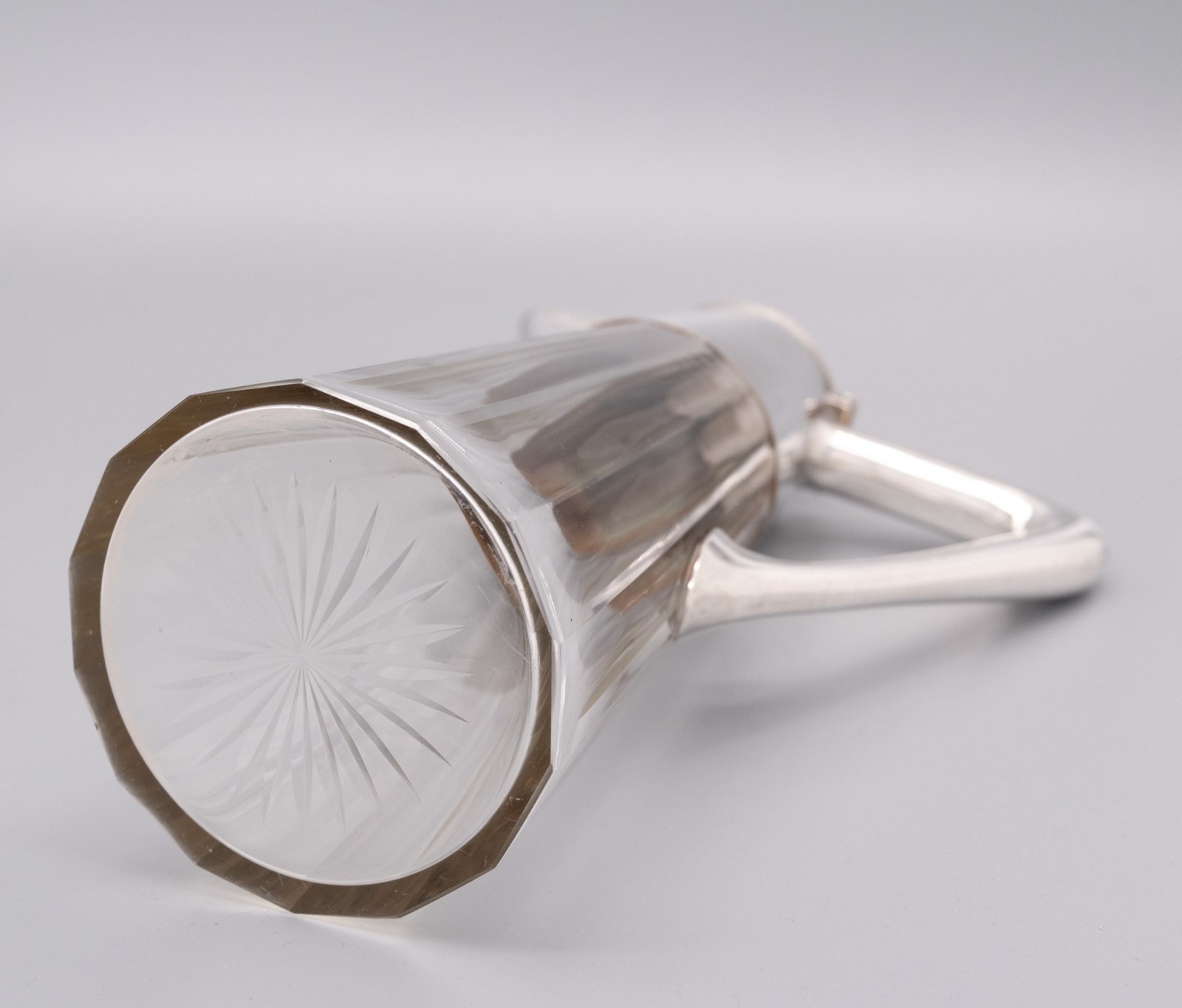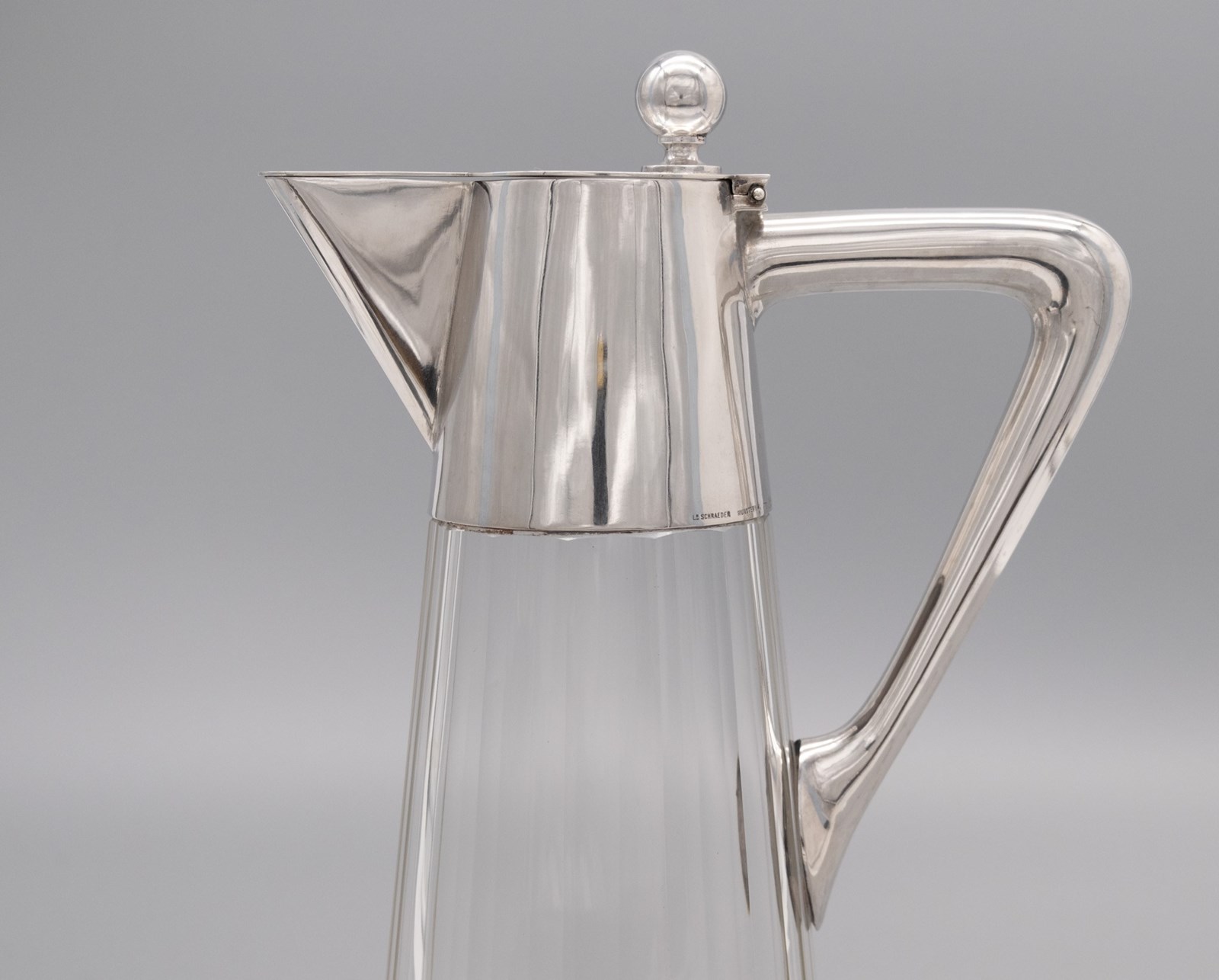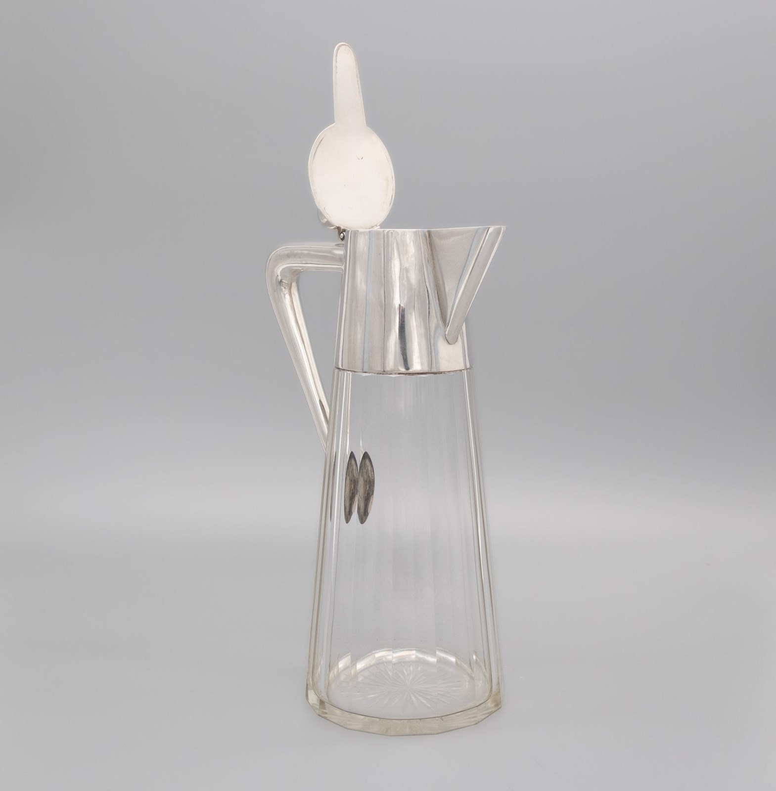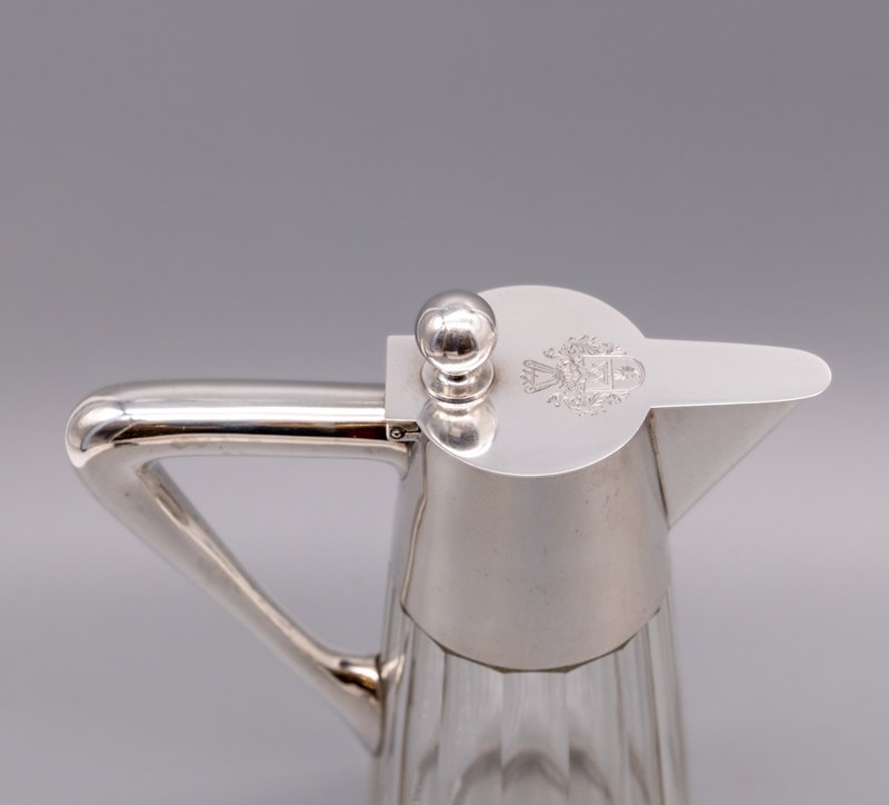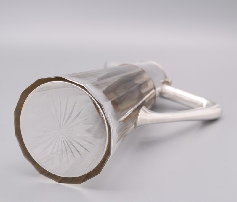A German Arts & Crafts period claret jug with ribbed star‑cut glass body and 800‑silver mount. Marks for: LO Schraeder - Münster Circa 1900.
