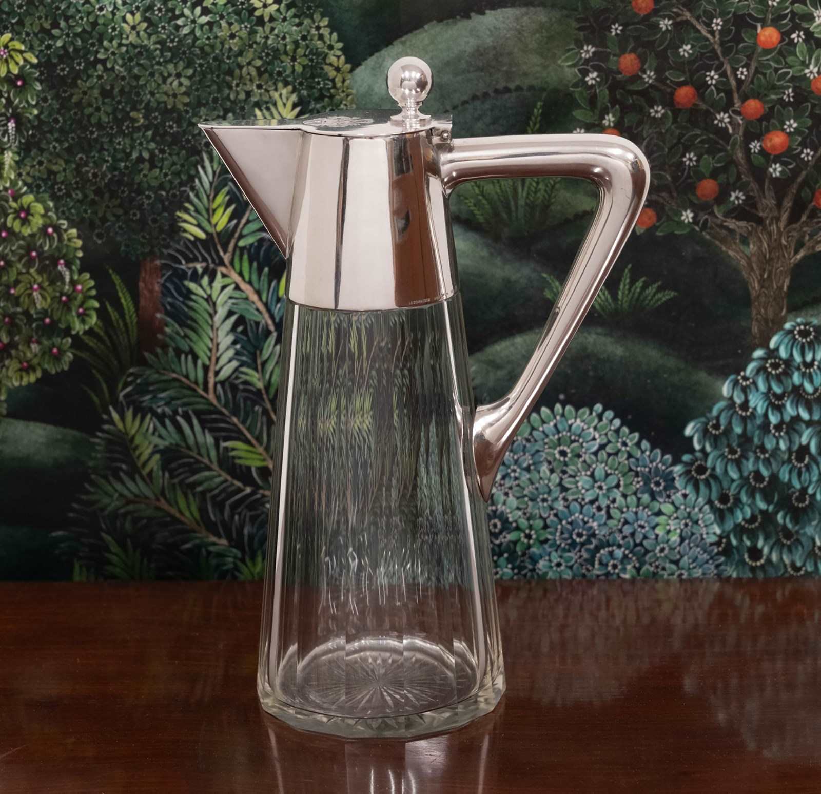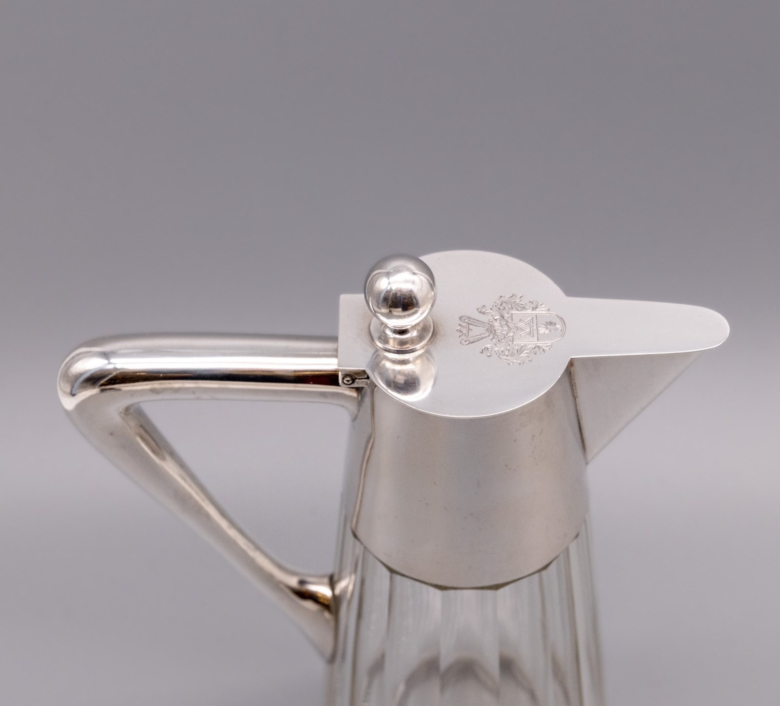 The jug is in very good condition, the .800 silver mount shows light surface marks consistent with age, and the glass has only a few minor nibbles to the base of the rim. Please refer to the photographs. The lid is engraved with a heraldic armorial. The surface marks are far less pronounced in reality than they may appear in the photographs.