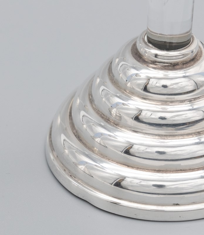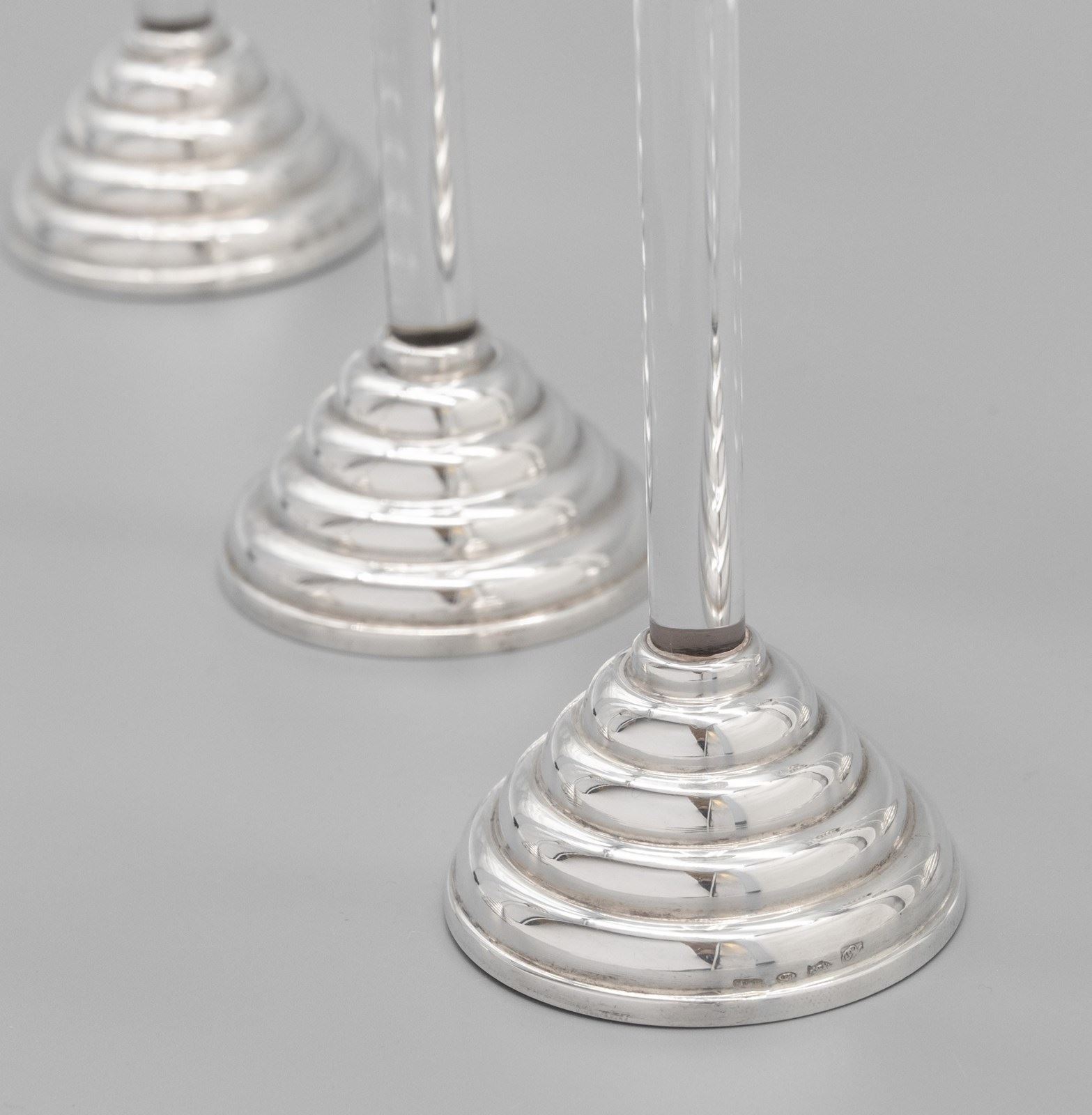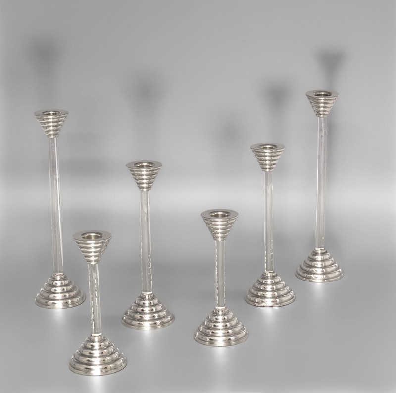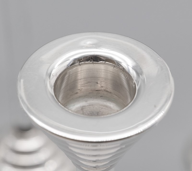 Each of theses fabulous candlesticks are formed with a fluted conical base and matching fluted candle cup. Each piece is hallmarked. The stepped height progression gives the group a strong sculptural rhythm, making them visually compelling whether displayed together or individually.