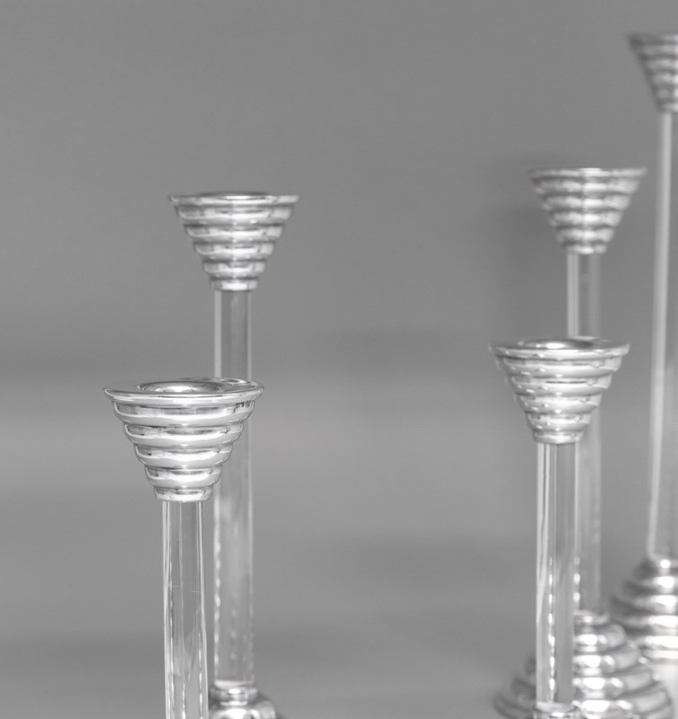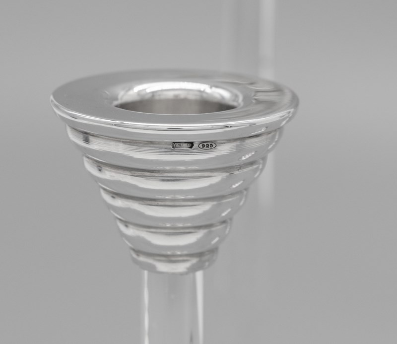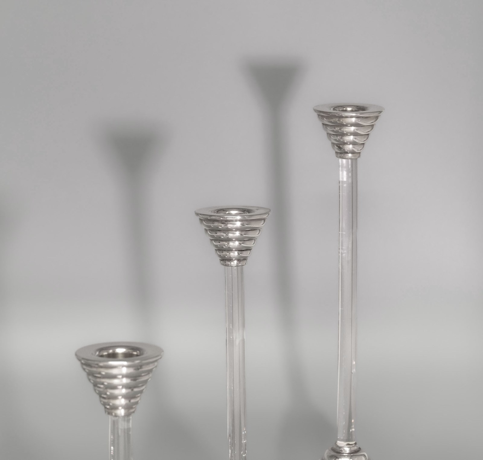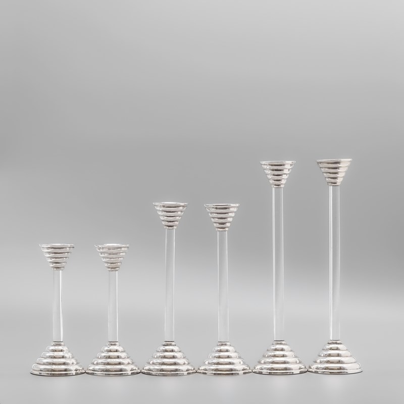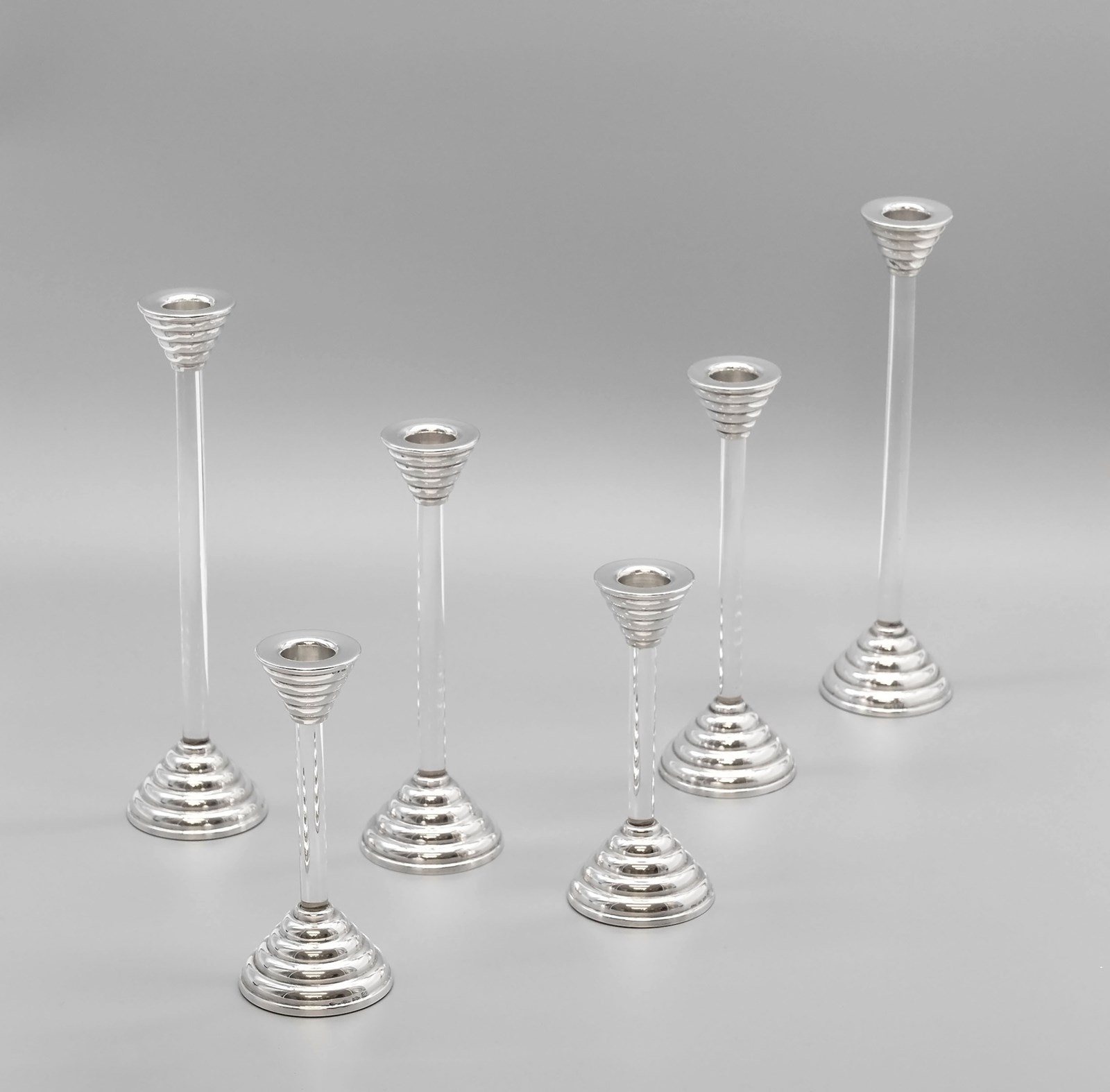 Vintage Italian Modernist sterling silver set of six candlesticks in a graduated arrangement with glass cylindrical stems. Fully hallmarked and produced by the Carlo Masini studio in Firenze. Circa 1970.