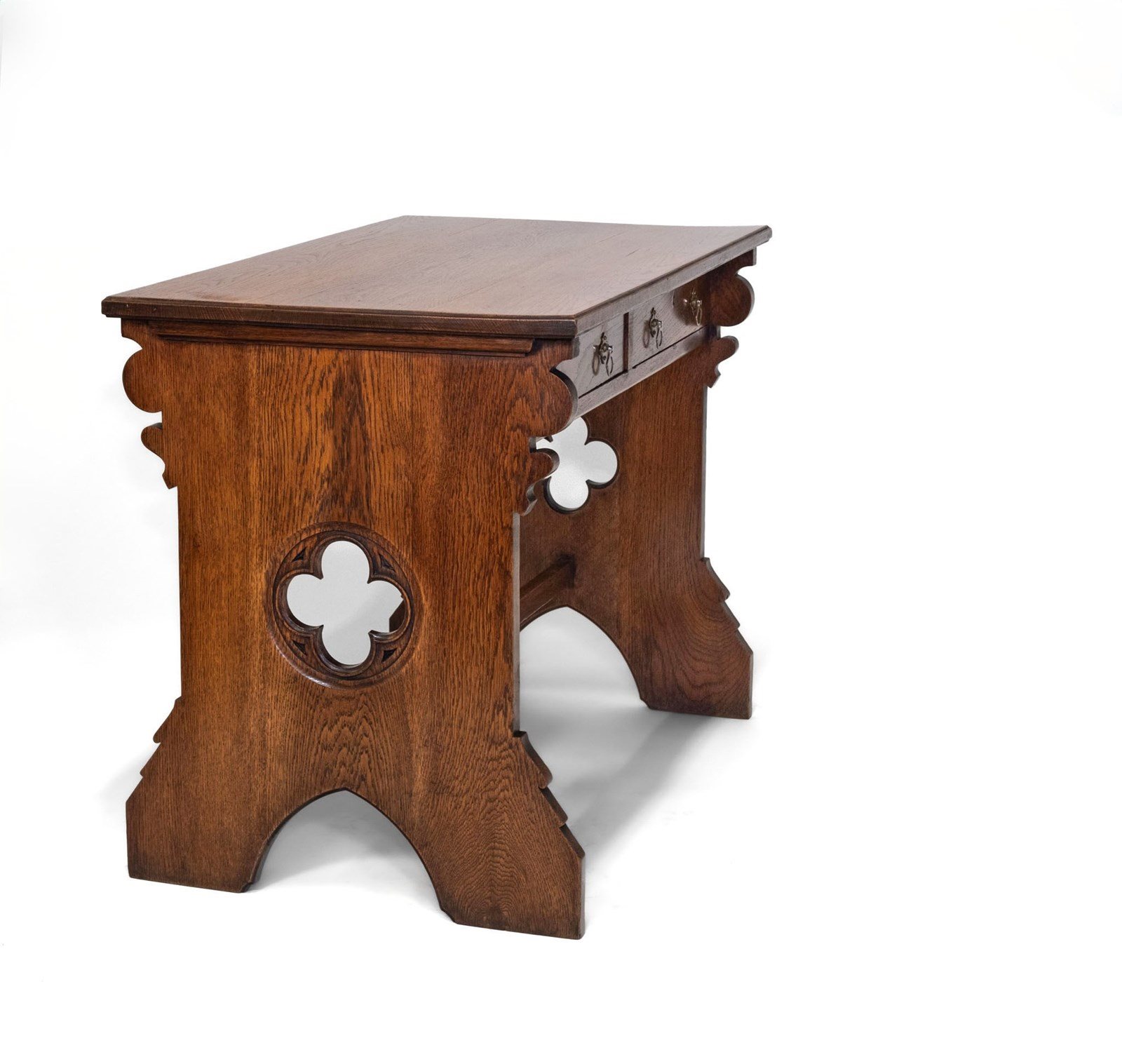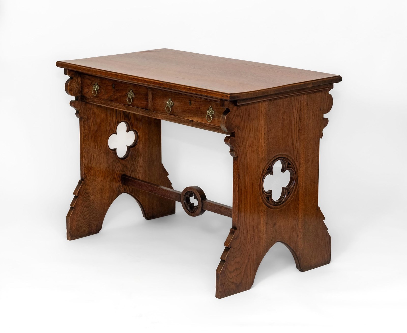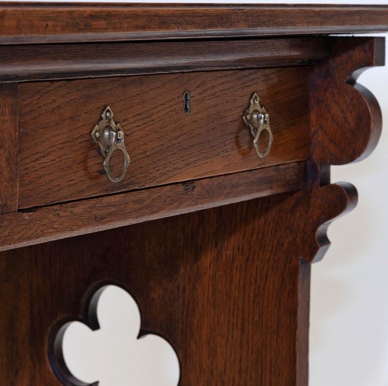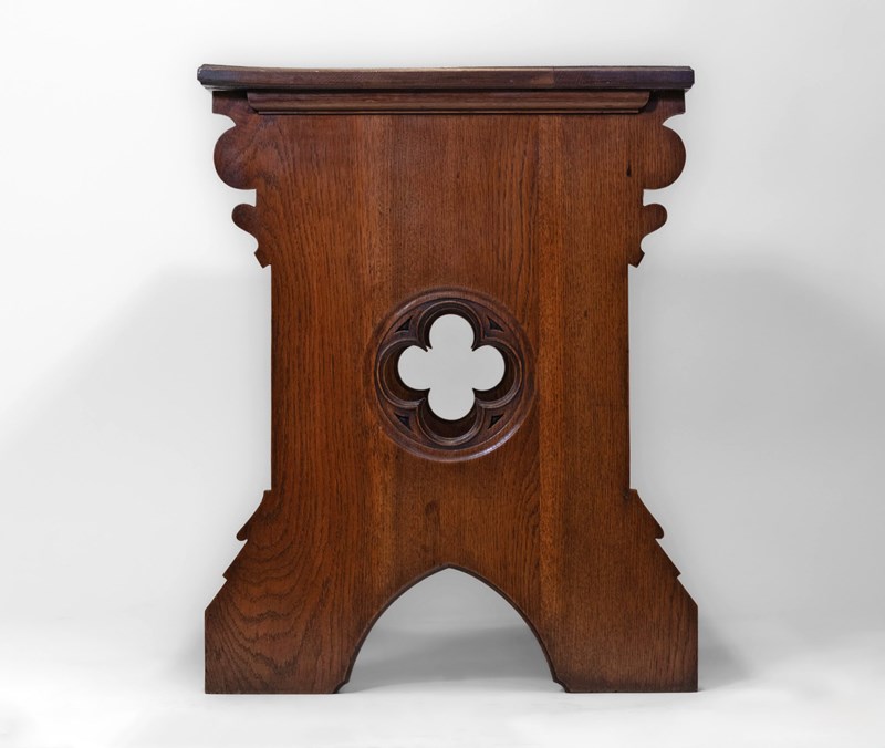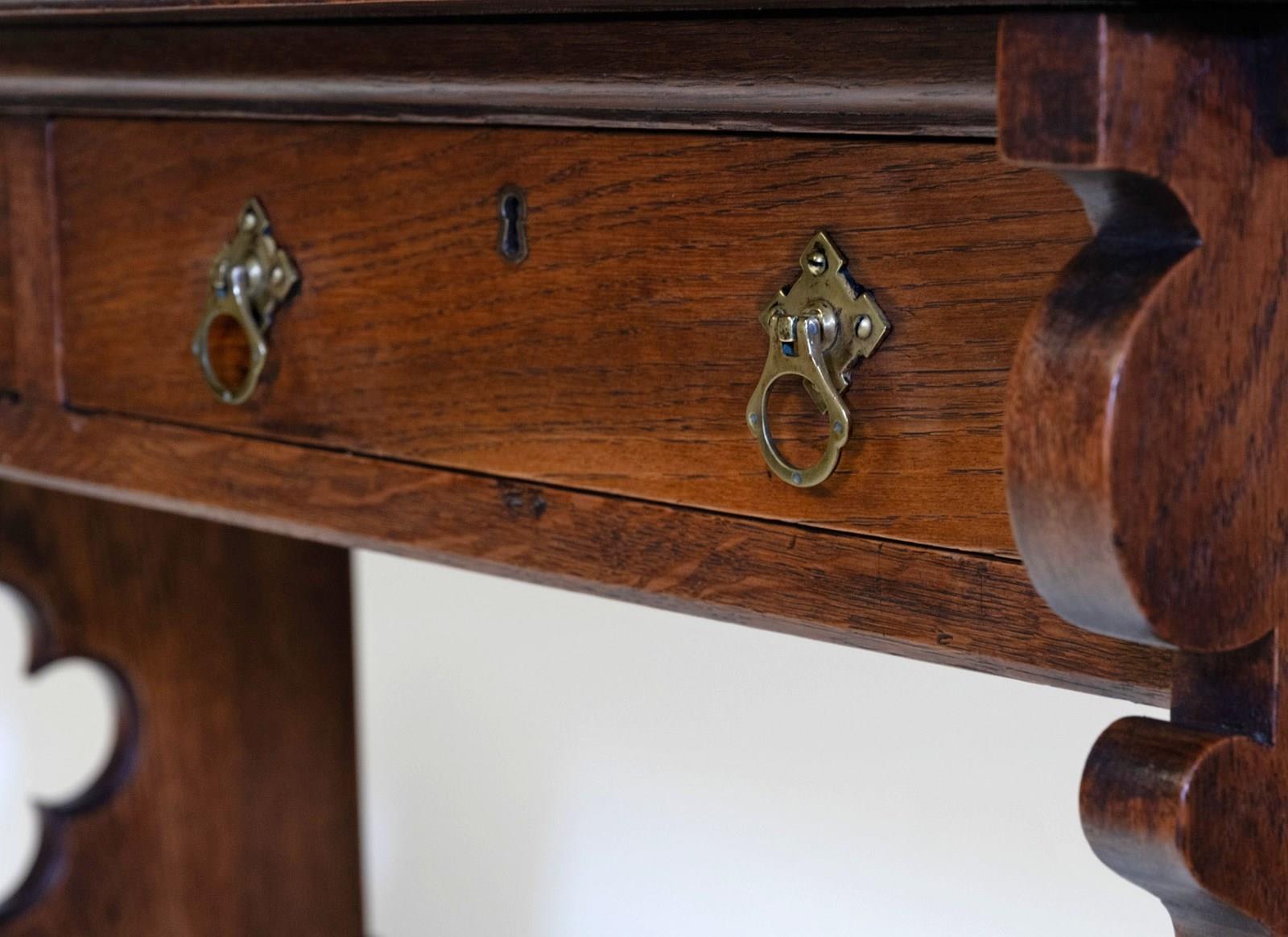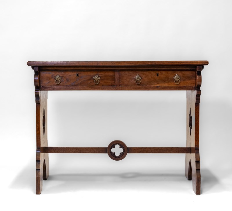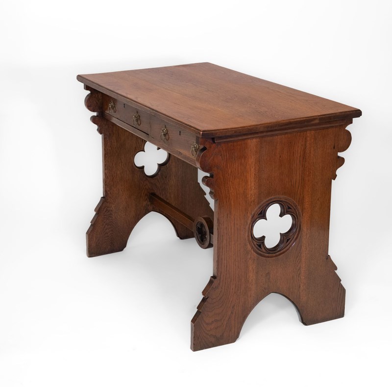 The desk is made in solid oak, having pierced quatrefoil decoration to the trestle ends with a lancet arched foot. The central stretcher with a quatrefoil design.