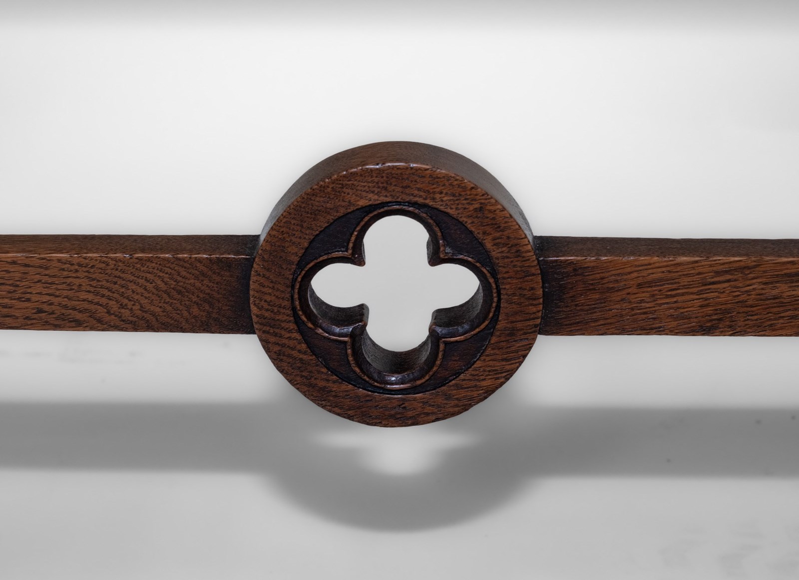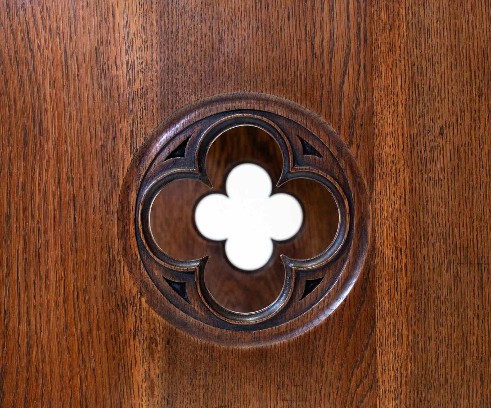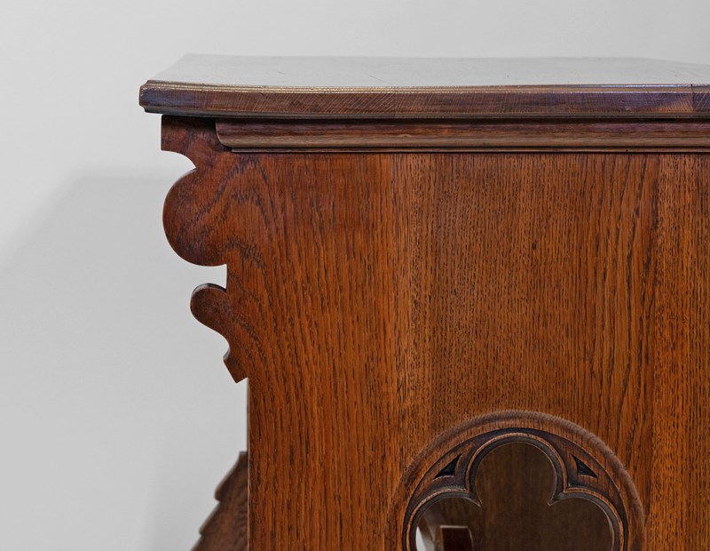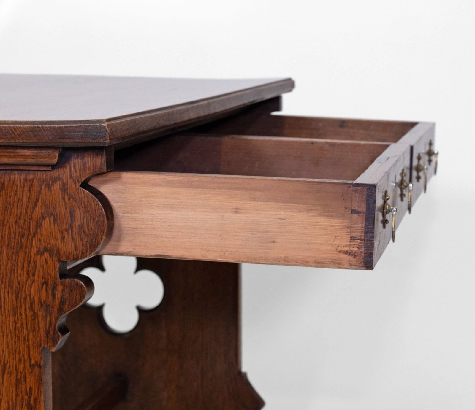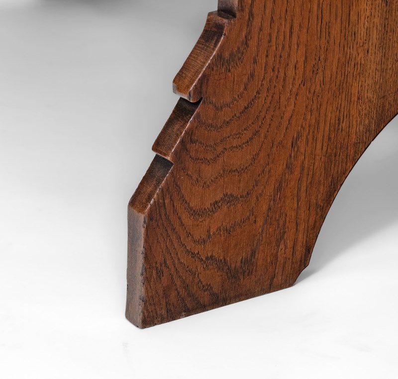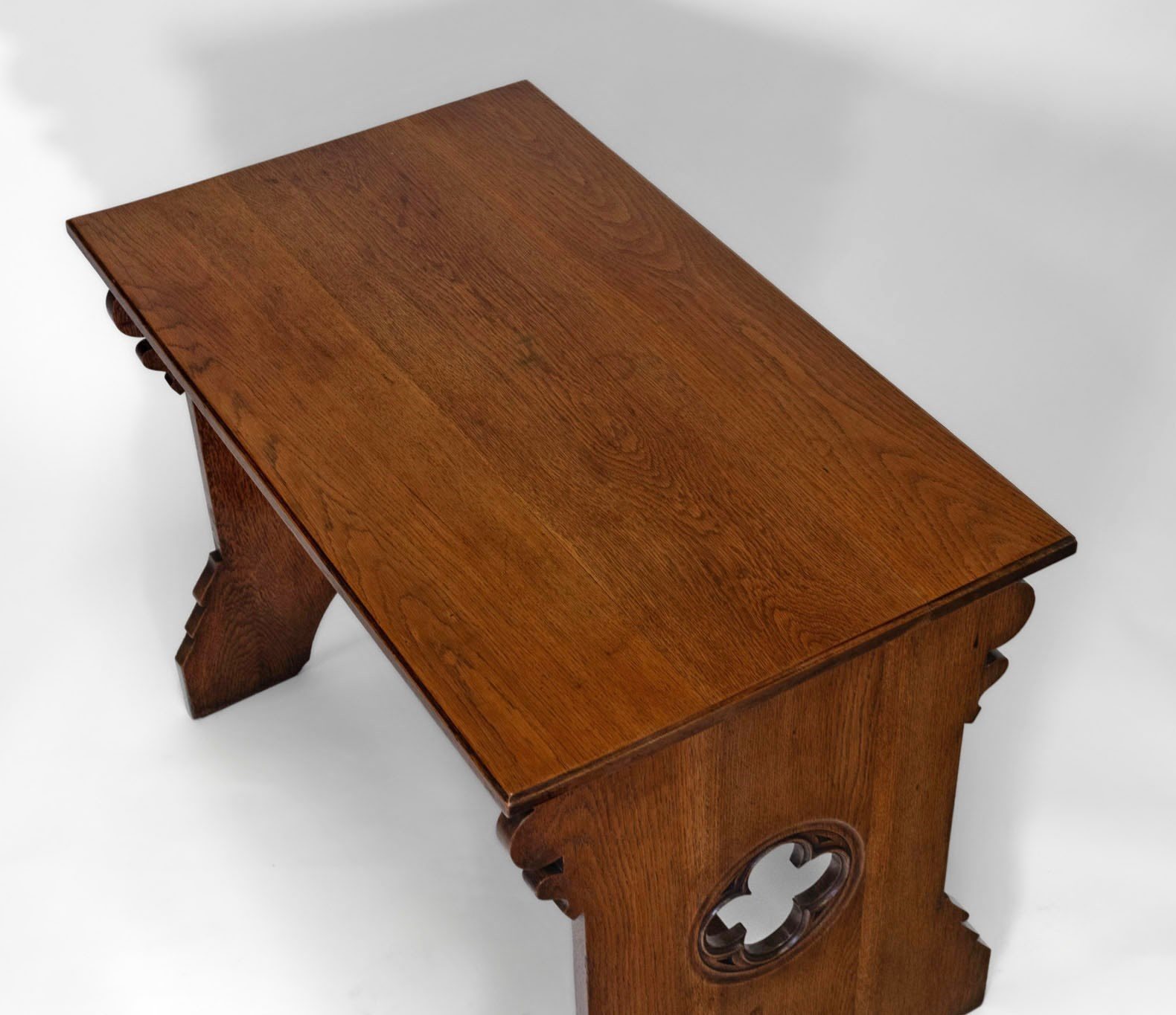 The desk is made in solid oak, having pierced quatrefoil decoration to the trestle ends with a lancet arched foot. The central stretcher with a quatrefoil design.