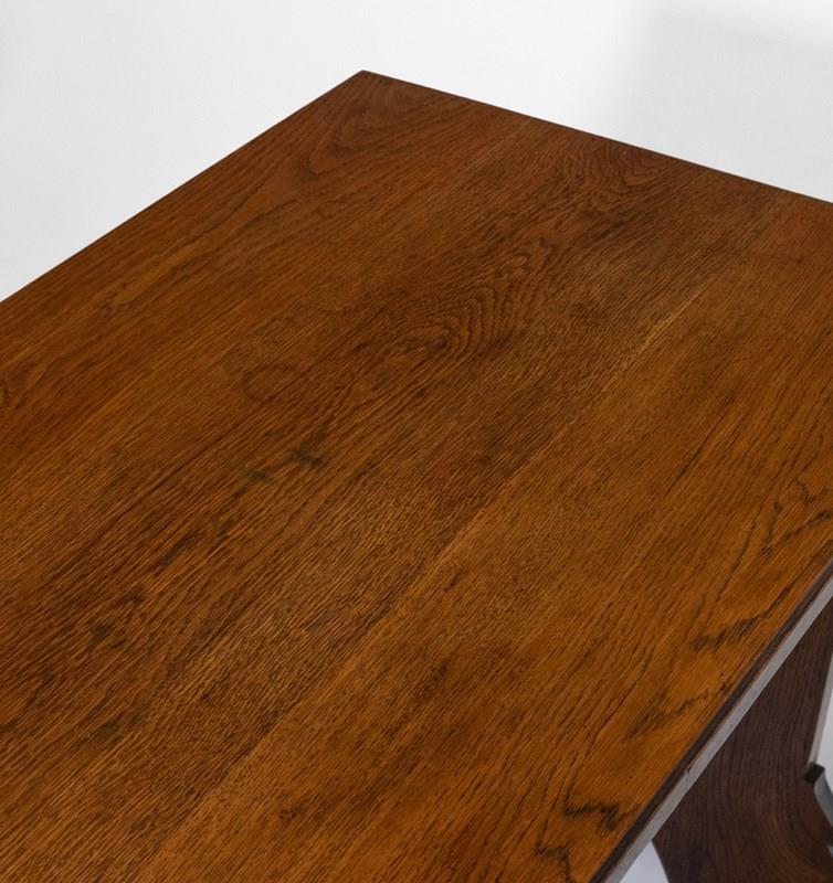 It has been sympathetically refinished by hand and waxed. The top still shows a few historic marks consistent with age and use. There is some slight movement to the front top with age (this is sturdy), and the left hand trestle end has slightly moved. Please refer to the photographs. The desk sits flat and sturdy.