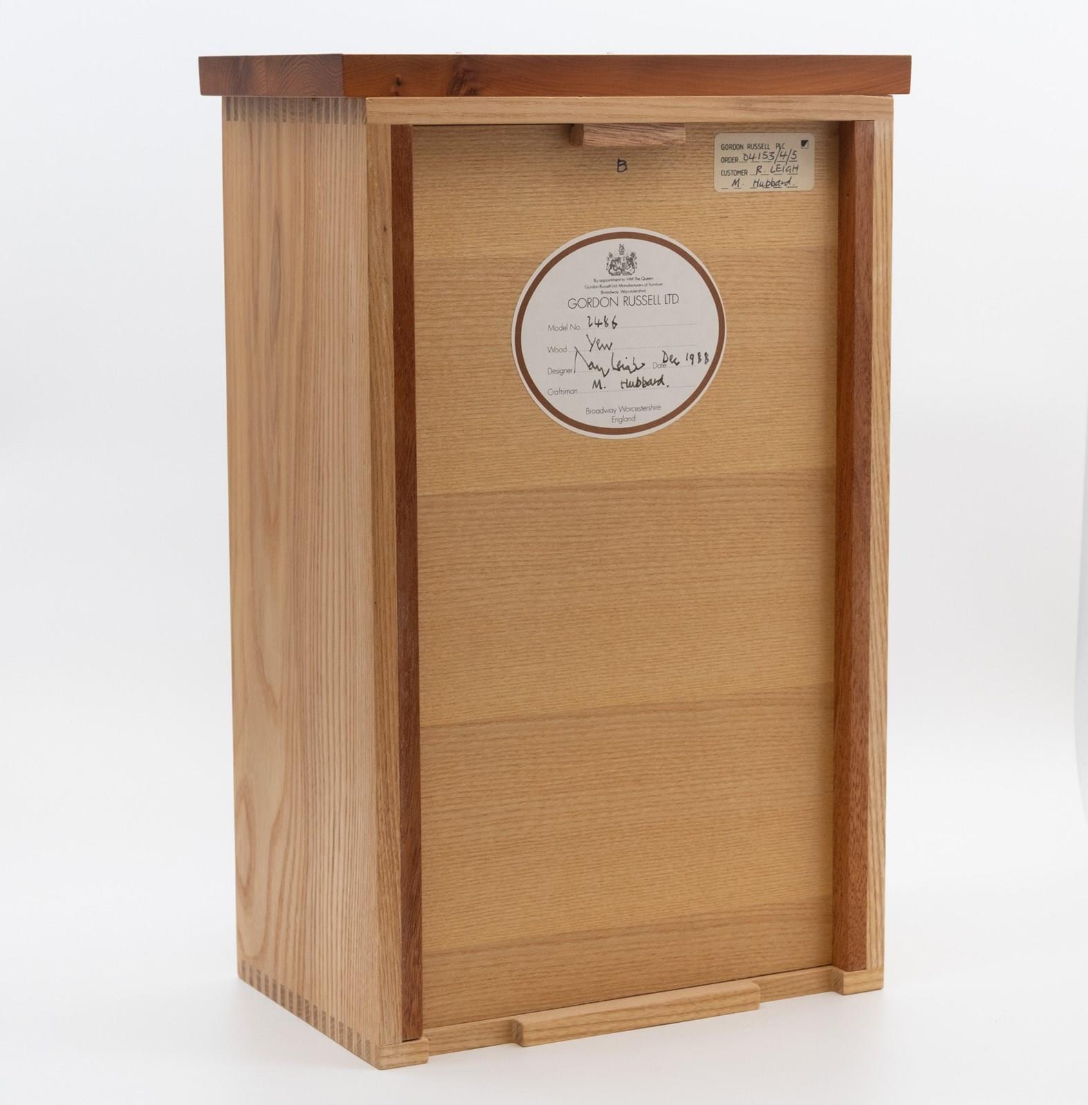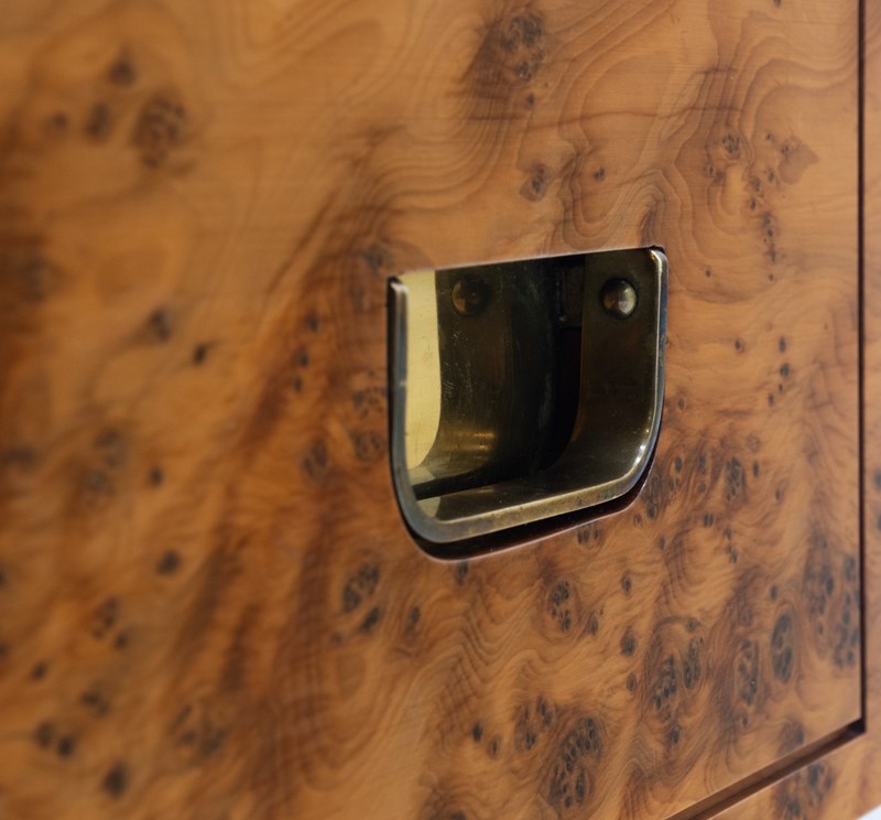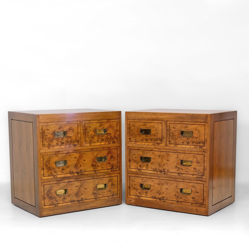 Pair of burr yew and yew bedside chests with recessed brass handles, designed by Ray Leigh for Gordon Russell Ltd. December 1988.