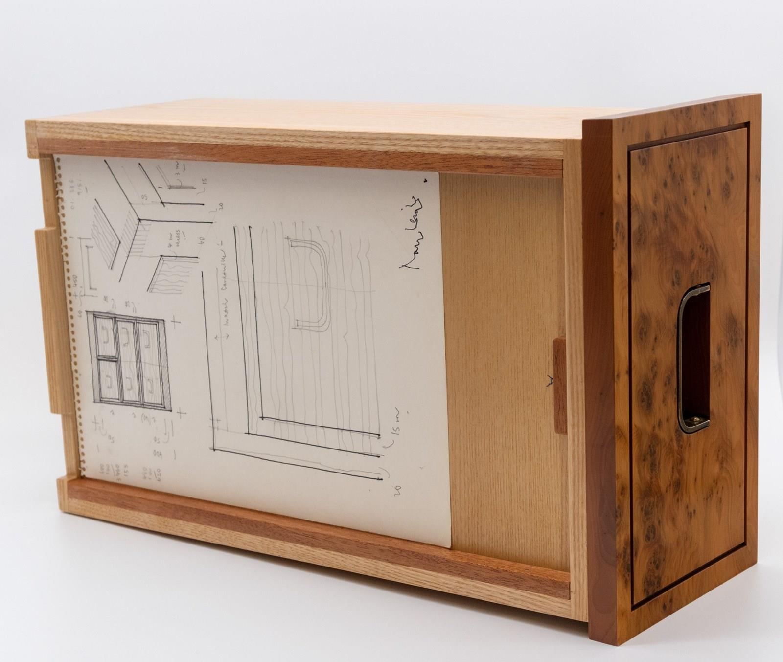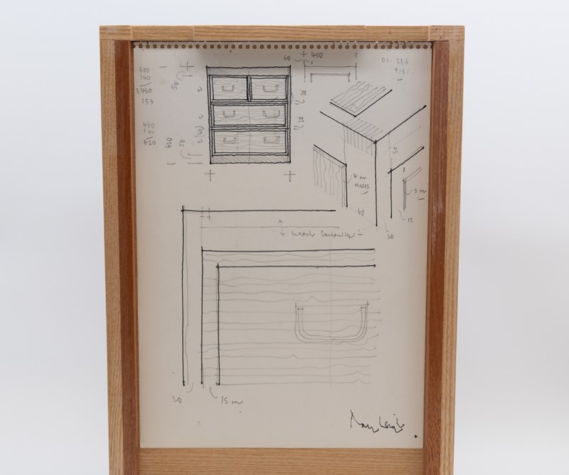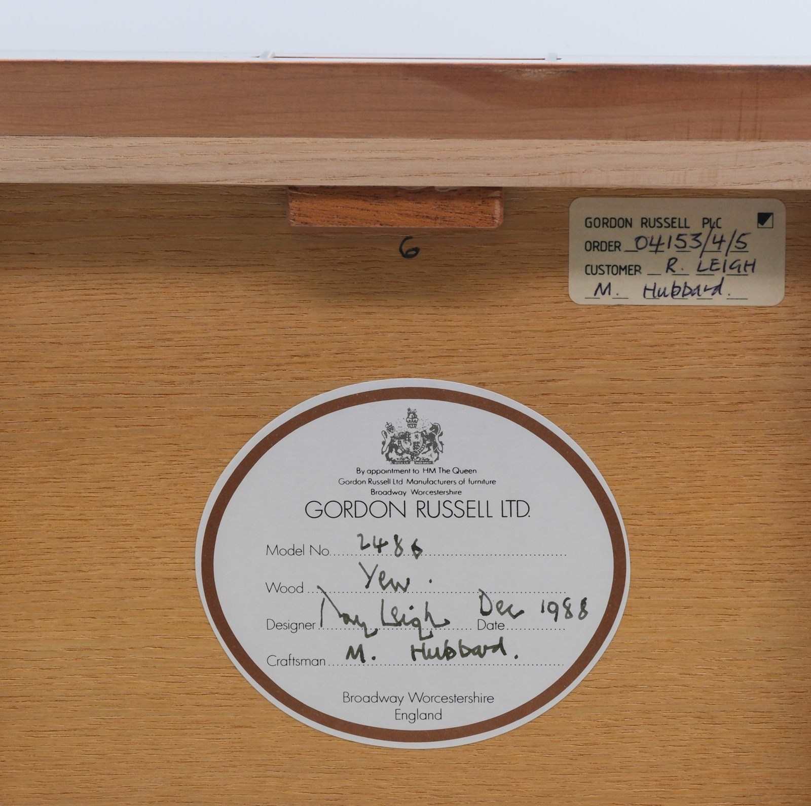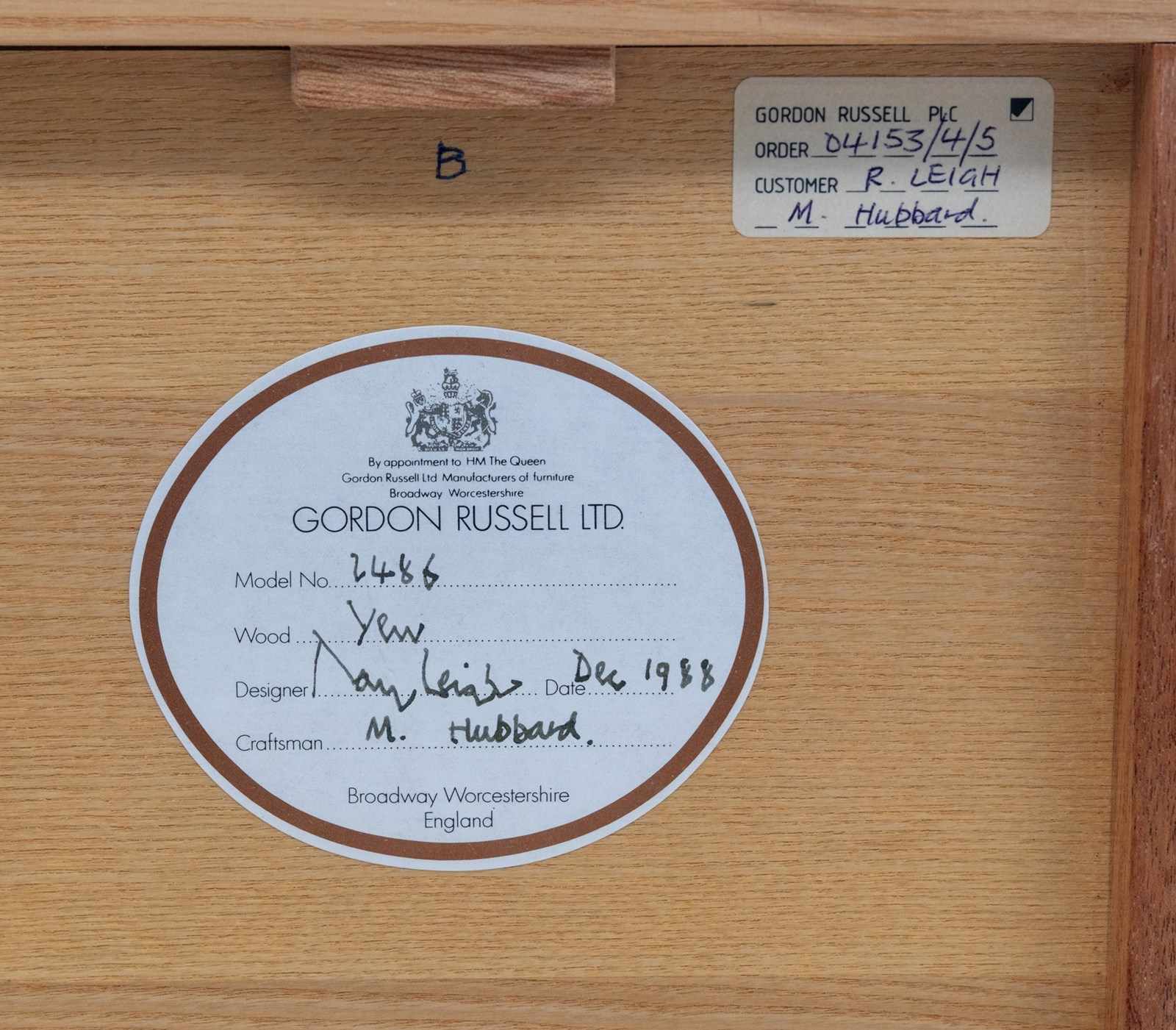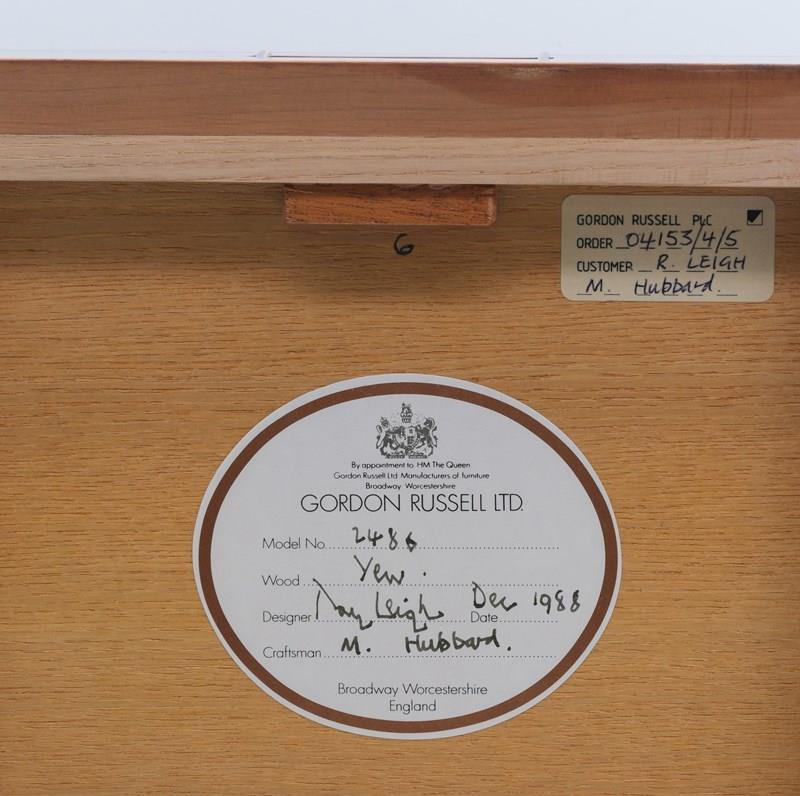 These chests were made for Ray Leigh by craftsman M Hubbard. They come with Leigh's personal drawing plans for the chests which are under a drawer base and each has the hand signed Gordon Russell makers labels.