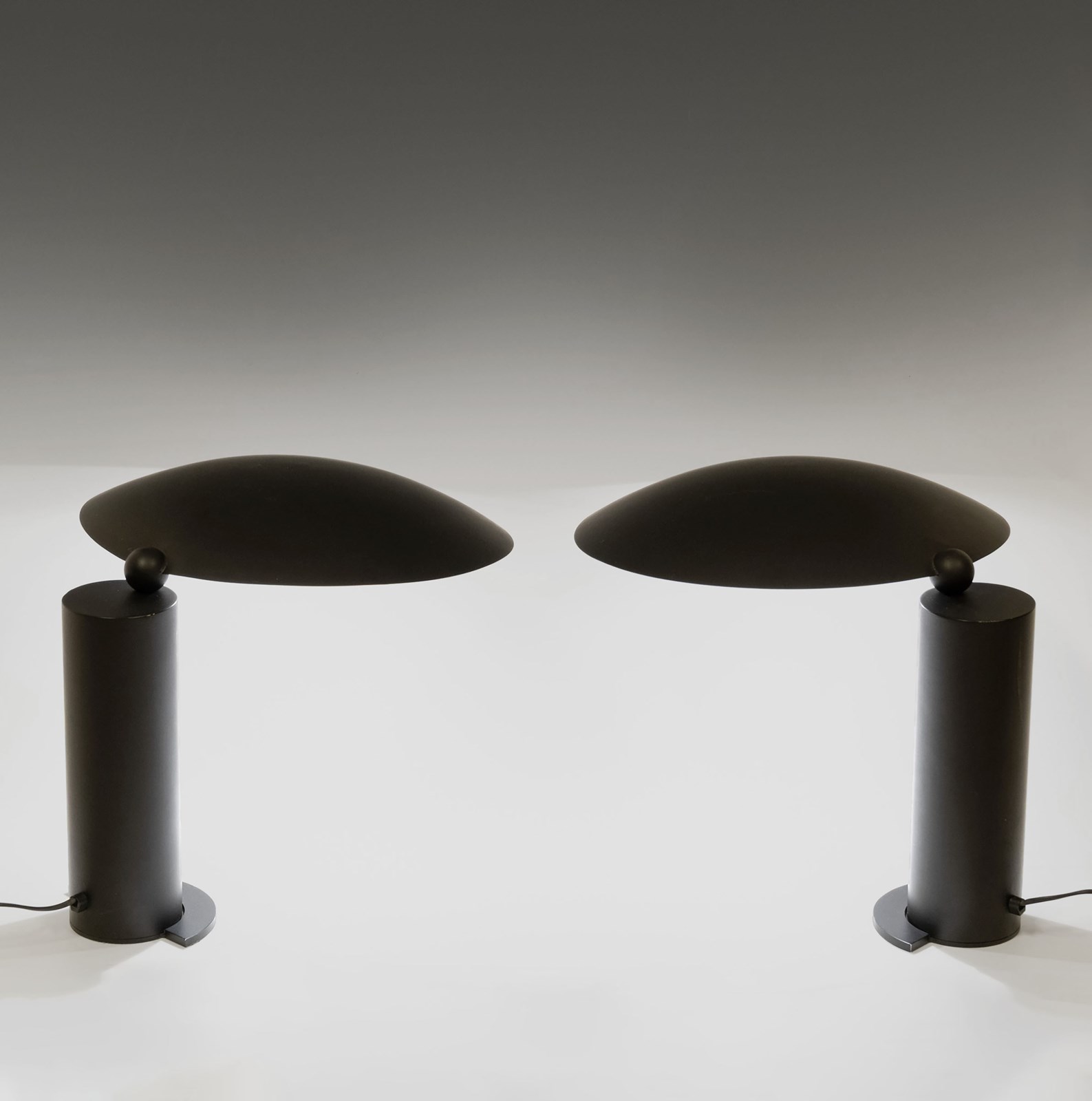 Memphis Group in style, the lamps have geometric elements, and stand on semi circular disc feet, with weighted cylindrical bodies. A small sphere separates the large removable reflector shade that rotates fully 360 degrees. The whole is matt black lacquered finish on steel and brass. The shades can be lifted off the bases.