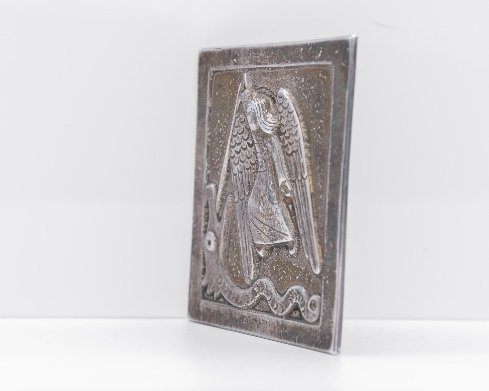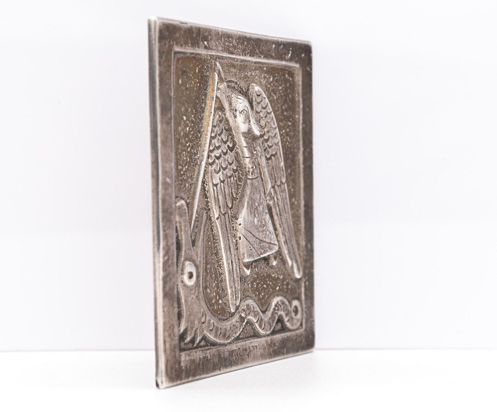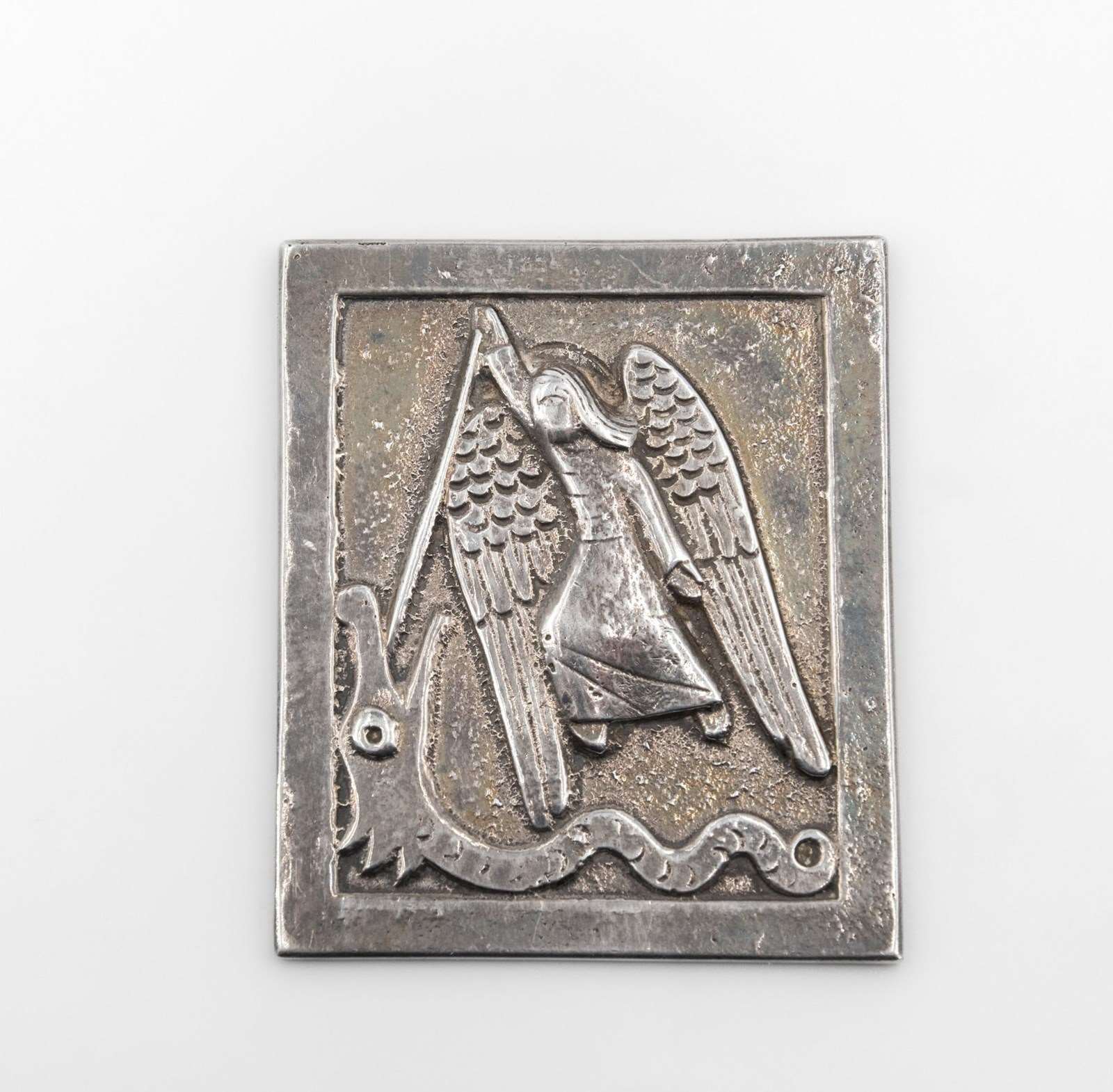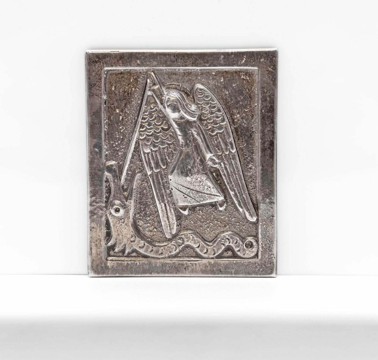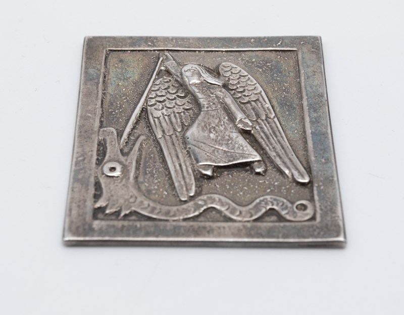 Rare sterling silver miniature wall plaque depicting St Michael. Hallmarked for Dunstan Pruden (1907-1974). London 1972.