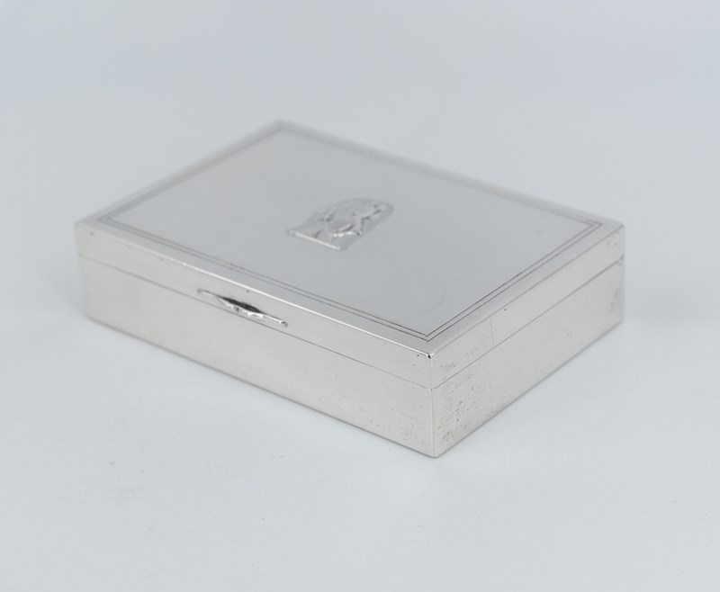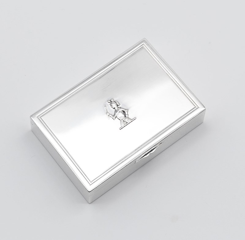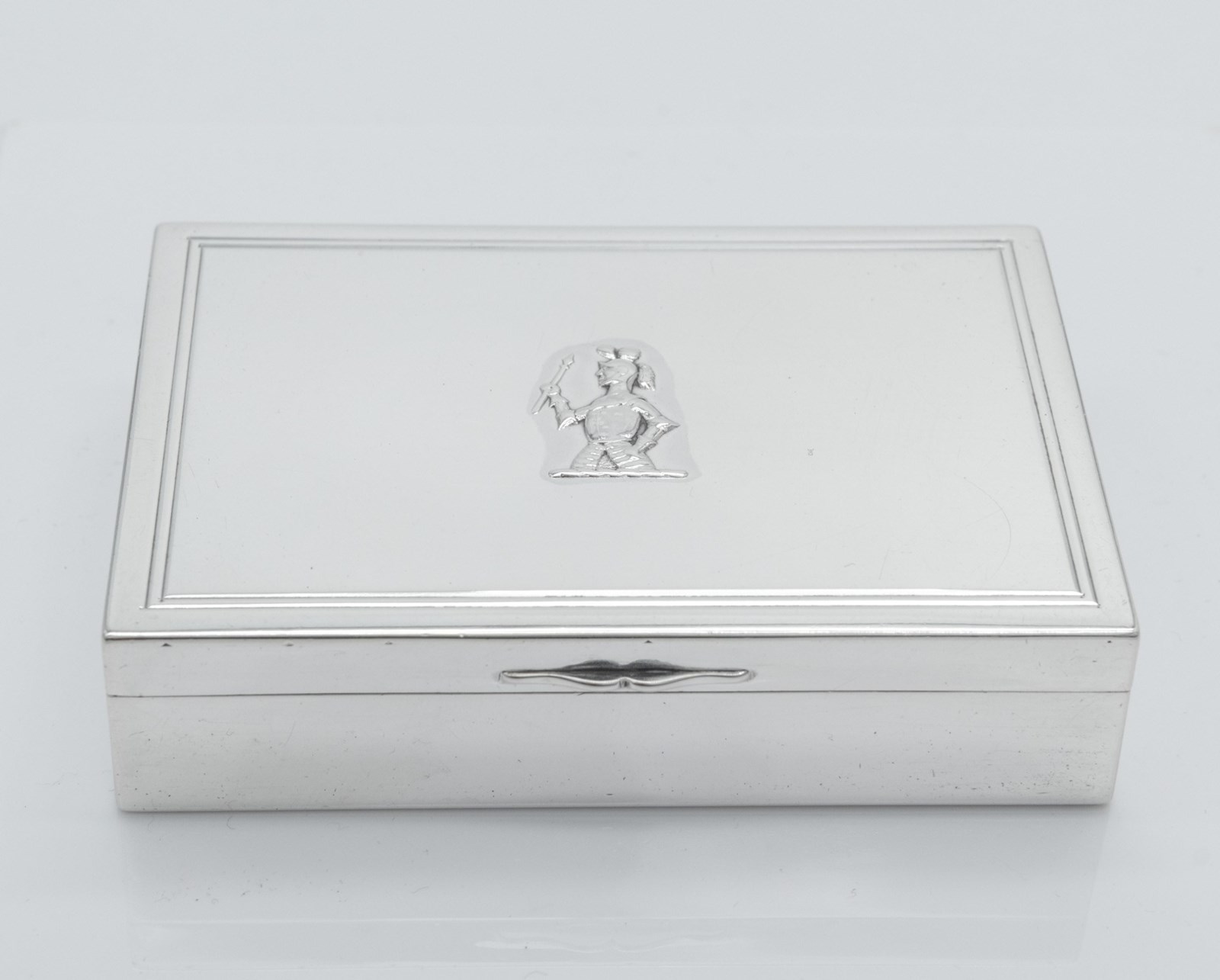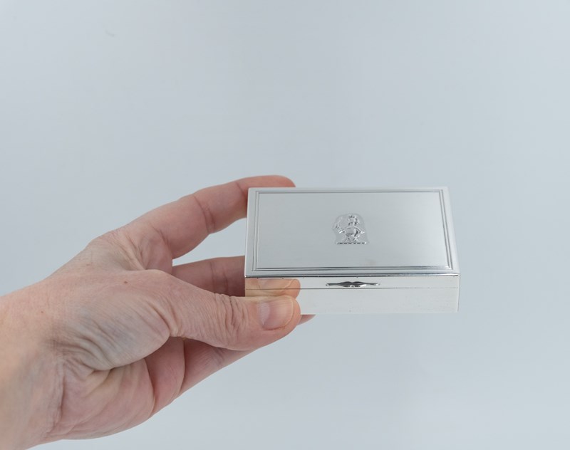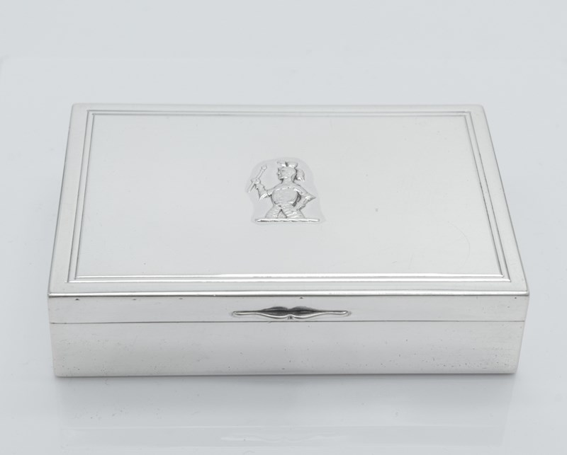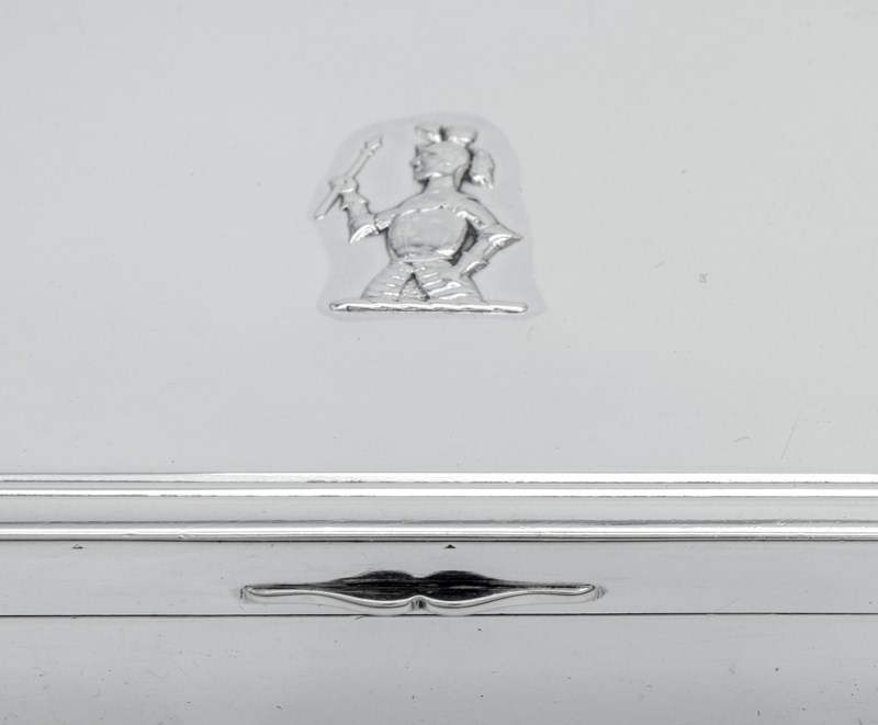 Antique sterling silver trinket box, the hinged cover decorated with a modelled crest depicting a knight holding a spear in relief. Gilded interior. Fully hallmarked for Sebastian Garrard, London, 1931.