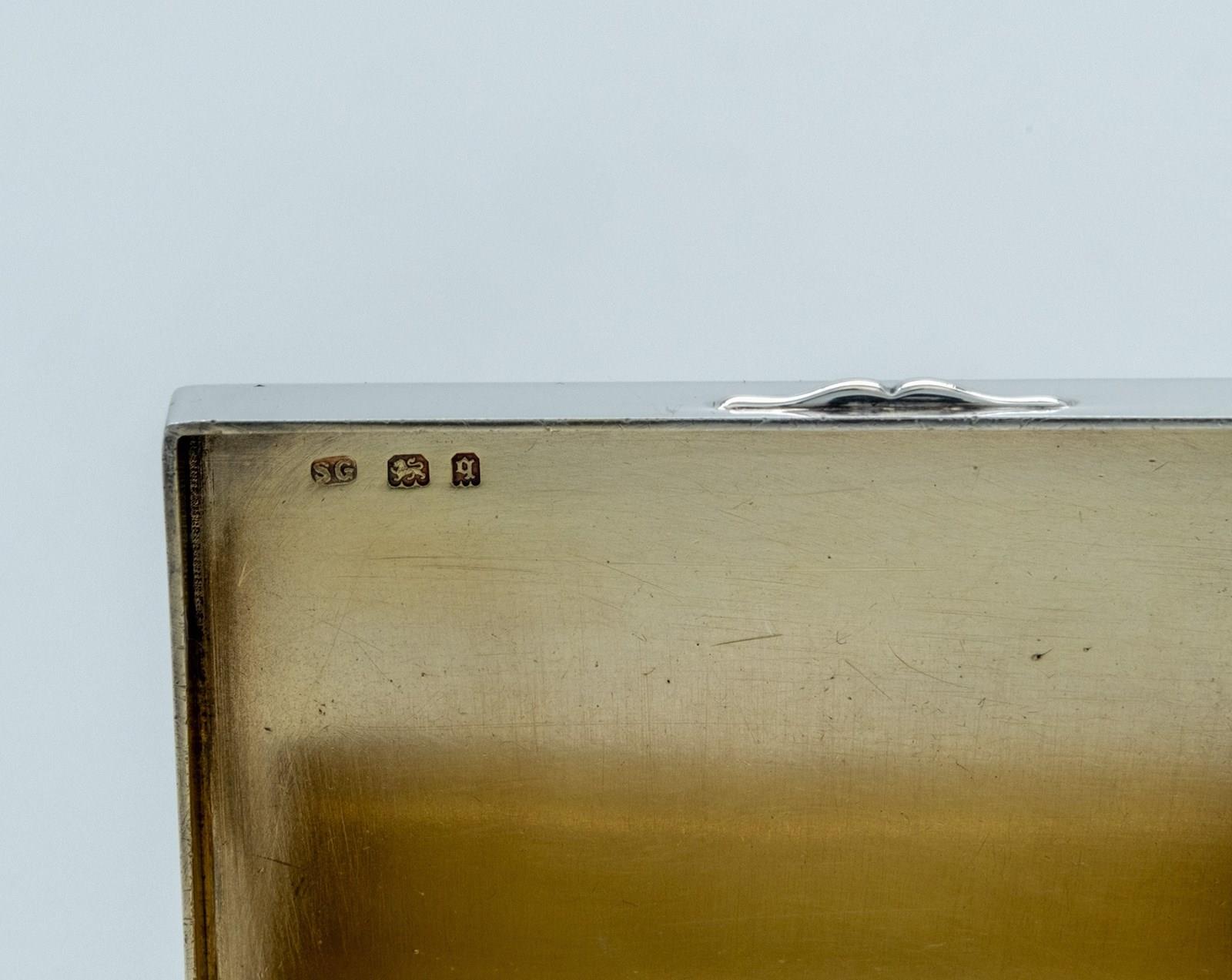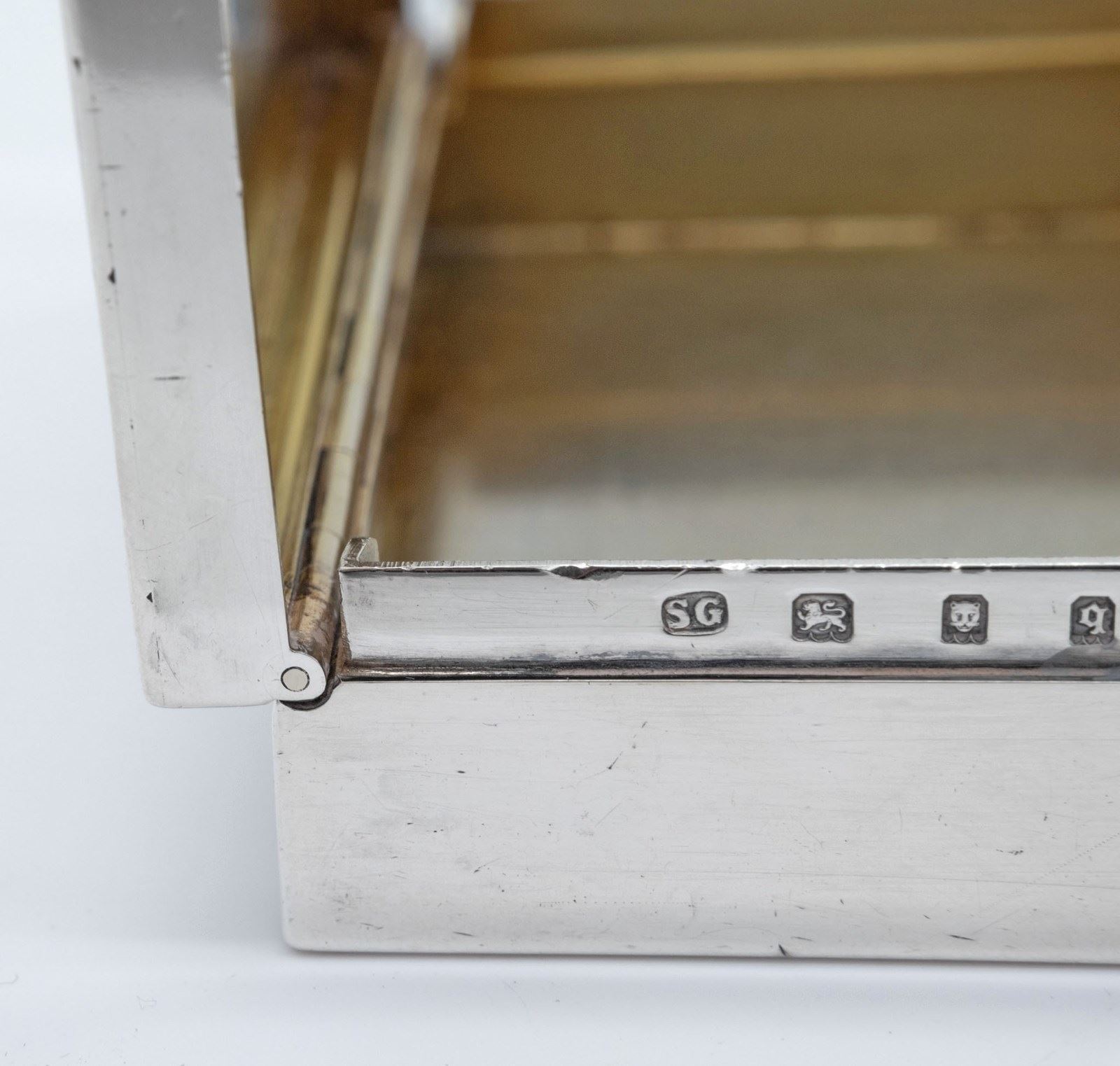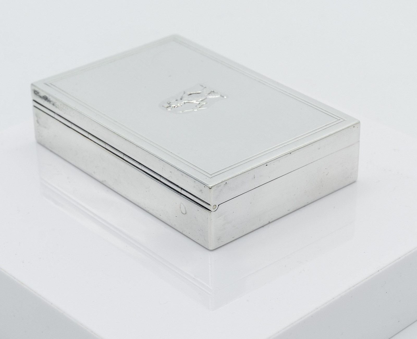 Antique sterling silver trinket box, the hinged cover decorated with a modelled crest depicting a knight holding a spear in relief. Gilded interior. Fully hallmarked for Sebastian Garrard, London, 1931.