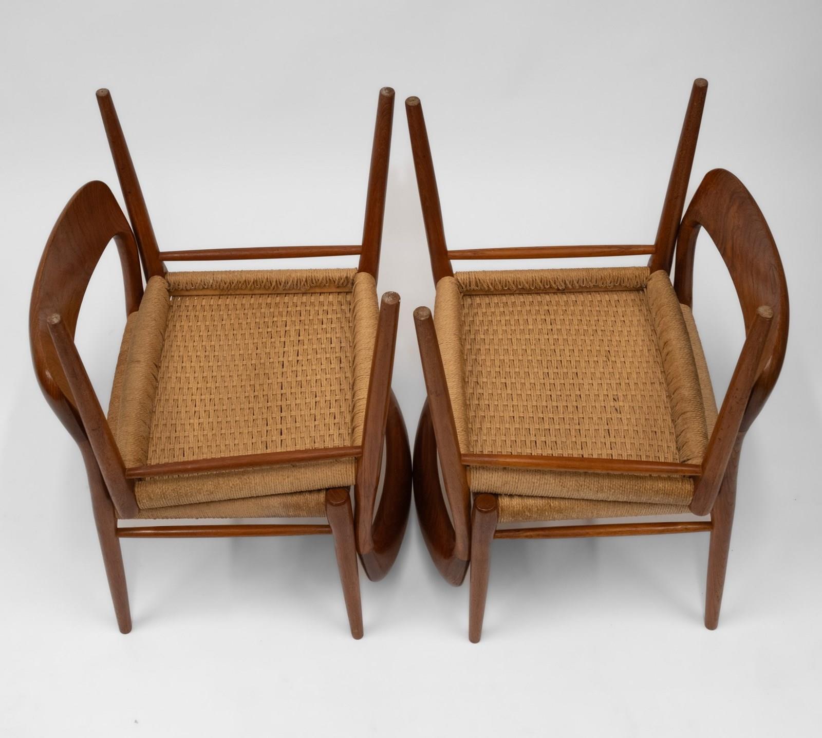 Made in solid teak, with the backrests having beautifully figured teak. They have the original finish which is in very good condition, showing light wear and light knocks consistent with age. The paper cord seating is also original and all are in very good condition with no damage, showing some light marks.