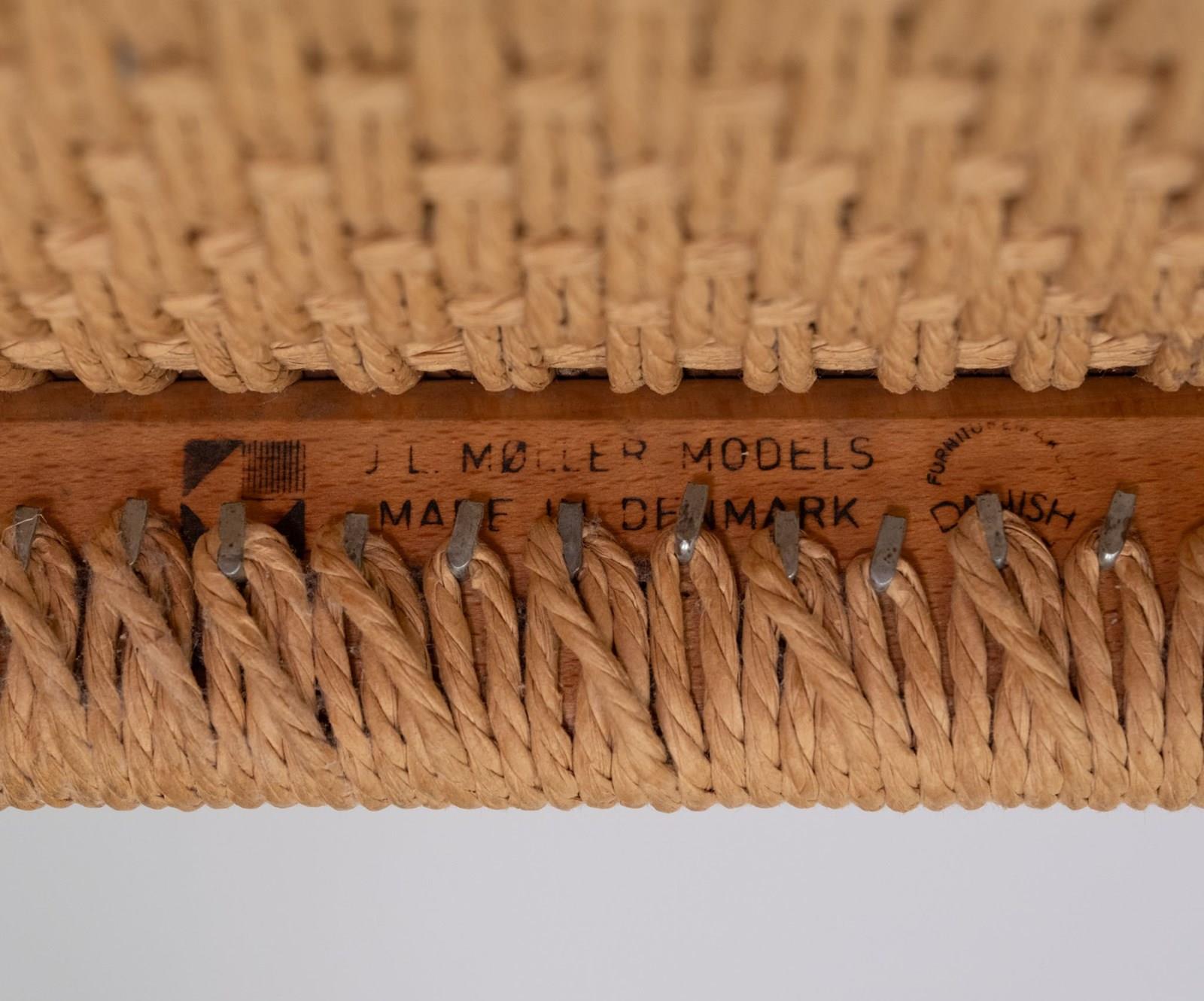 Set of four teak dining chairs with cord seating designed by Niels Otto Moller for JL Mollers. Model 75. Maker's stamps to each chair. Circa 1960’s.