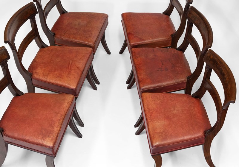 Set Of Six Regency Sabre Leg Mahogany Dining Chairs With Leather Seats C. 1825