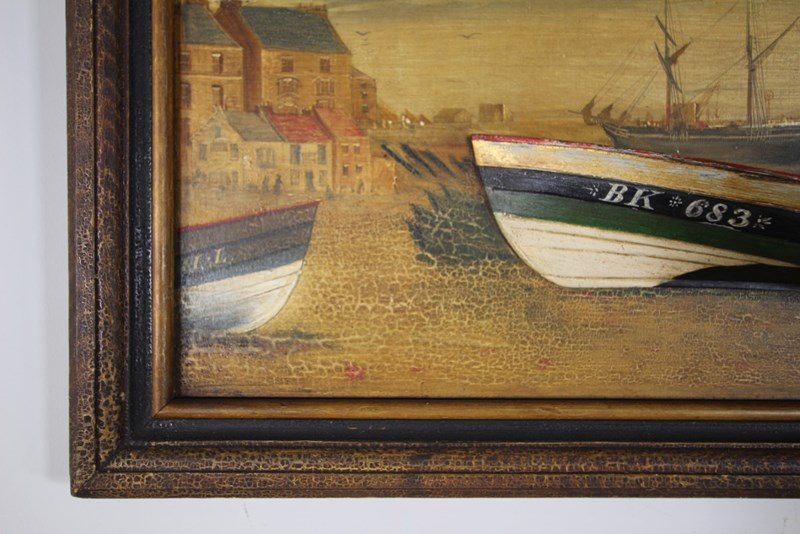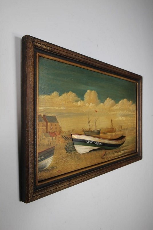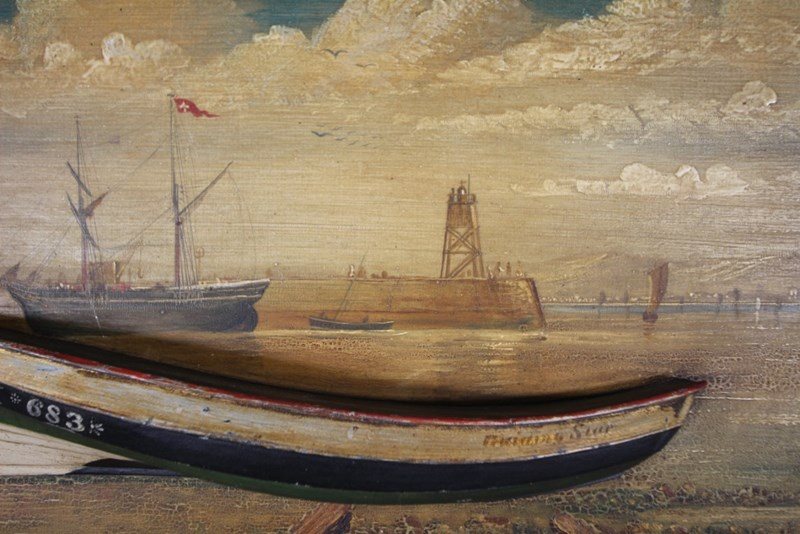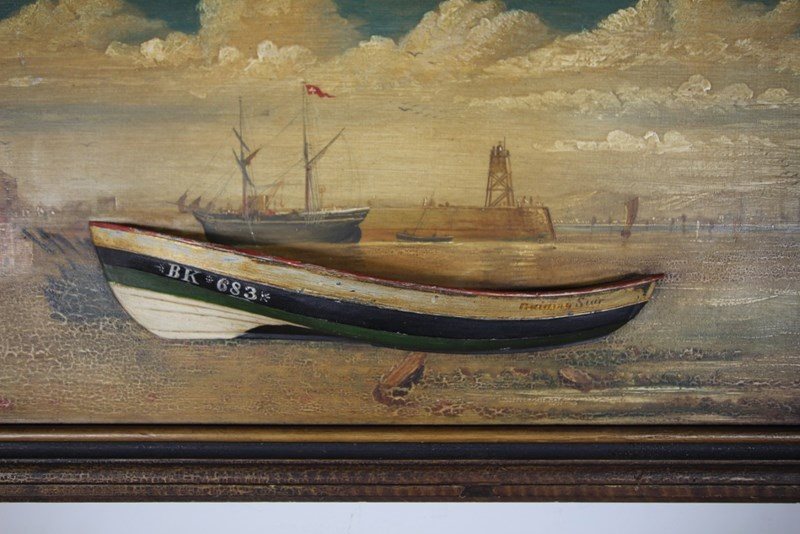 Antique 19Th Century Diorama Guiding Star Boat In Berwick Harbour