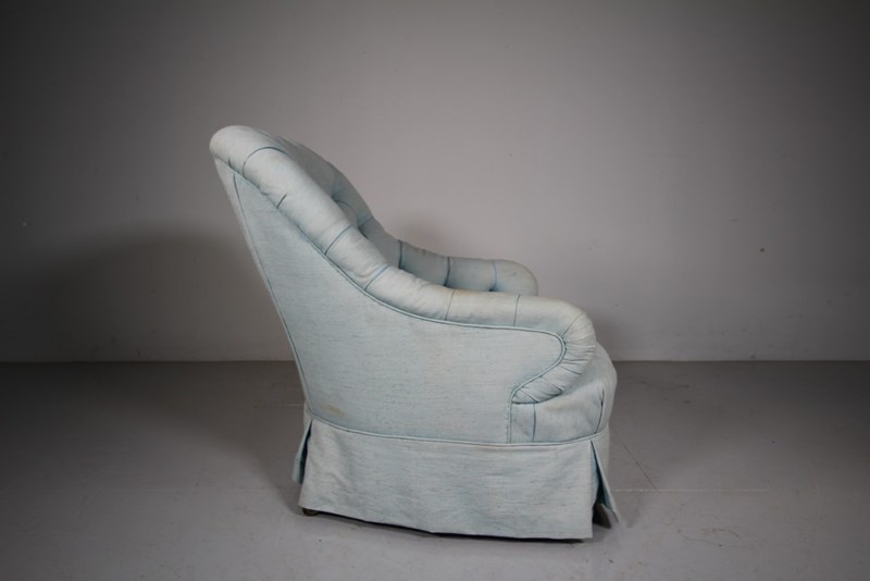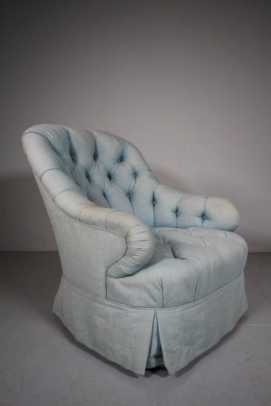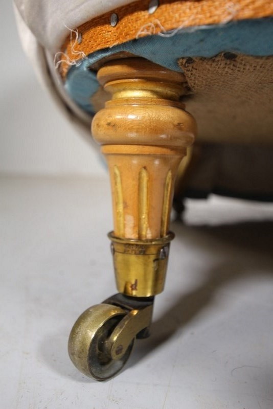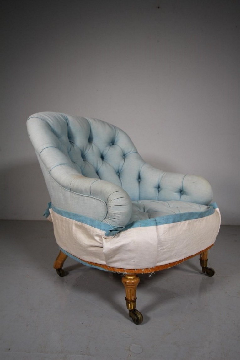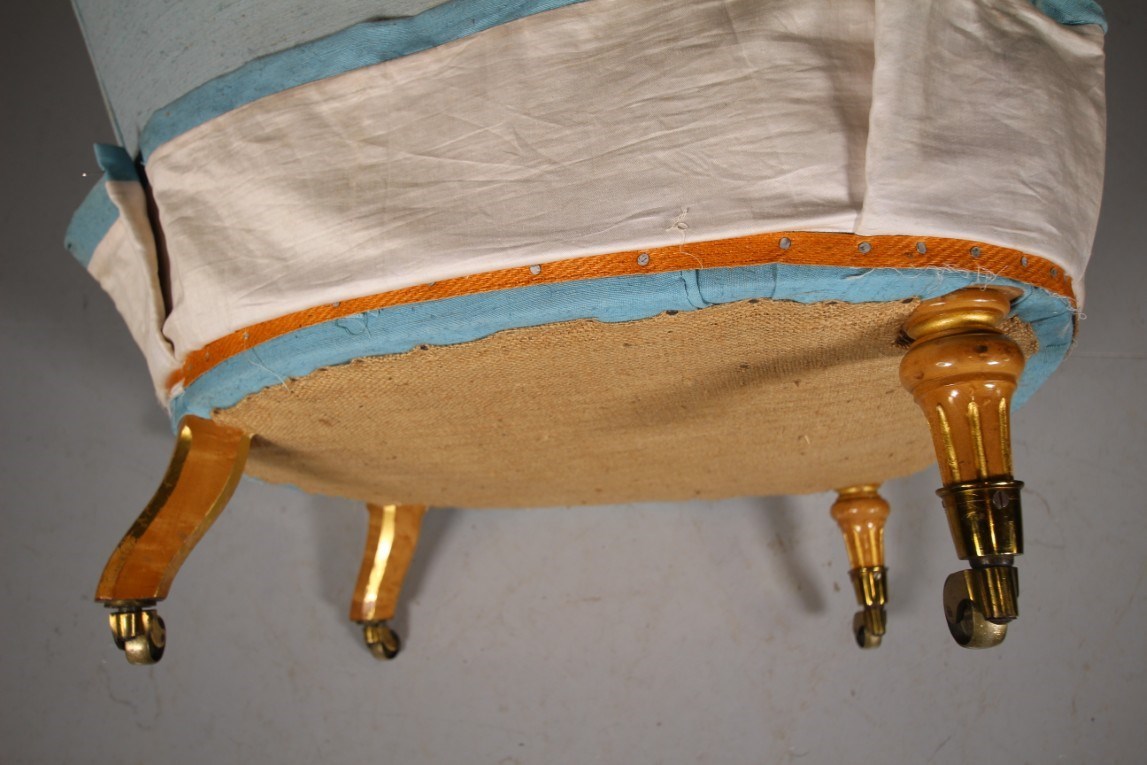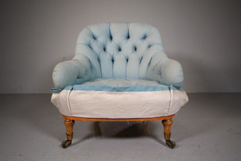 A beautifully shaped, large and comfortable English antique armchair, most probably by Holland & Sons, stands well on lovely satin wood turned and reeded front legs with original gilt highlights. Traditionally upholstered with all the innards in excellent, intact condition. Complete with the original Copes quality castors. Dates to around 1850.