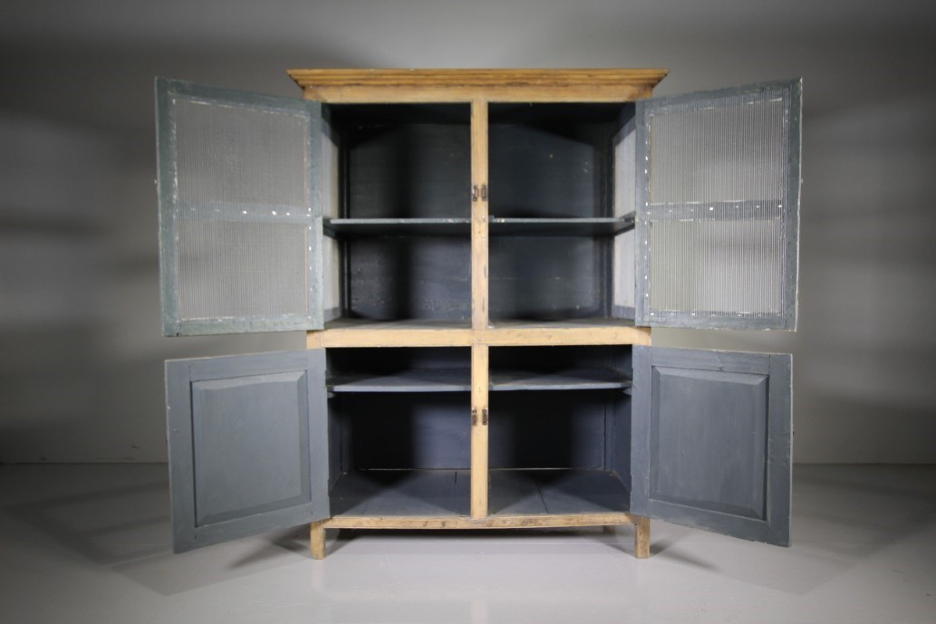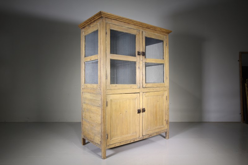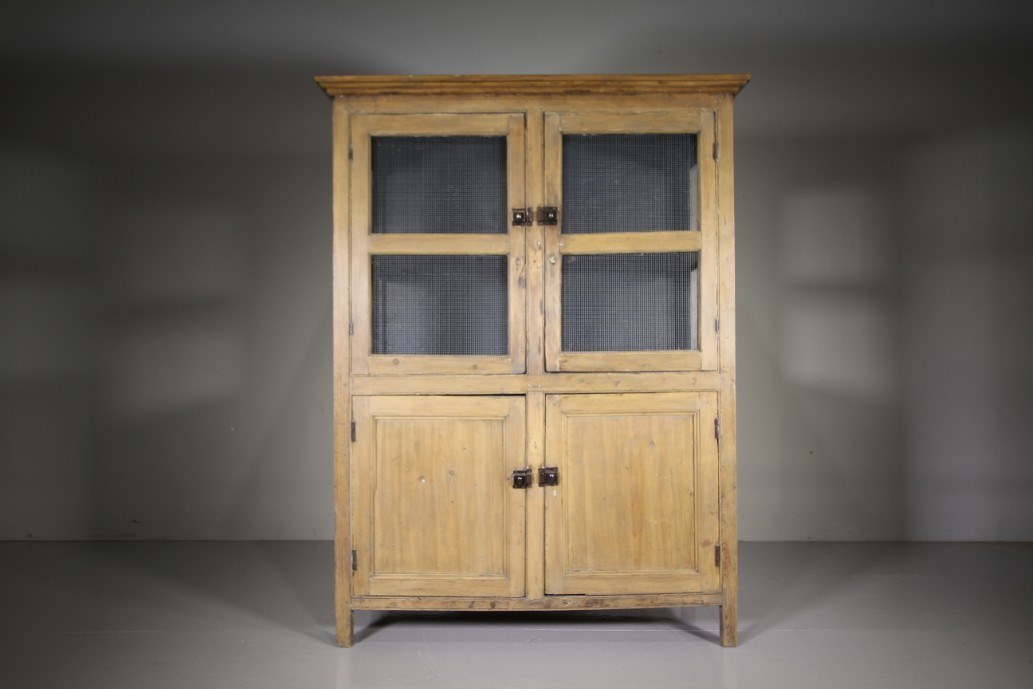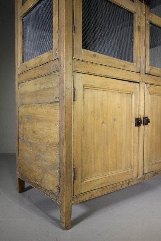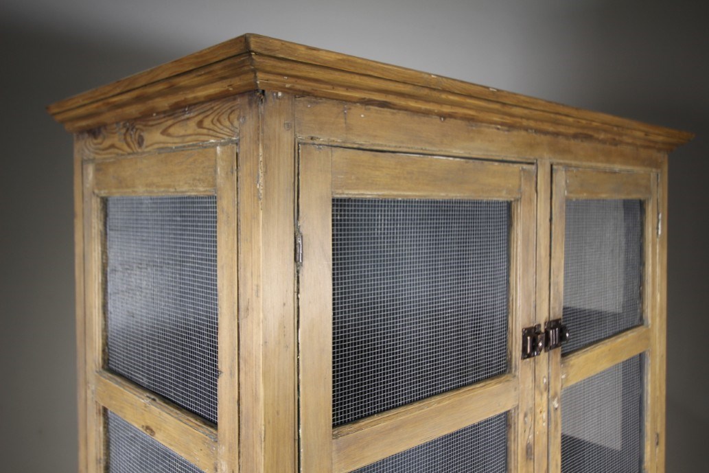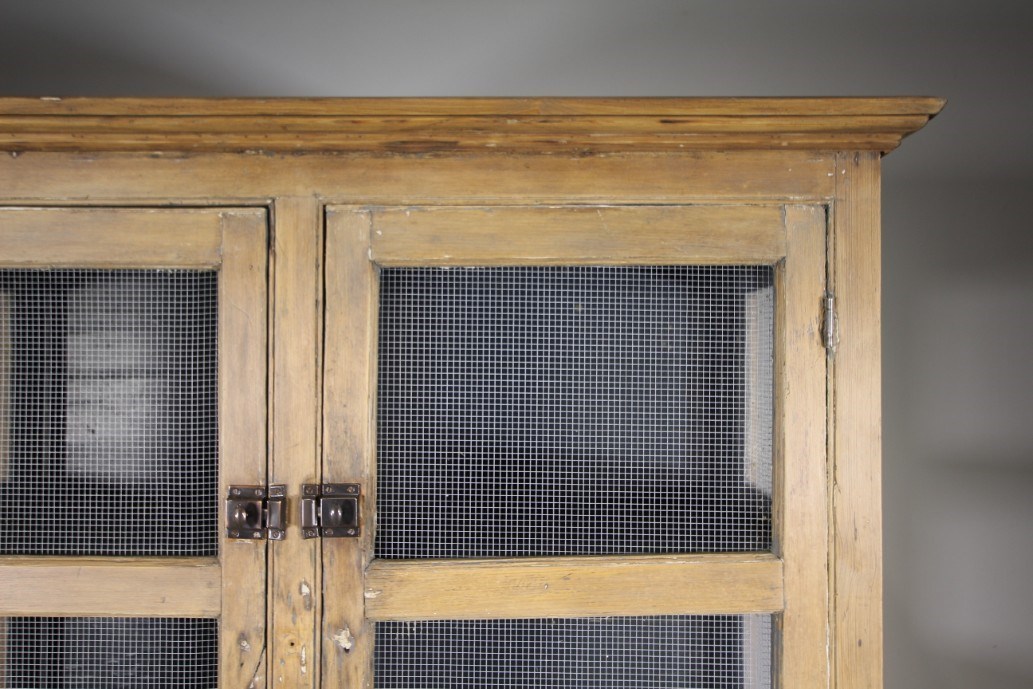 A lovely late Georgian antique pine food cupboard with mesh doors and side panels, to allow air to circulate within. Dates to around 1780, in very good condition with solid panelled pine doors below and with a moulded cornice t the top. Stands on square legs and is in a natural, scrubbed finish. The pine backboards are wonderful thick hewn original boards. Perfect for a free-standing kitchen or pantry as this antique pine cupboard provides a huge amount of storage. Flat on top, so pieces can be displayed or stored up there.