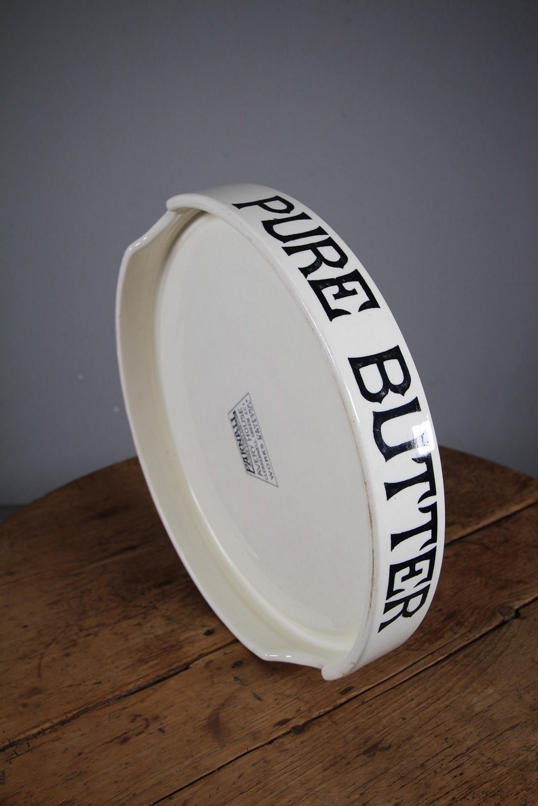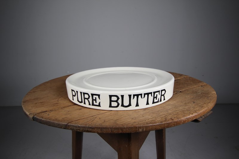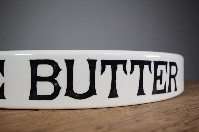 A superb large example of an English Edwardian antique creamware dairy pure butter display slab, in perfect condition and not a reproduction. Featuring lovely Pure Butter lettering in a black Gothic font and stamped by the maker on the underside: Parnall & Sons Ltd, Bristol. Antique dairy ware is becoming increasingly hard to find and this one being in such amazing original condition. Dates to around 1910.