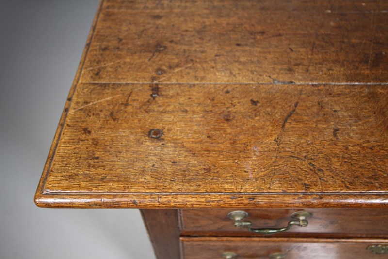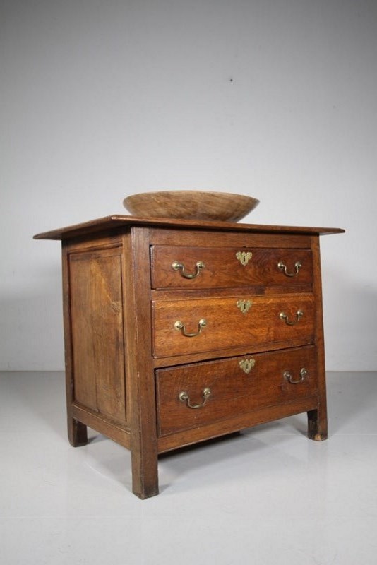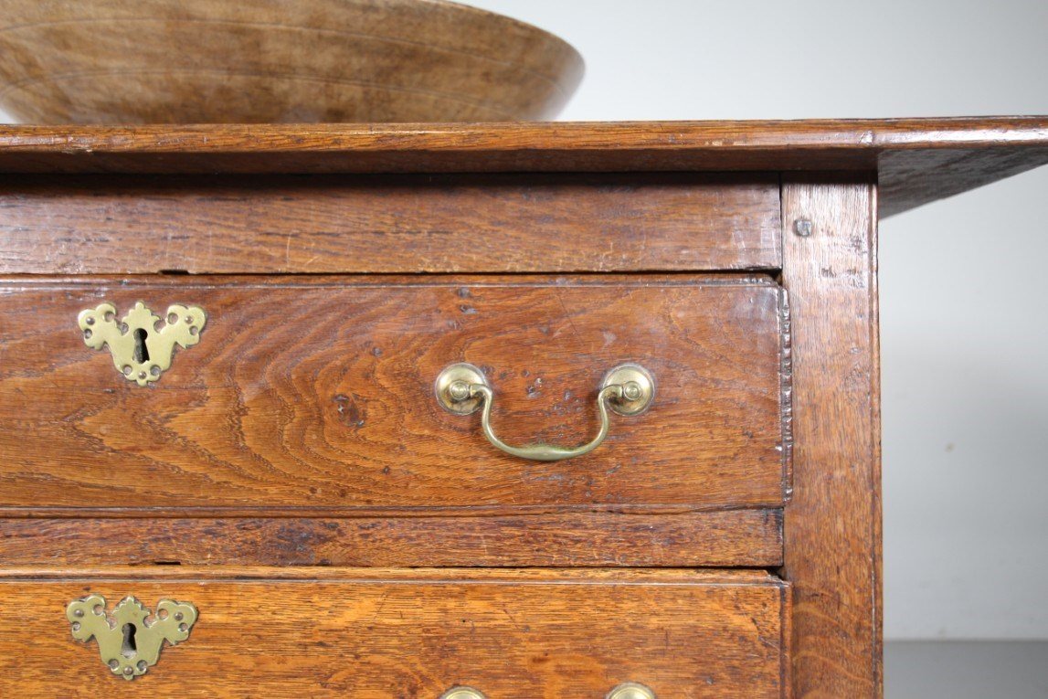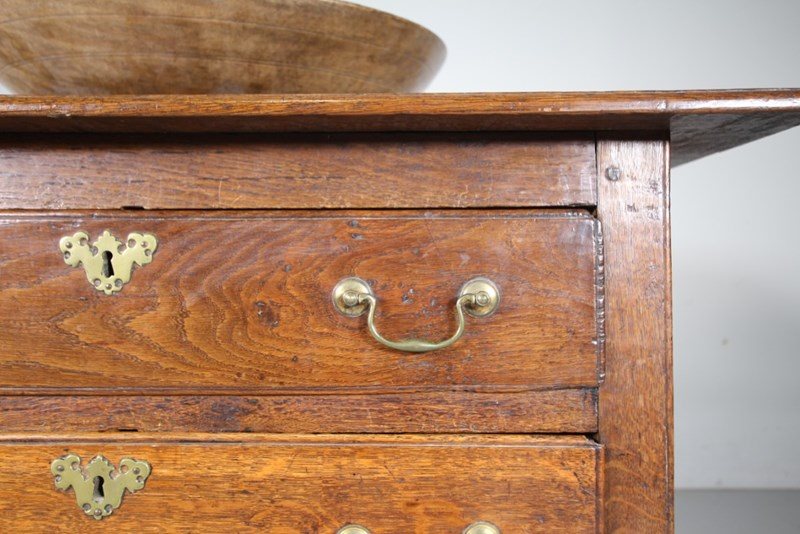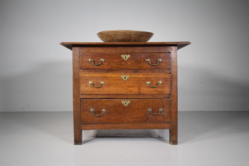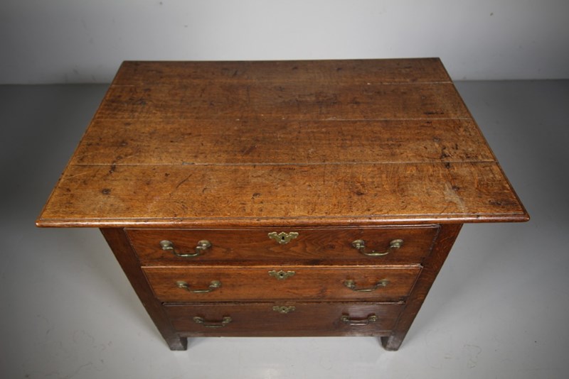 A beautiful early period oak antique chest fog drawers from Walee around 1750. An unusual design having the original oak overhanging table top which is nicely moulded on all four edges and pegged onto the chest. Three long oak lined drawers also have moulded edges with original brass ware swan neck handles. In superb condition and a lovely original colour. Stands on oak stile legs with the sides having field and raised panels. Finished on the back, so can be away form the wall if needed. A fabulous, honest early Welsh antique oak chest of drawers.