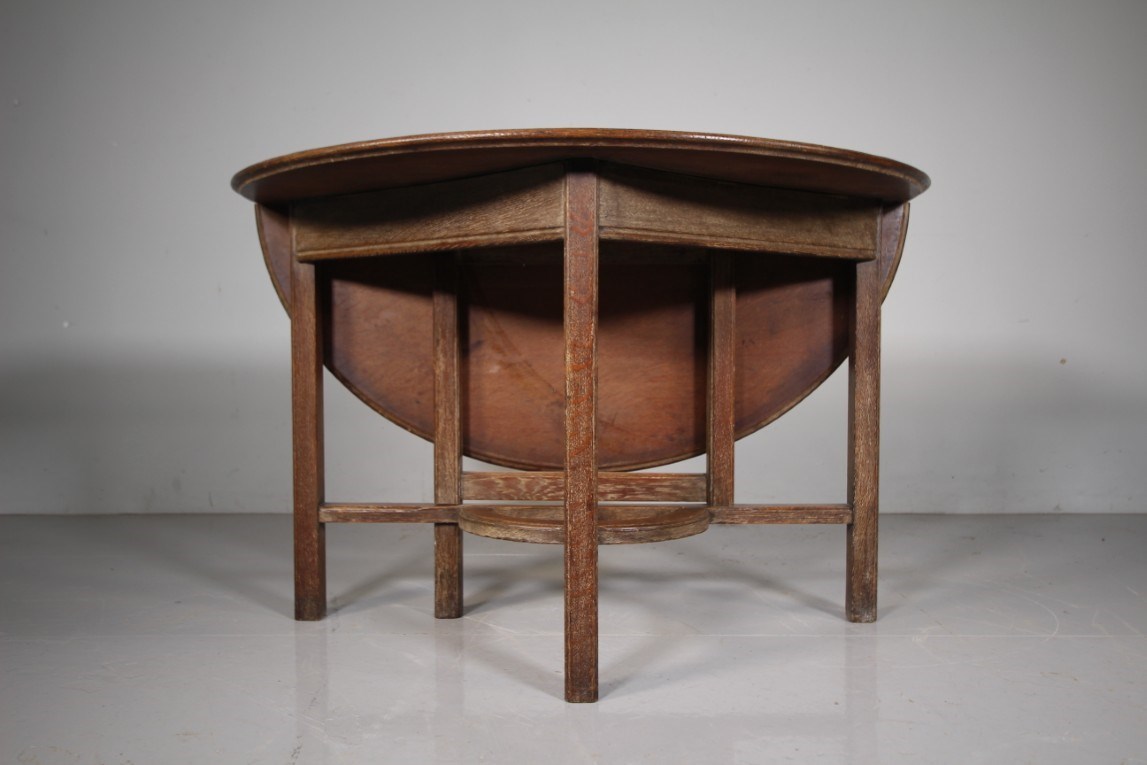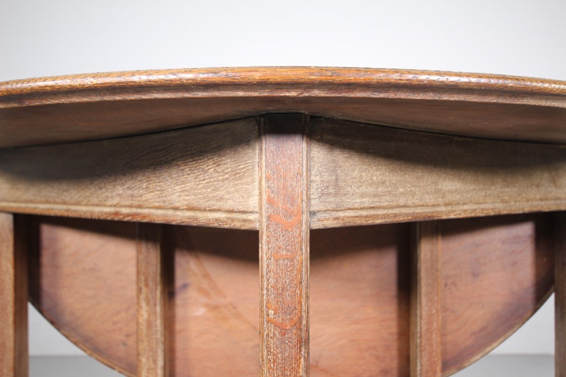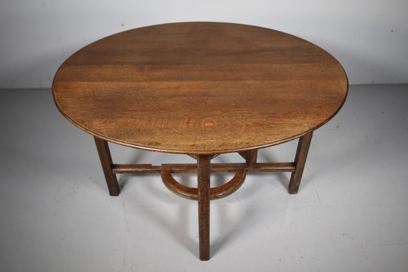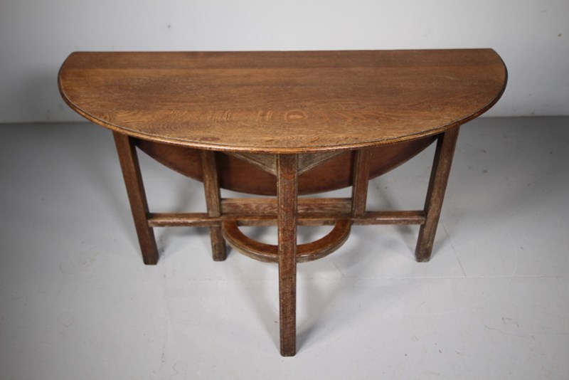 1920’s Cotswold School Oak Dining / Side Table A high quality English solid oak dining table that can also be used as a side table, by The Bath Cabinet makers. Made in solid oak which is a lovely even colour. When up to use as a dining table, the table top is oval in shape. When the table drop is folded down, the table becomes a neat demi-lune side table. In excellent, clean condition. 54cm deep when closed.