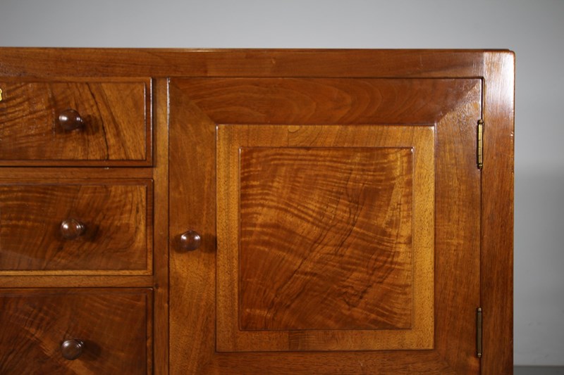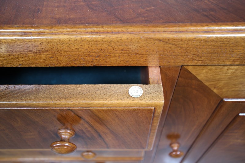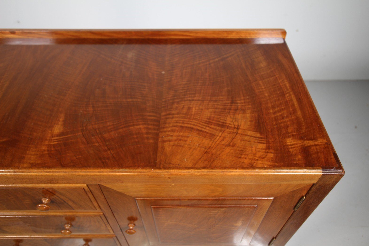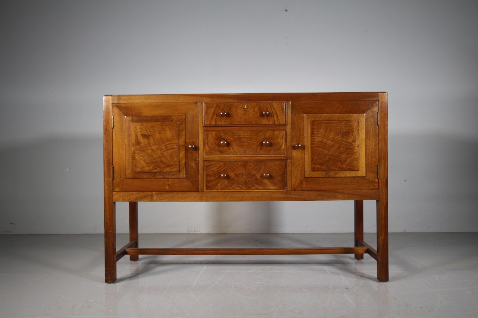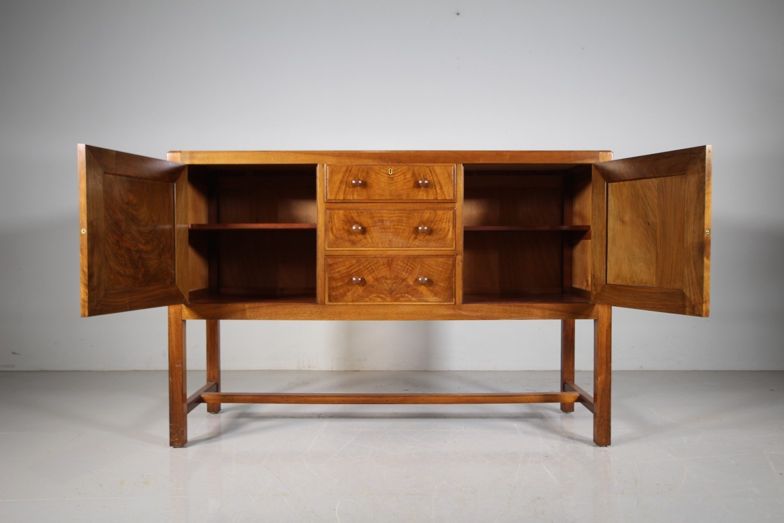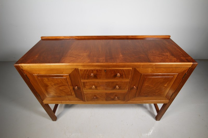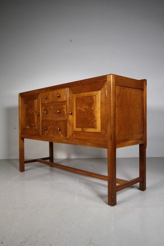 1920’s Heals of London Walnut Dresser – Labelled A very good quality antique walnut dresser / sideboard by Heals of London. In such good, clean condition and still in the original rich finish. Featuring three central and graduating in size drawers, they all have stepped raised drawer fronts with the original handles, in the top drawer is the inset Heals makers label. Flanking the drawers are two cupboards with matching fronts and handles. Inside the cupboard are the original wooden storage shelves. In superb condition throughout, a lovely model, quite rare to find in walnut. DimensionsHeight: 94cm (37.30")Width: 137cm (54.37")Depth: 47cm (18.65")
