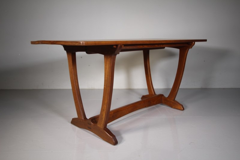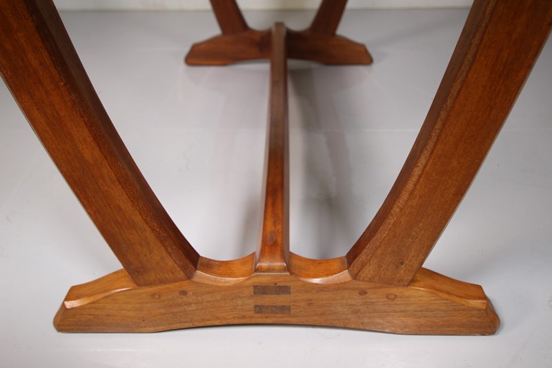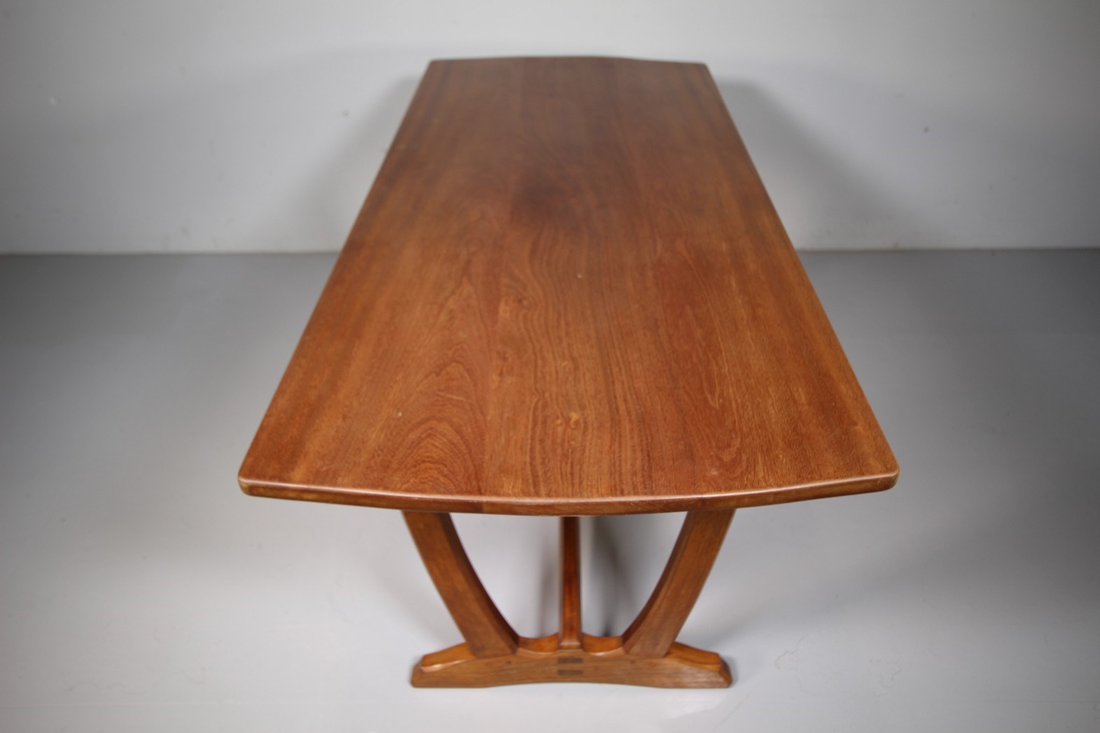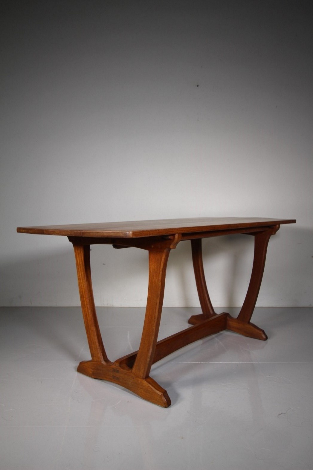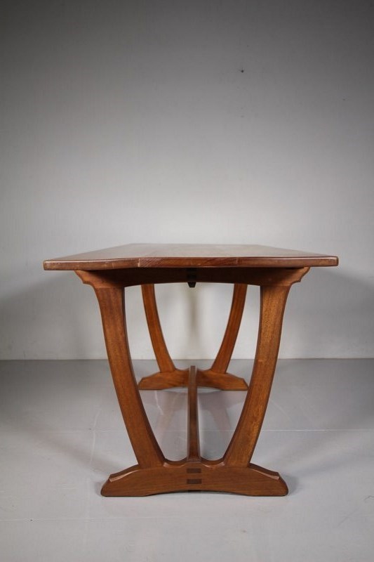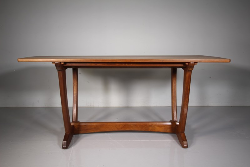 A high quality solid walnut dining table that is a wonderful shape, a Gimson design dating to the late thirties. The large walnut dining table table top is one a shapely table base that has U shaped end supports that finish on sledge feet, the ends are then connected by a flat stretcher. All pegged construction with lovely exposed mortice decorations. In excellent, clean and original condition. Whilst a design made for dining, this Gimson design table would also make an ideal desk.