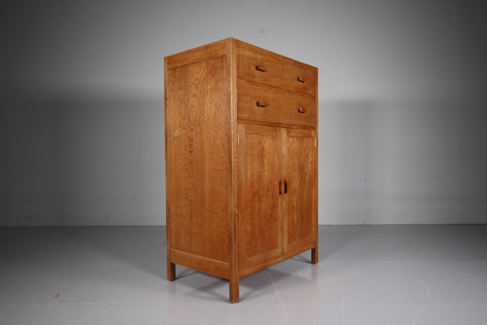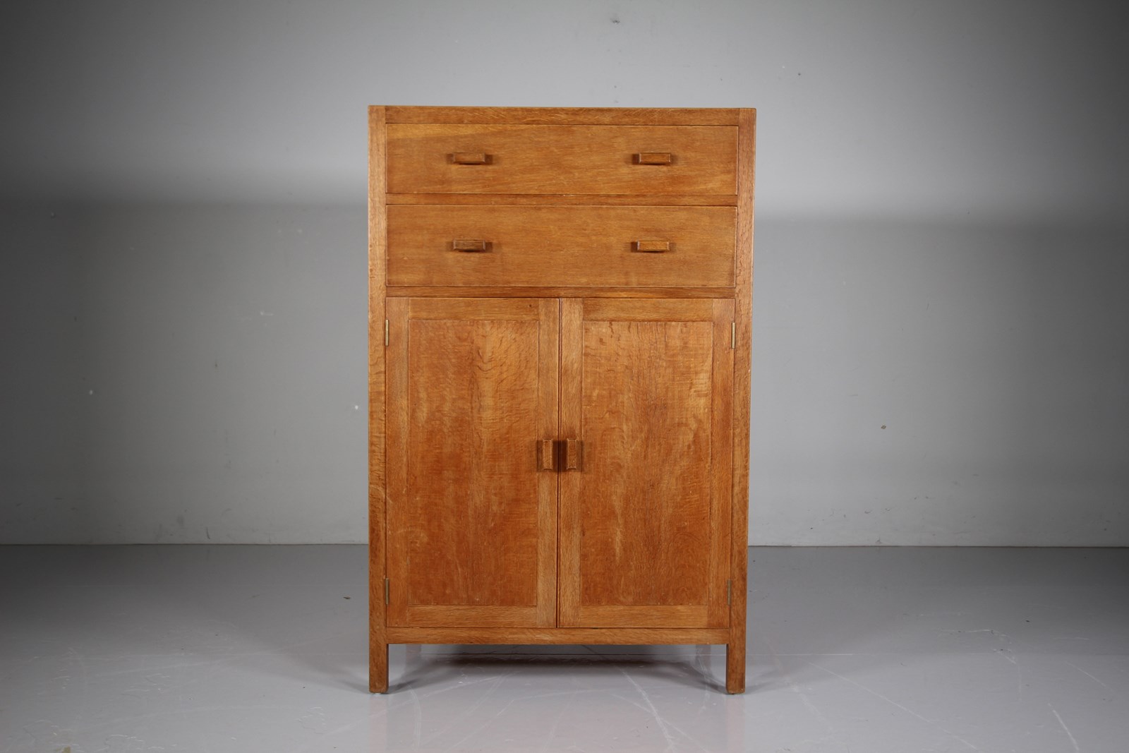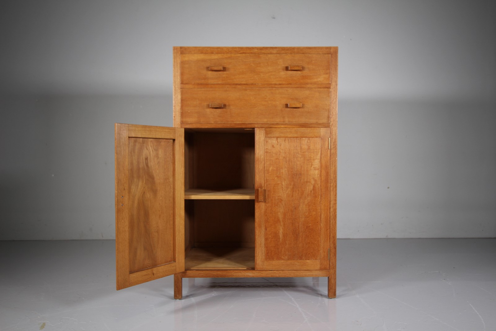 A good quality Heals of London oak tall boy cupboard from the early thirties. Featuring two long and graduating drawers, both run well and have the original oak oblong handles, beneath the drawers are two panelled cupboard doors with matching oak handles. Inside one of the doors the large Heals makers label is inset, along with a single oak storage shelf. In very good, clean and original condition and all a lovely colour.