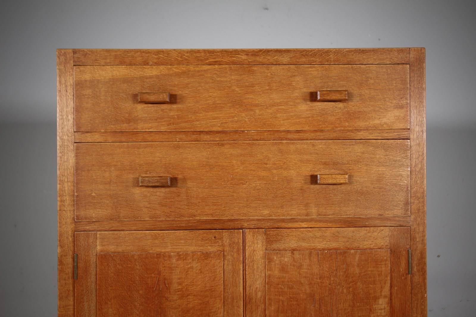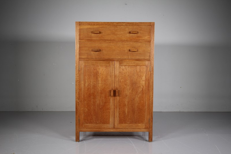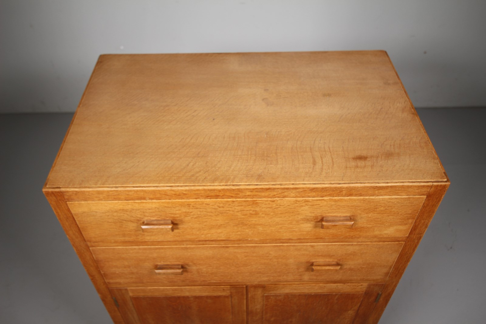 A good quality Heals of London oak tall boy cupboard from the early thirties. Featuring two long and graduating drawers, both run well and have the original oak oblong handles, beneath the drawers are two panelled cupboard doors with matching oak handles. Inside one of the doors the large Heals makers label is inset, along with a single oak storage shelf. In very good, clean and original condition and all a lovely colour.