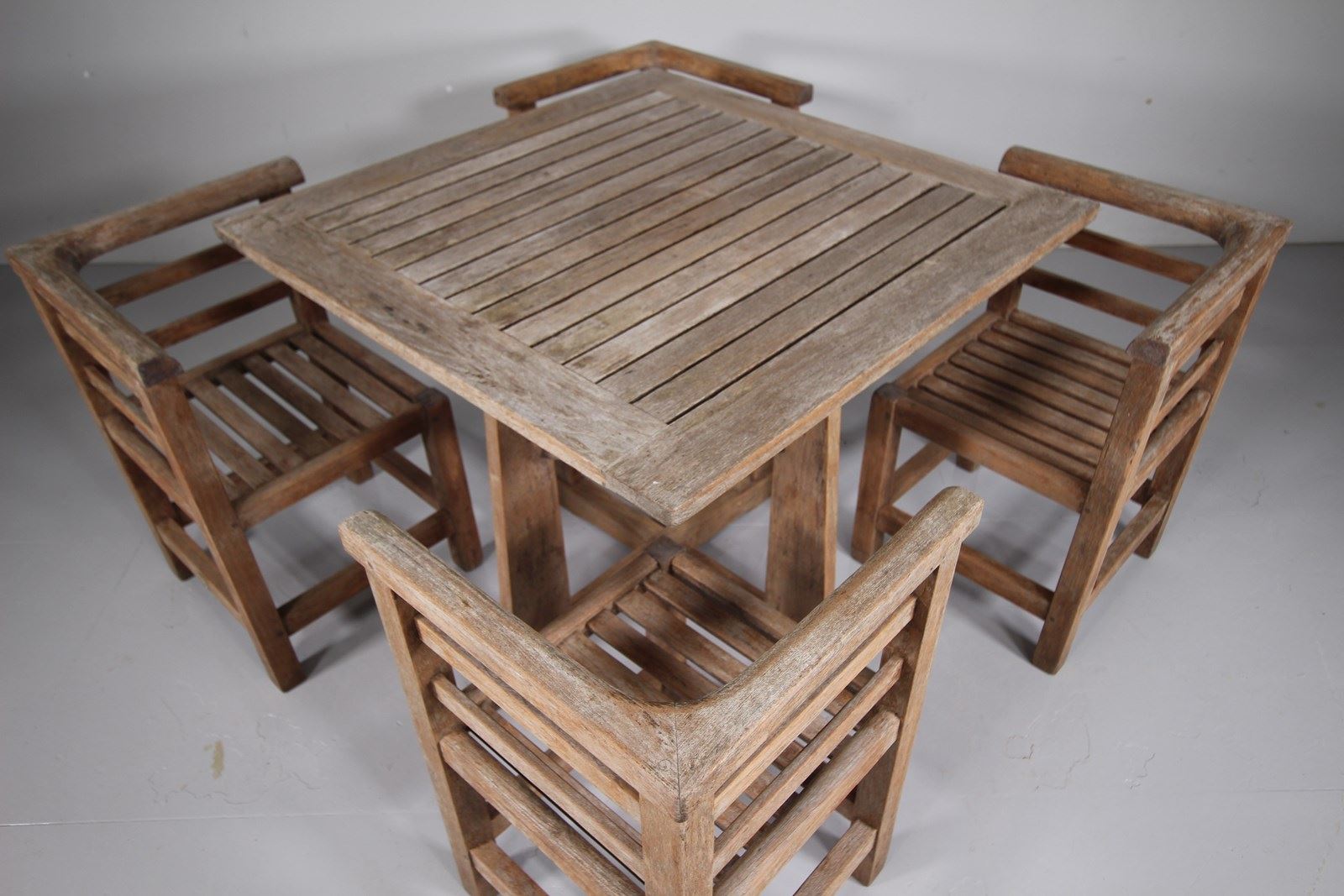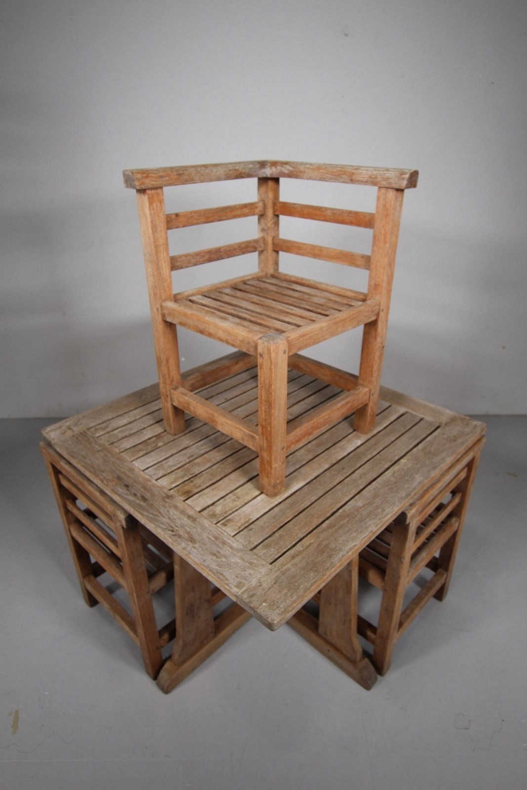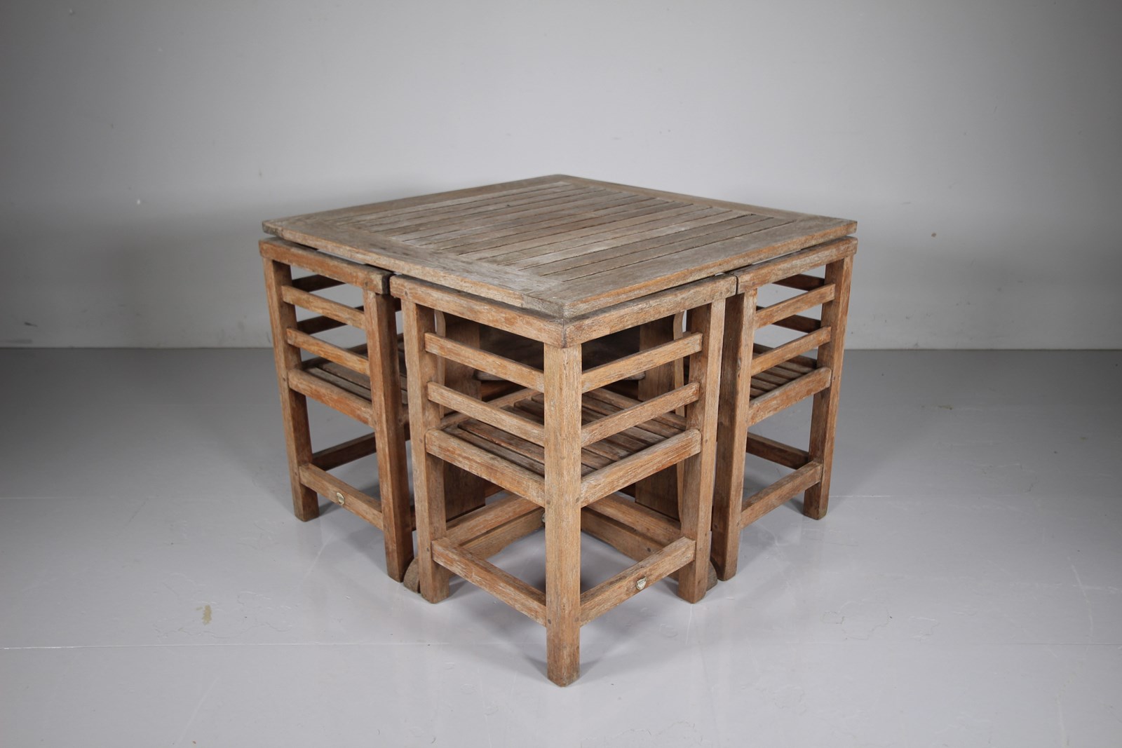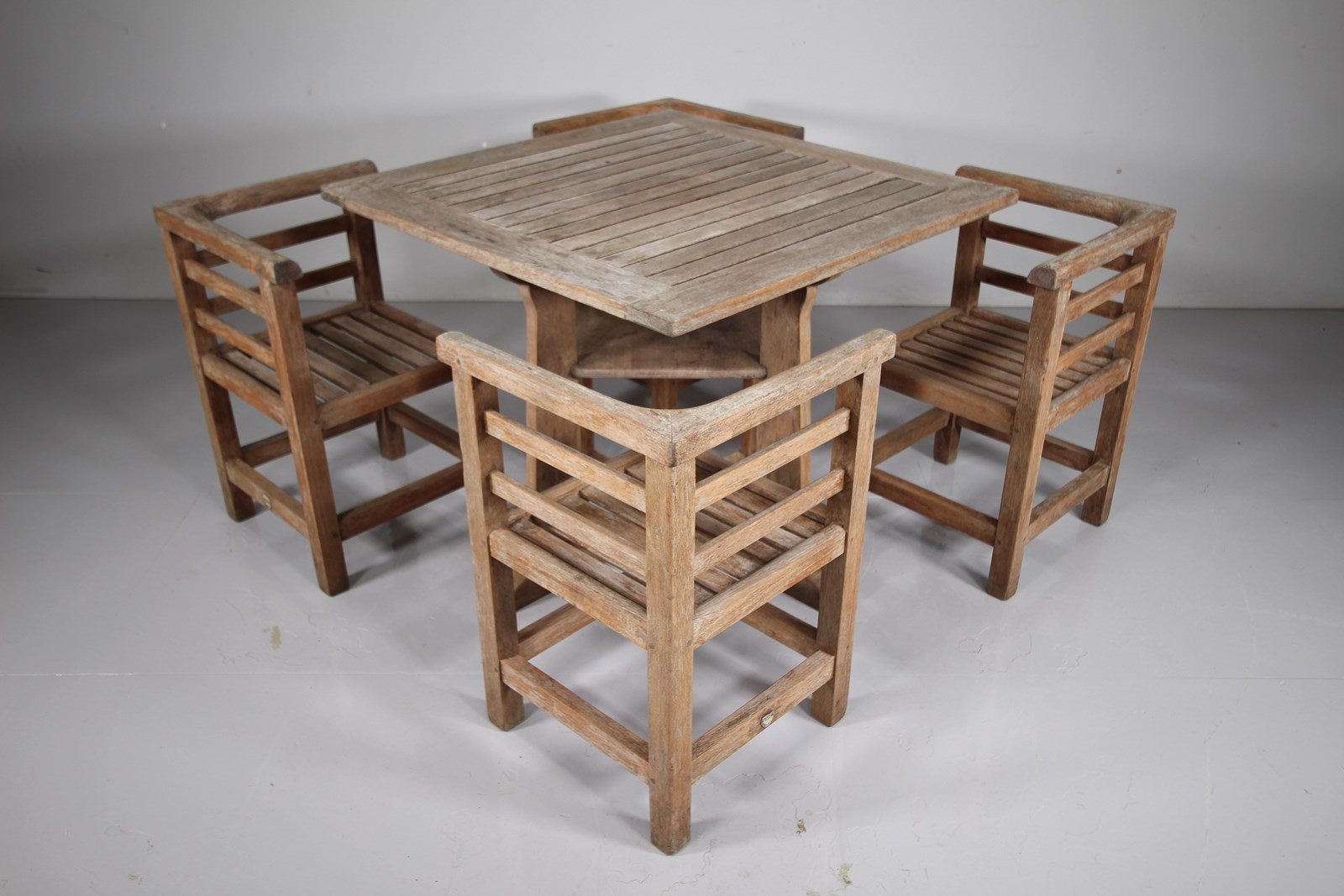 A very good quality, solid teak thirties garden dining set by Lister, Heals of London then retailed them. This set is in such good, complete and intact, solid condition, obviously stored inside for much of its life. The square dining table has a slatted table top with an under shelf below, whilst the four dining chairs fit snugly under the table when not in use to form a neat cube. Complete with the metal makers label. Would silver down in colour if kept outside for a while.