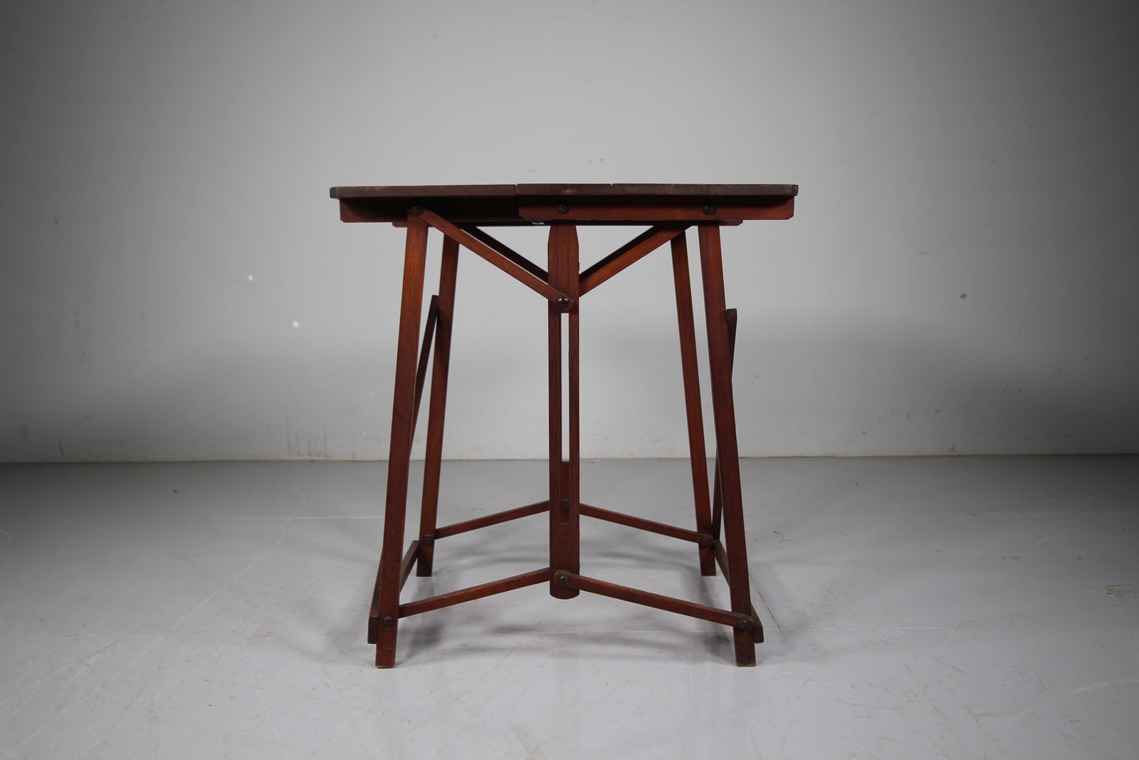 This is a very decorative antique artists table that is a slightly larger model than most and quality made in quality teak. In great original condition, all working and folding well, sturdy when as a table. Stamped by the maker Hatherley. Designed to be carried and set up outdoors to sketch / paint, yet makes a lovely side table for indoors too.