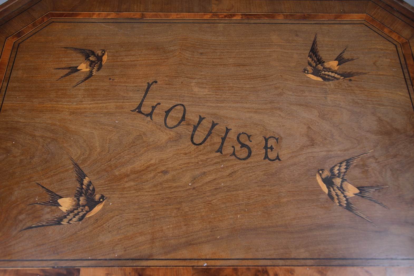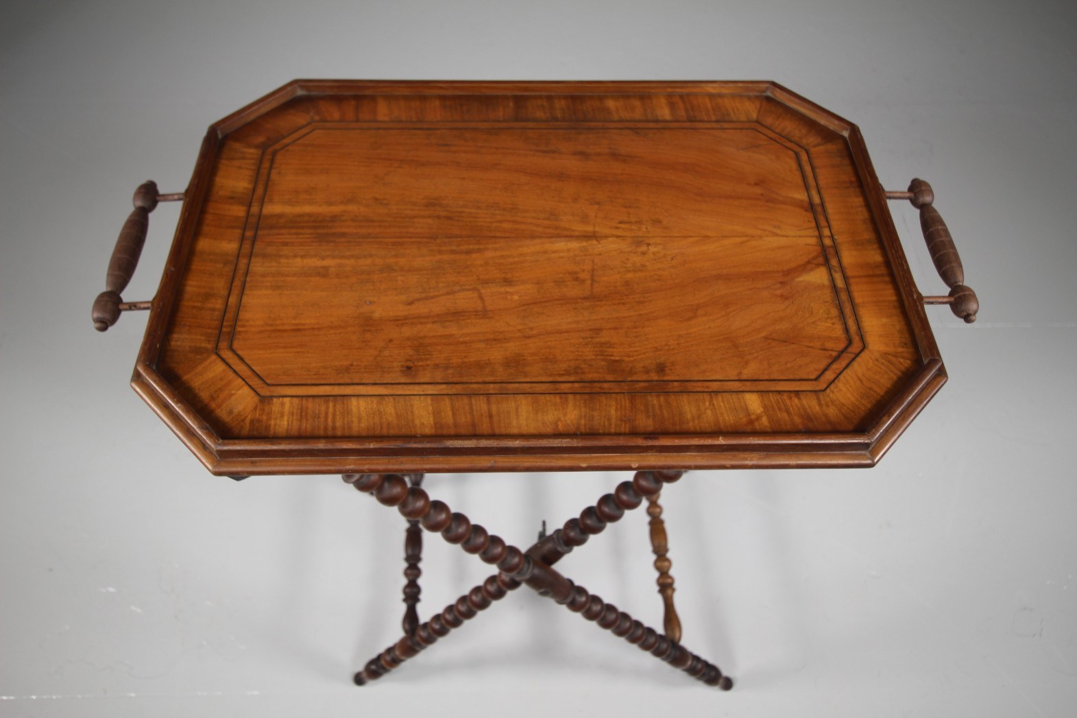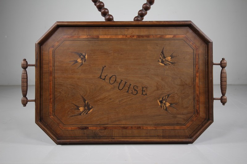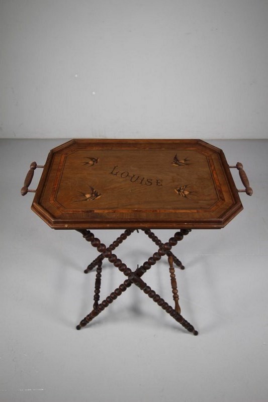 A lovely English antique tray table, the shaped fruit wood double sided tray top is nicely shaped and cross banded and inlaid with decorative swallow birds and the name, Louise. In excellent condition, original carry handles, the tray is plain on the other side. The tray table top sits upon a bobbin turned fruit wood table base, this can fold when not in use. High quality made, in excellent condition. Do you know a Louise? Dates to 1870.