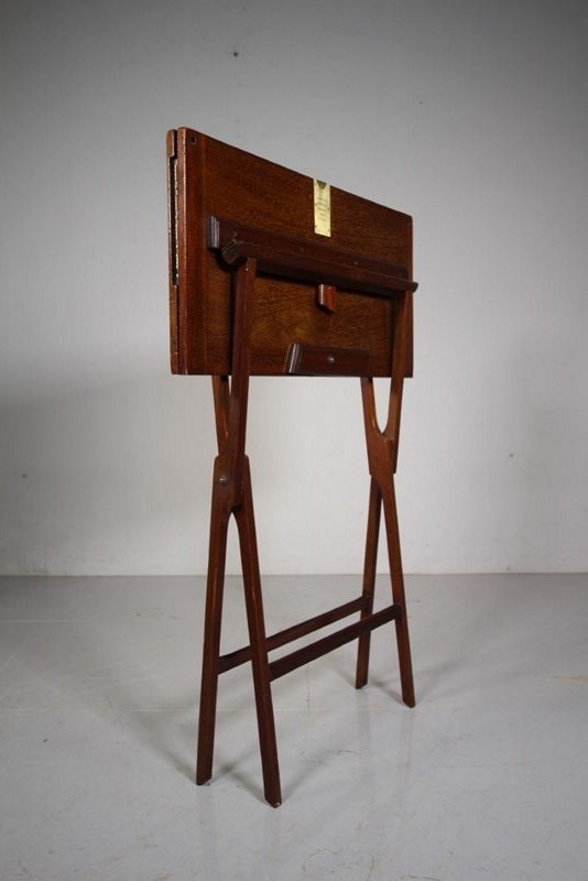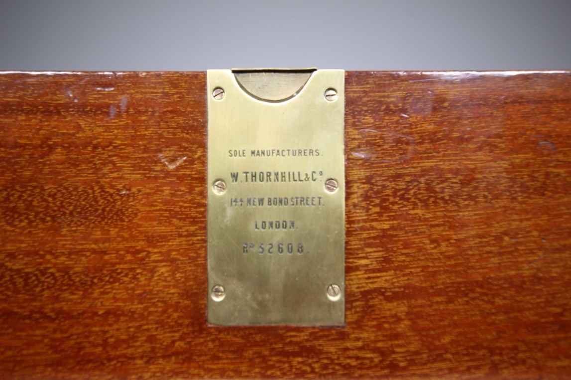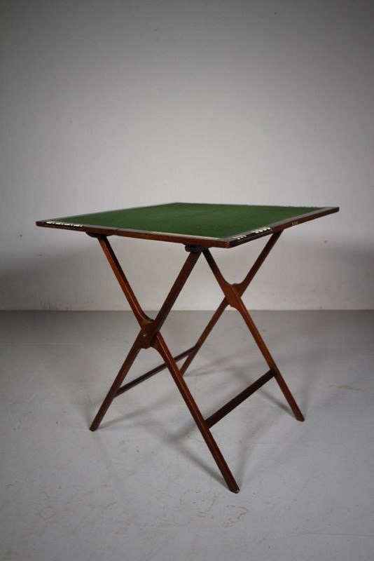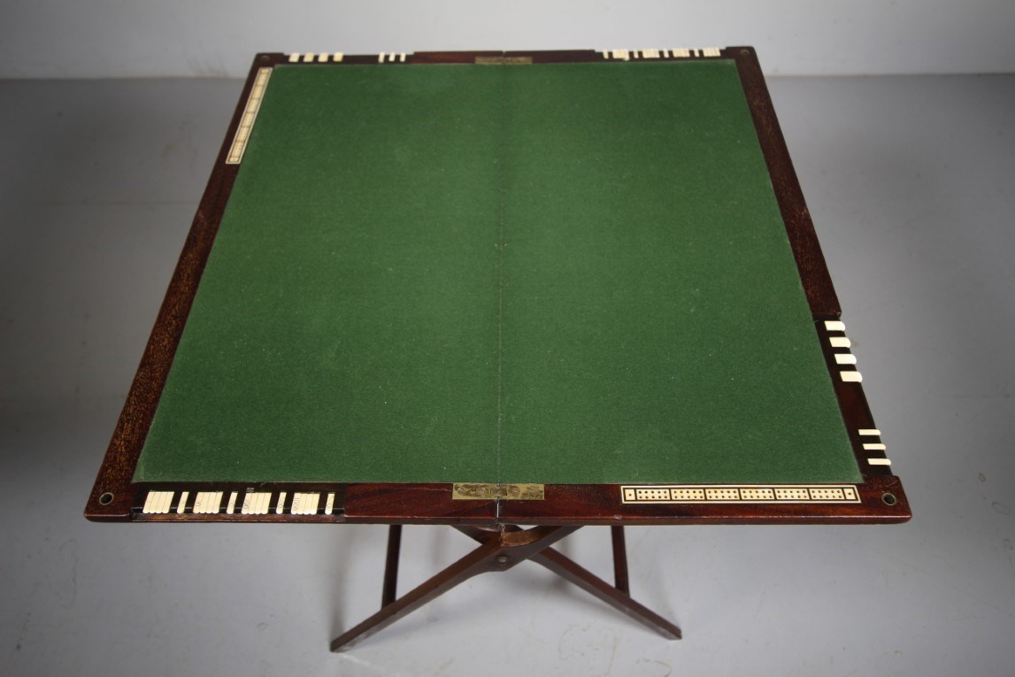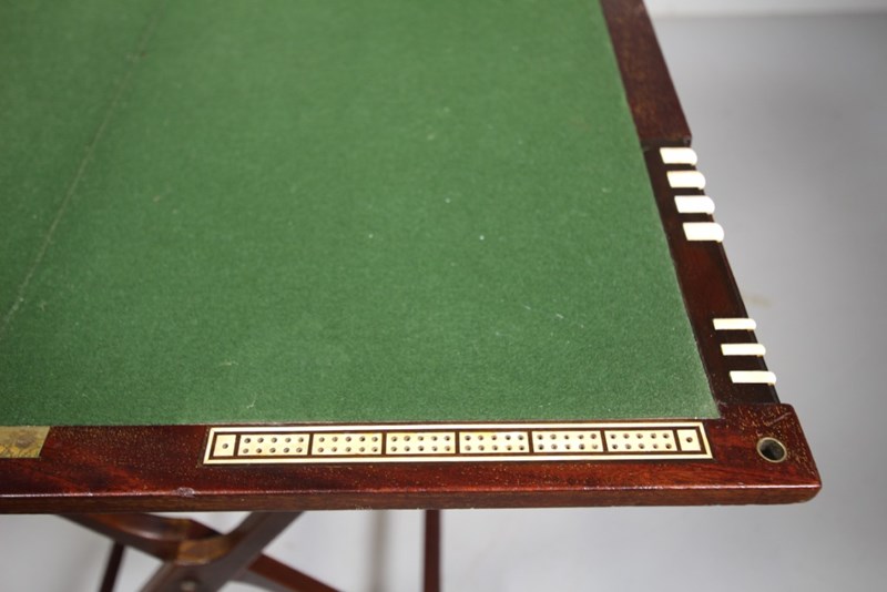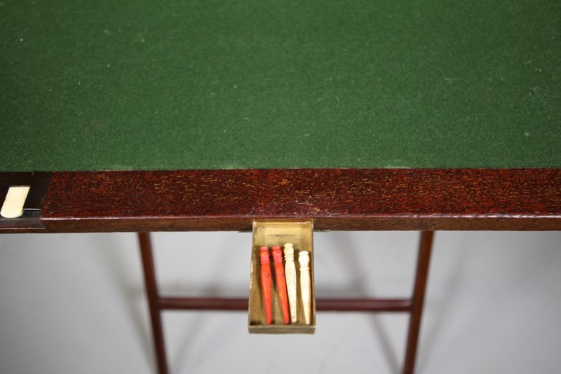 A top quality English antique mahogany card gaming table by Walter Thornhill of Bond St, London. It is in amazing condition, complete with the original bone pointers and markers and even the small brass slide out drawer to house the marker pins. Folds up well with the green baize in intact and clean condition. A superb English antique card games table for Bridge, Cribbage and many more.