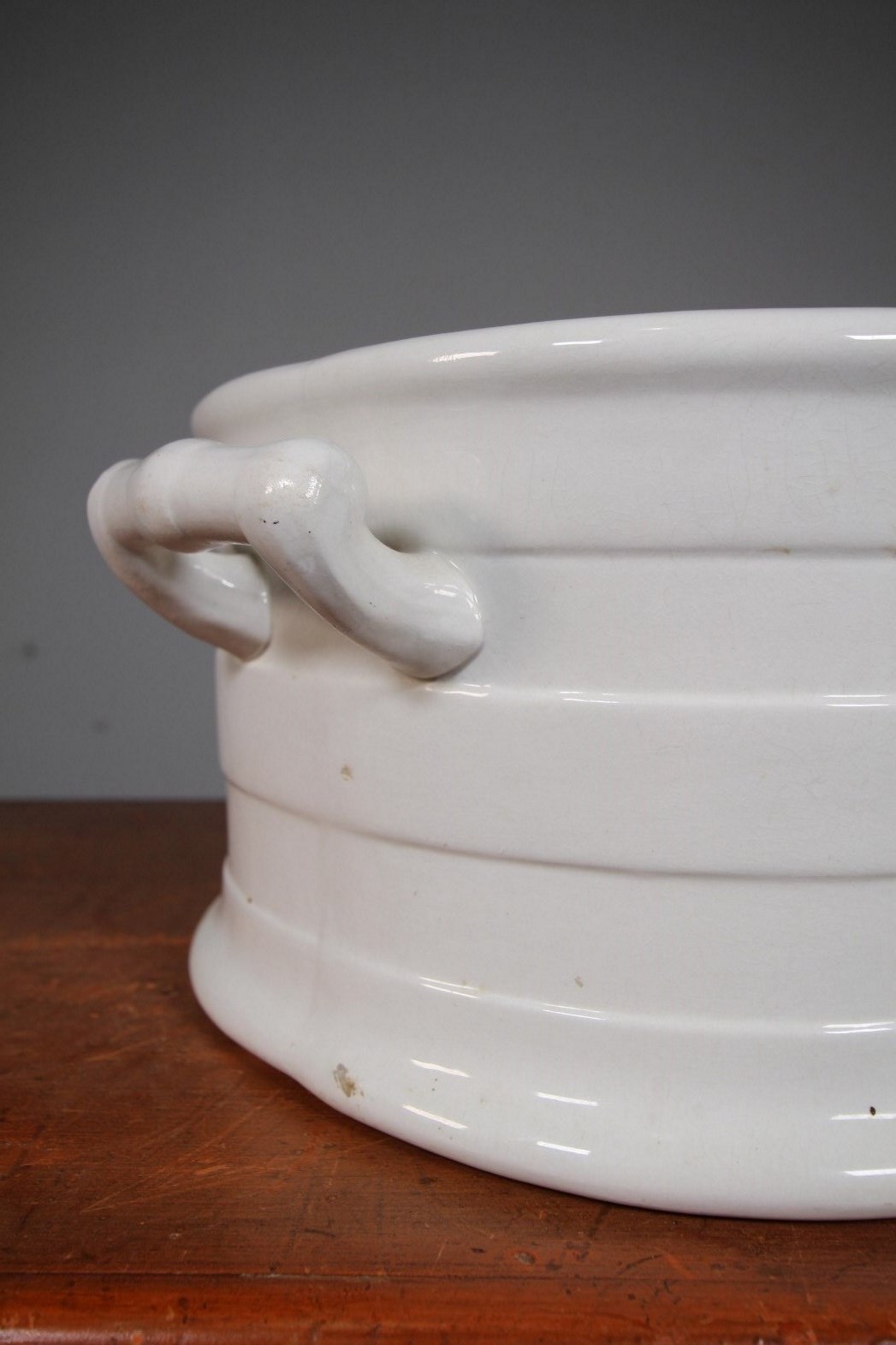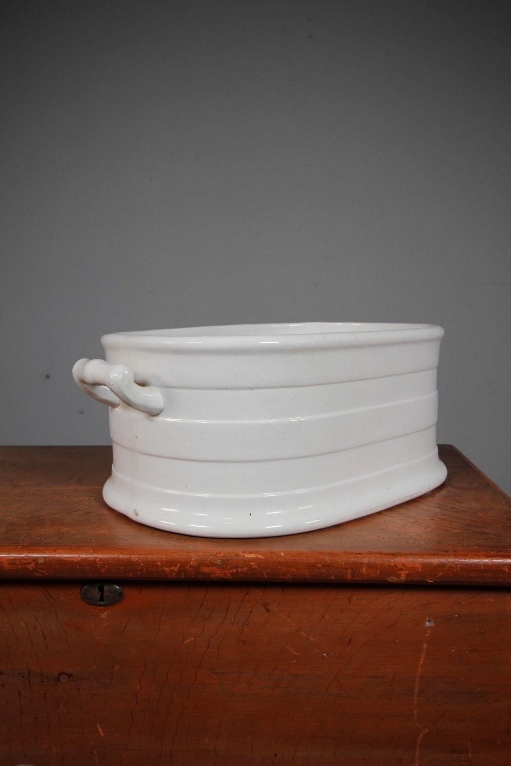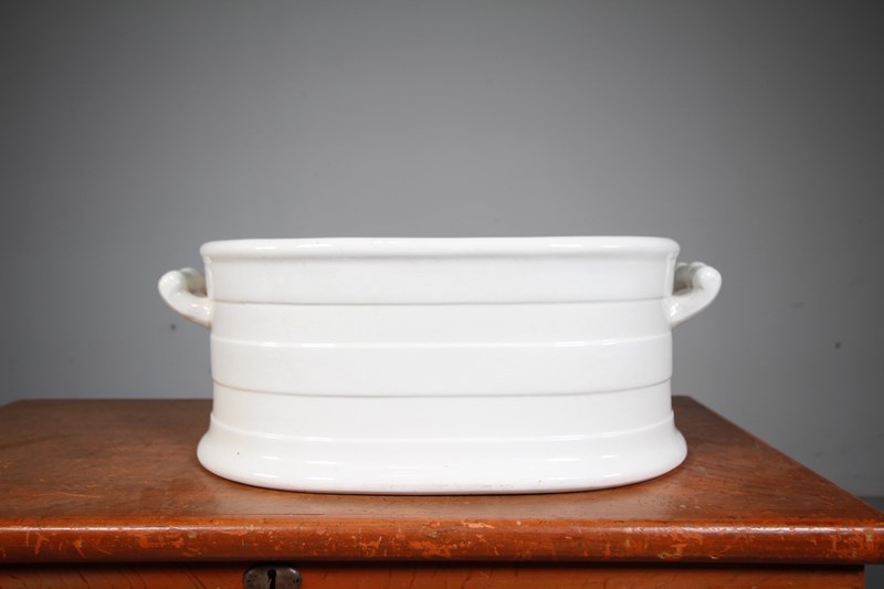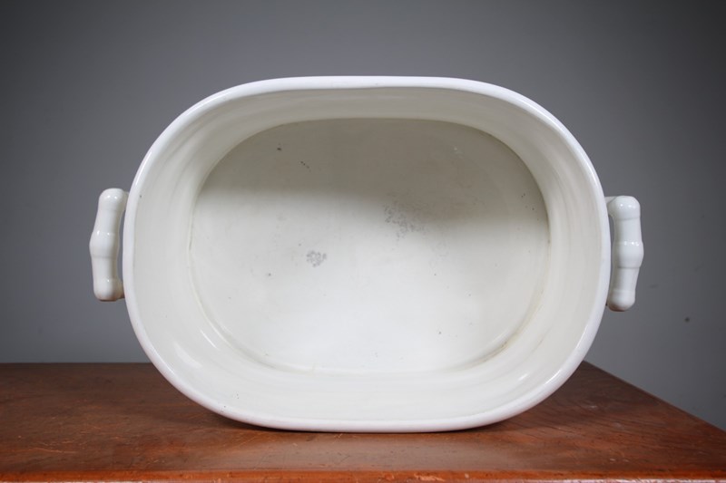 A beautifully shaped and banded English antique creamware foot bath with shaped carry handles to each side. A lovely smaller model with the white banded design that flares out to form a foot rim. Very good quality and in amazing condition with no cracks and colour blemishes, just a tiny chip to the underside of the foot rim. A very original example with no restorations. Perfect for floral displays, indoor plants as well as feet!