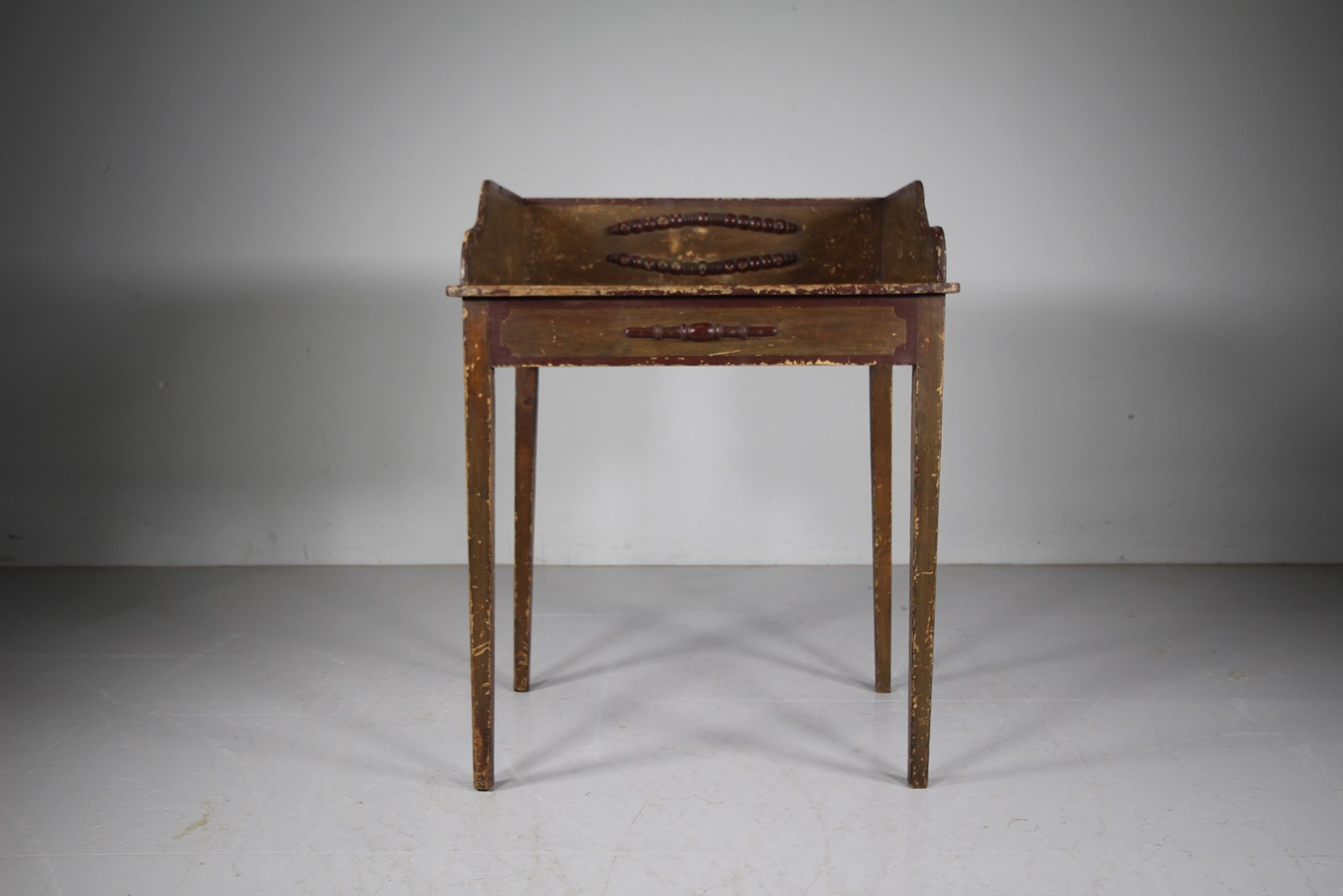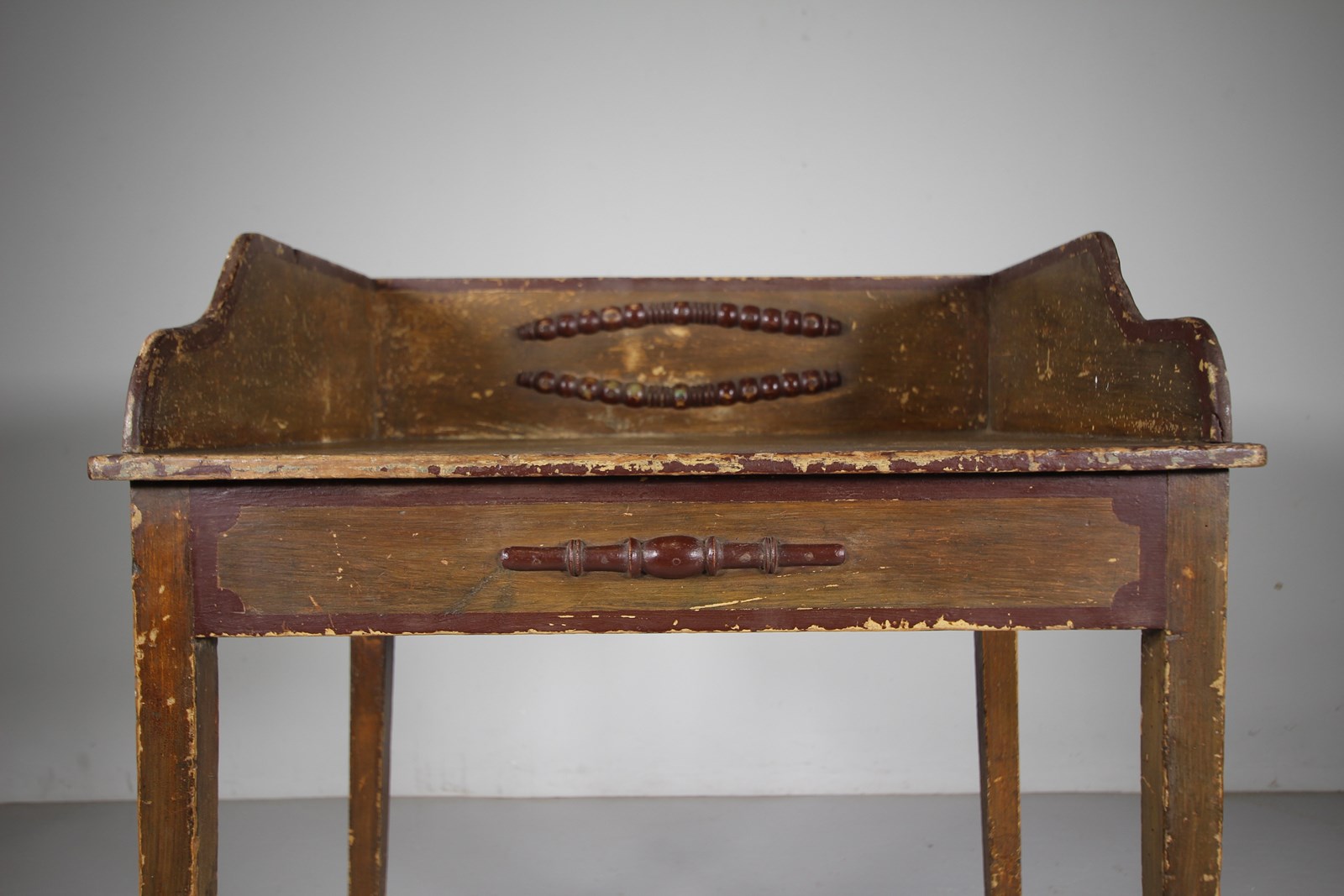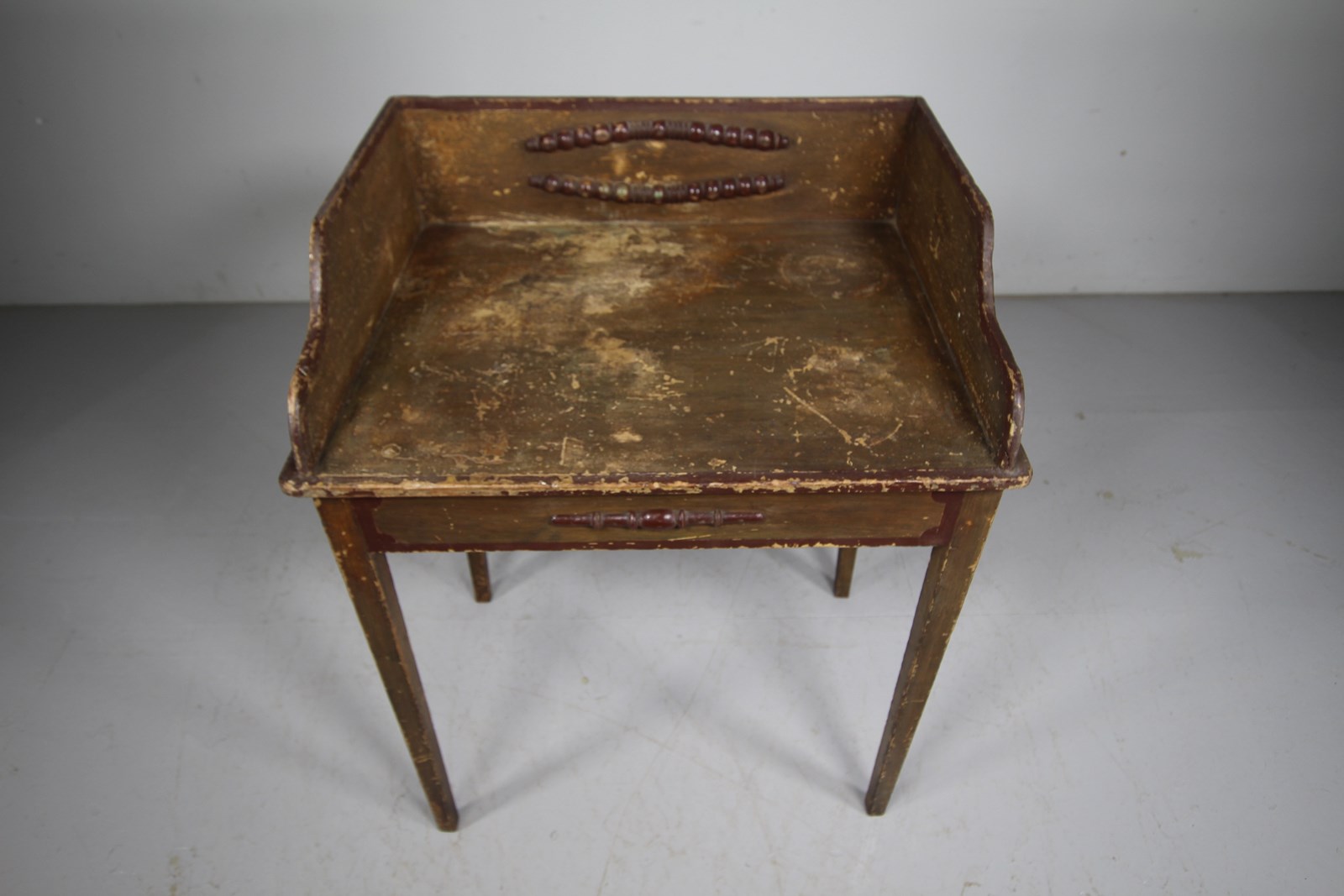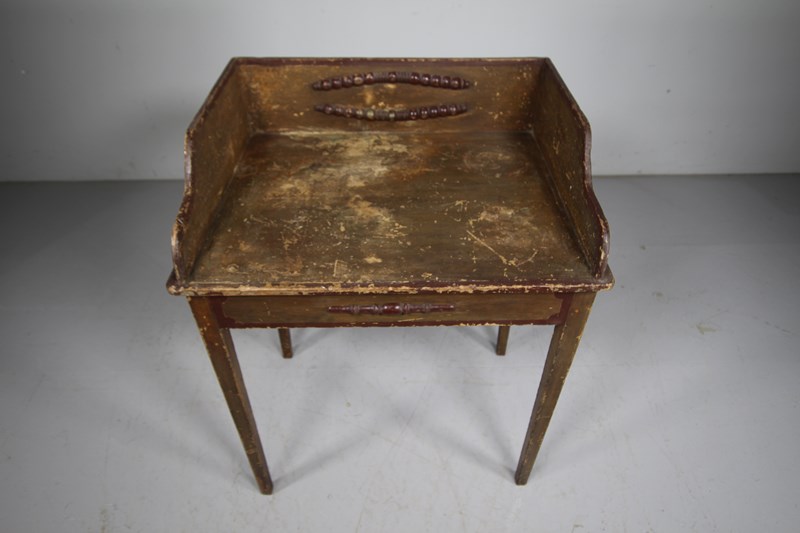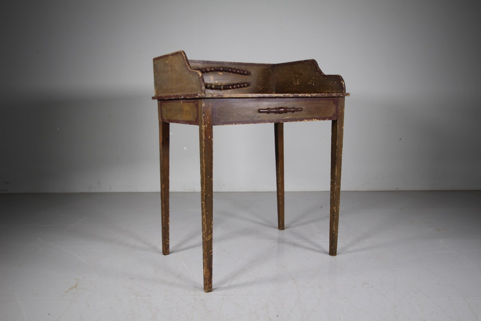 This is a lovely English antique original painted pine side table that even has its original line decorations to the decorative up stand back, front and sides. A beautiful drab paint colour and decorated with shapely mouldings to the front and back. In very good, solid condition, a lovely English piece of original painted pine antique furniture. Height to the work top is 77cm.