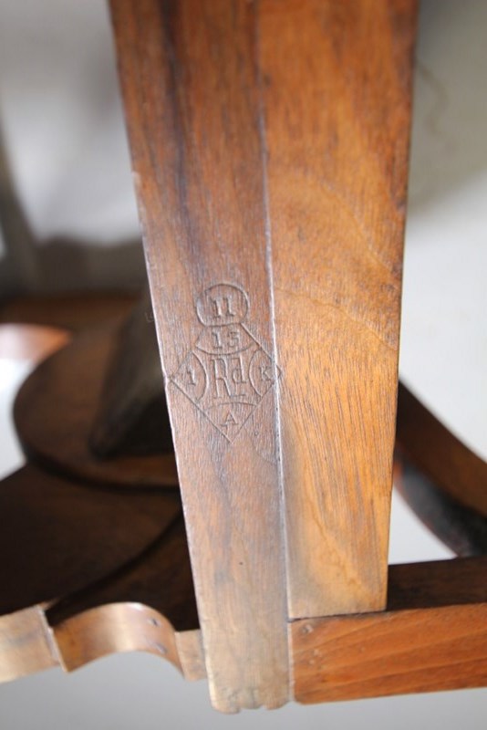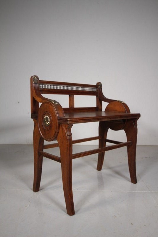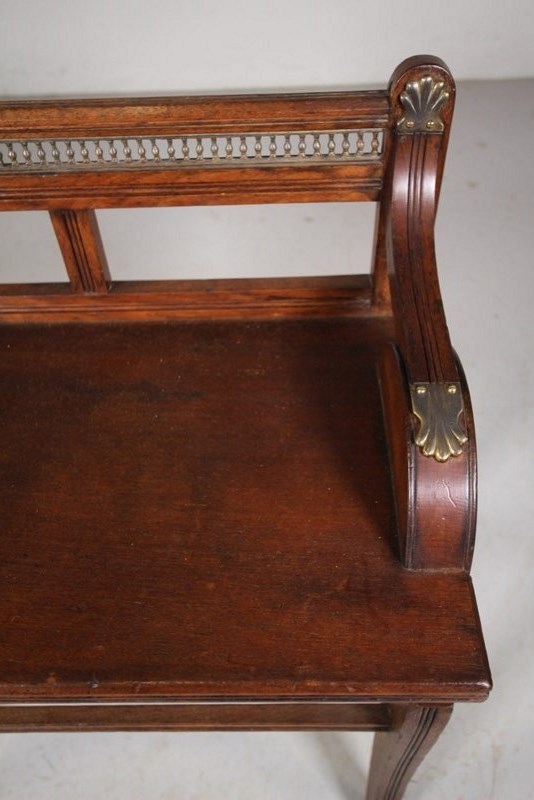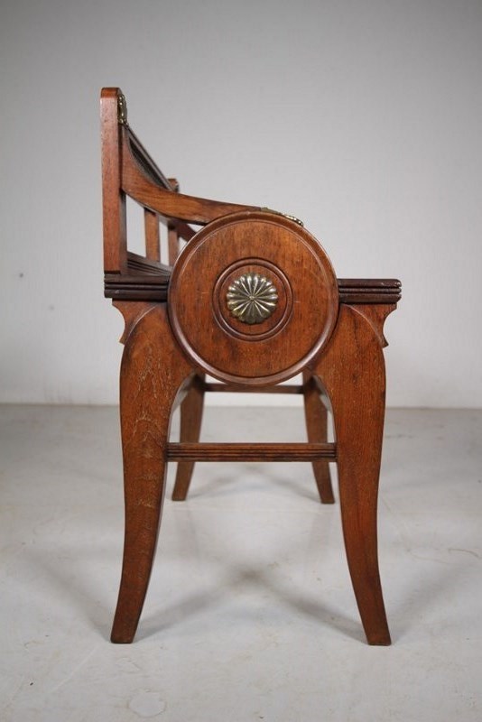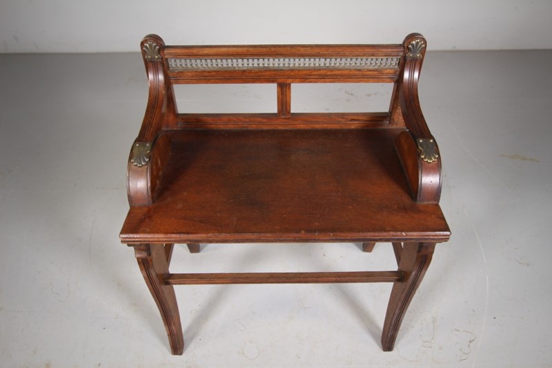 A superb quality English antique window seat /bench by JAS Shoolbred in 1890. This example is beautifully made in solid walnut with decorative brass mounts. In excellent, original and strong condition, has the Shoolbred makers kite mark on the back. Stands very well on sabre front legs which are joined by stretchers. We also have another in oak.